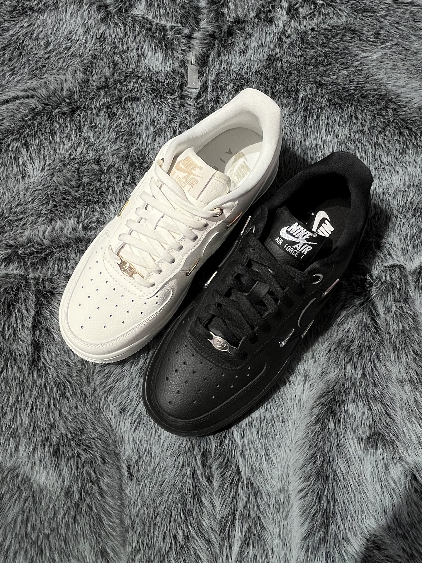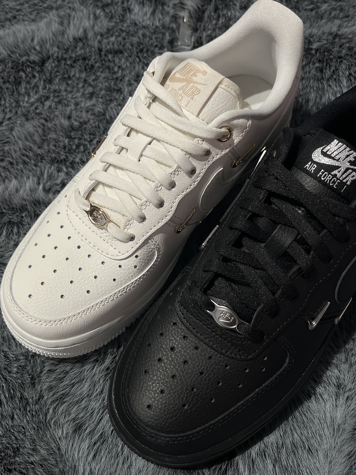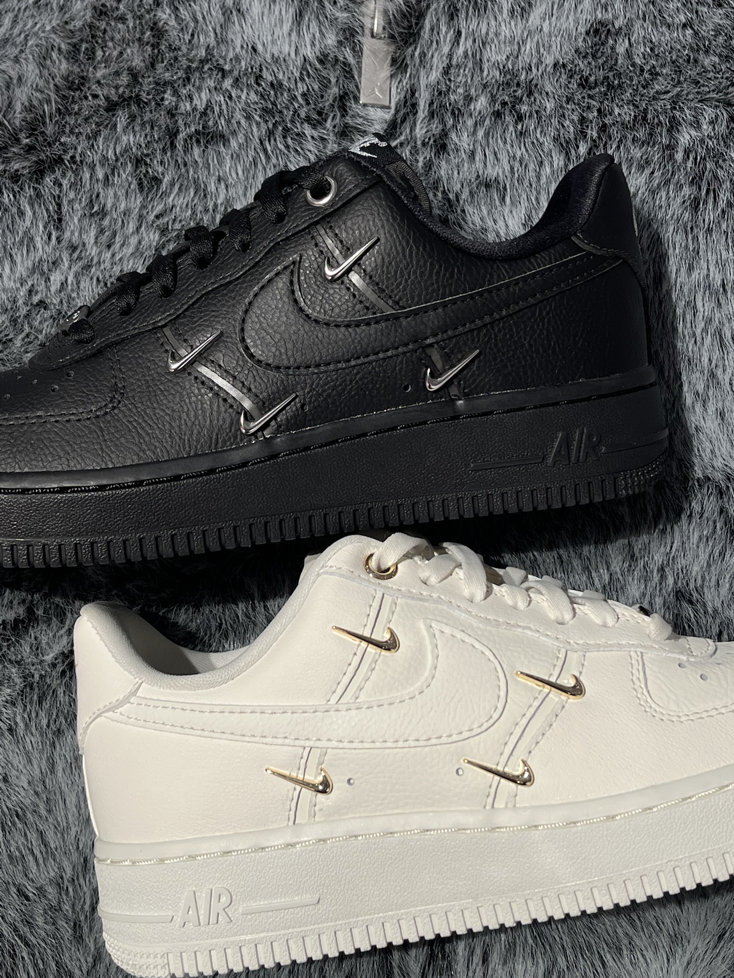 两双四钩空军,黑白两色放在一起,简单对比,给选择困难的姐妹们一个参考 首先是这双米白,颜色不是死白,是带复古调的米白,金色小勾是点睛之笔,整体温柔又有高级感 其次是这双纯黑AF1,纯粹的“黑武士”风格,银色Swoosh增添精致感,上脚就是酷女孩 两双都是近3CM的厚底,显高又好搭~鞋面同样是柔软的荔枝纹皮革,脚感会比纯白AF1舒适不少 那么这两双板鞋,姐妹们会为哪双心动呢? #板鞋控DNA动...