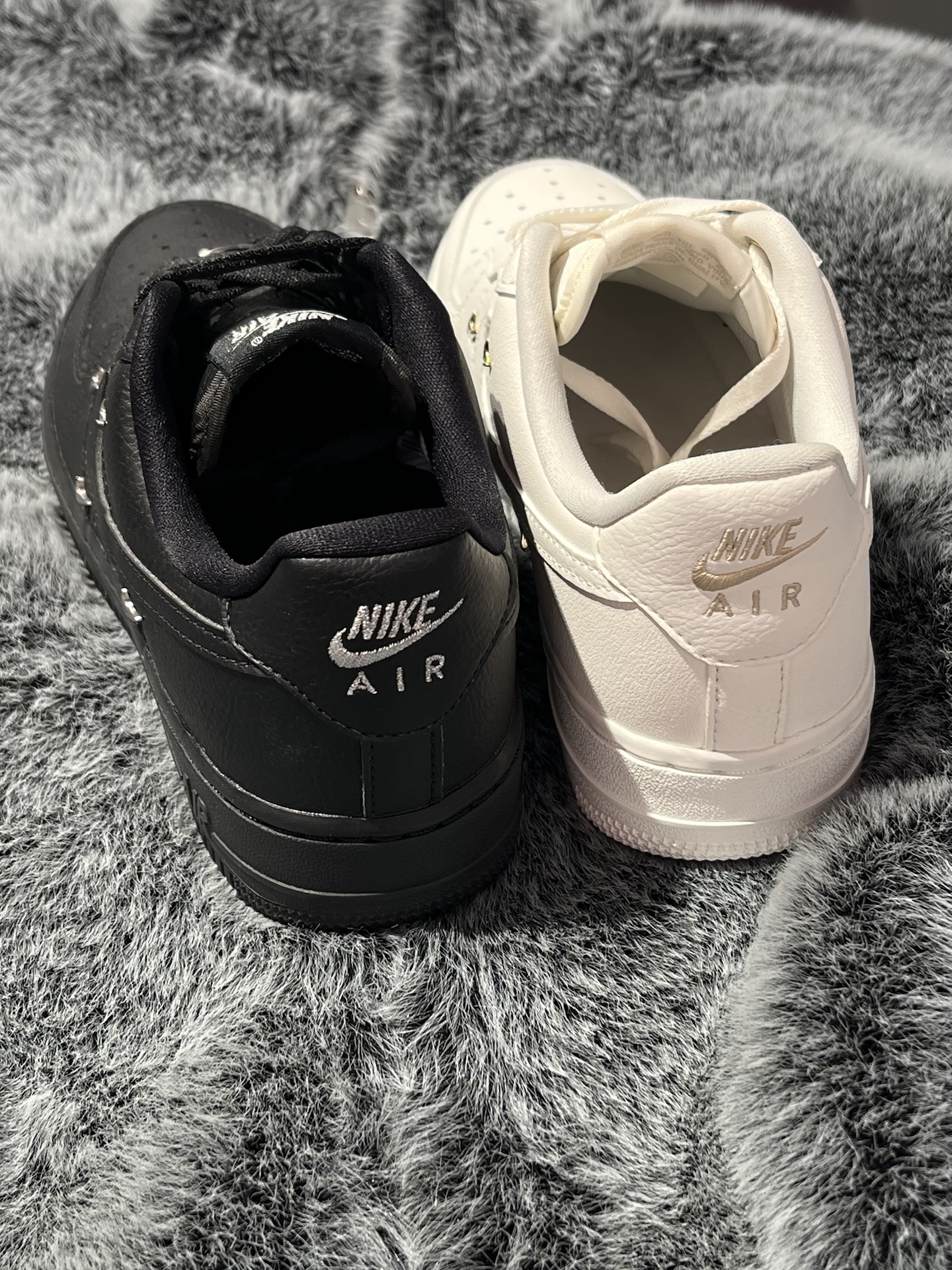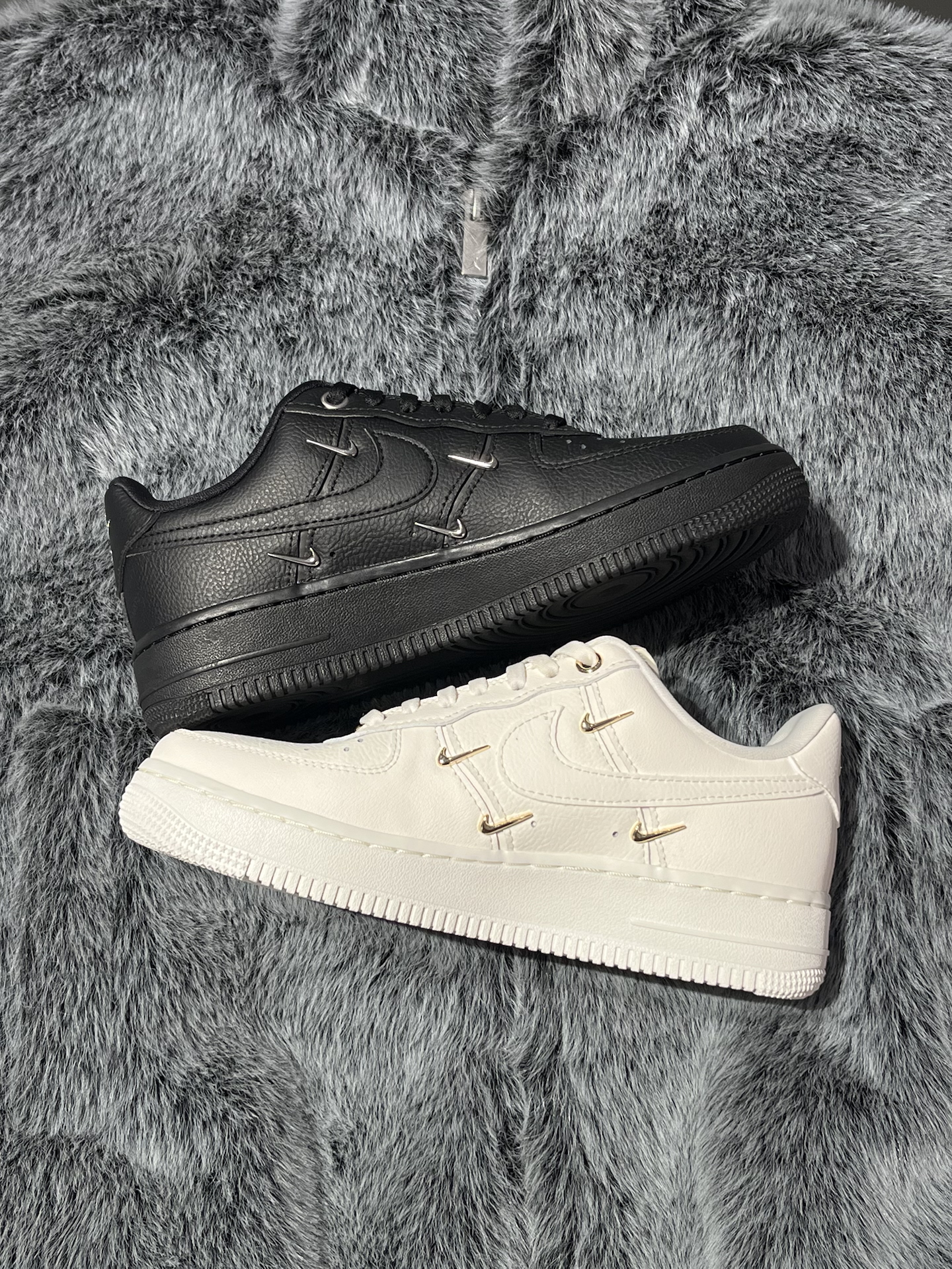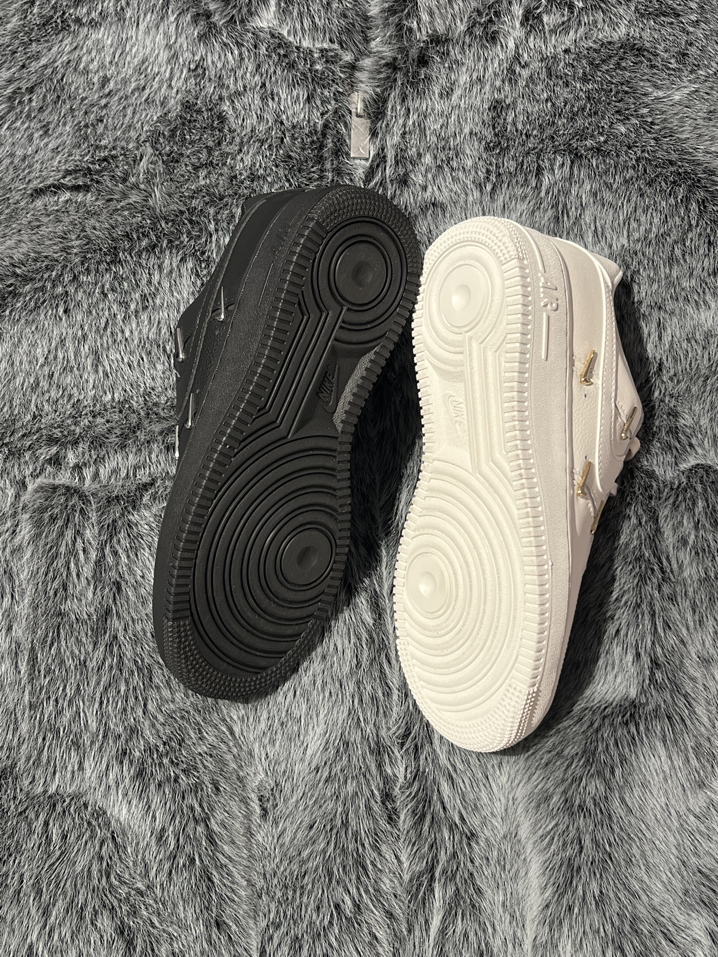 两双四钩空军,黑白两色放在一起,简单对比,给选择困难的姐妹们一个参考 首先是这双米白,颜色不是死白,是带复古调的米白,金色小勾是点睛之笔,整体温柔又有高级感 其次是这双纯黑AF1,纯粹的“黑武士”风格,银色Swoosh增添精致感,上脚就是酷女孩 两双都是近3CM的厚底,显高又好搭~鞋面同样是柔软的荔枝纹皮革,脚感会比纯白AF1舒适不少 那么这两双板鞋,姐妹们会为哪双心动呢? #板鞋控DNA动...