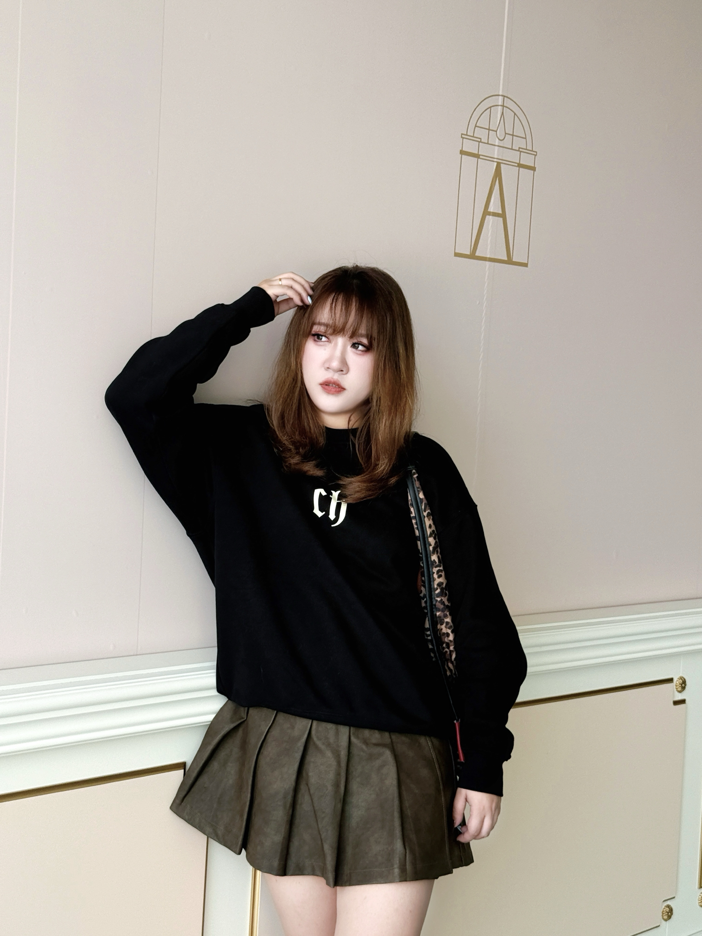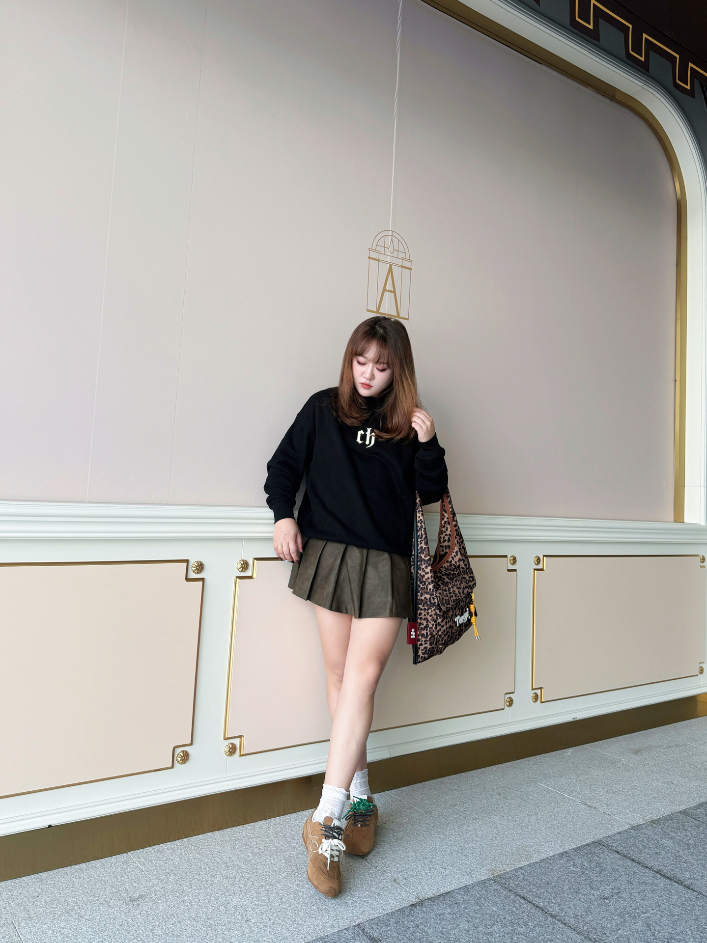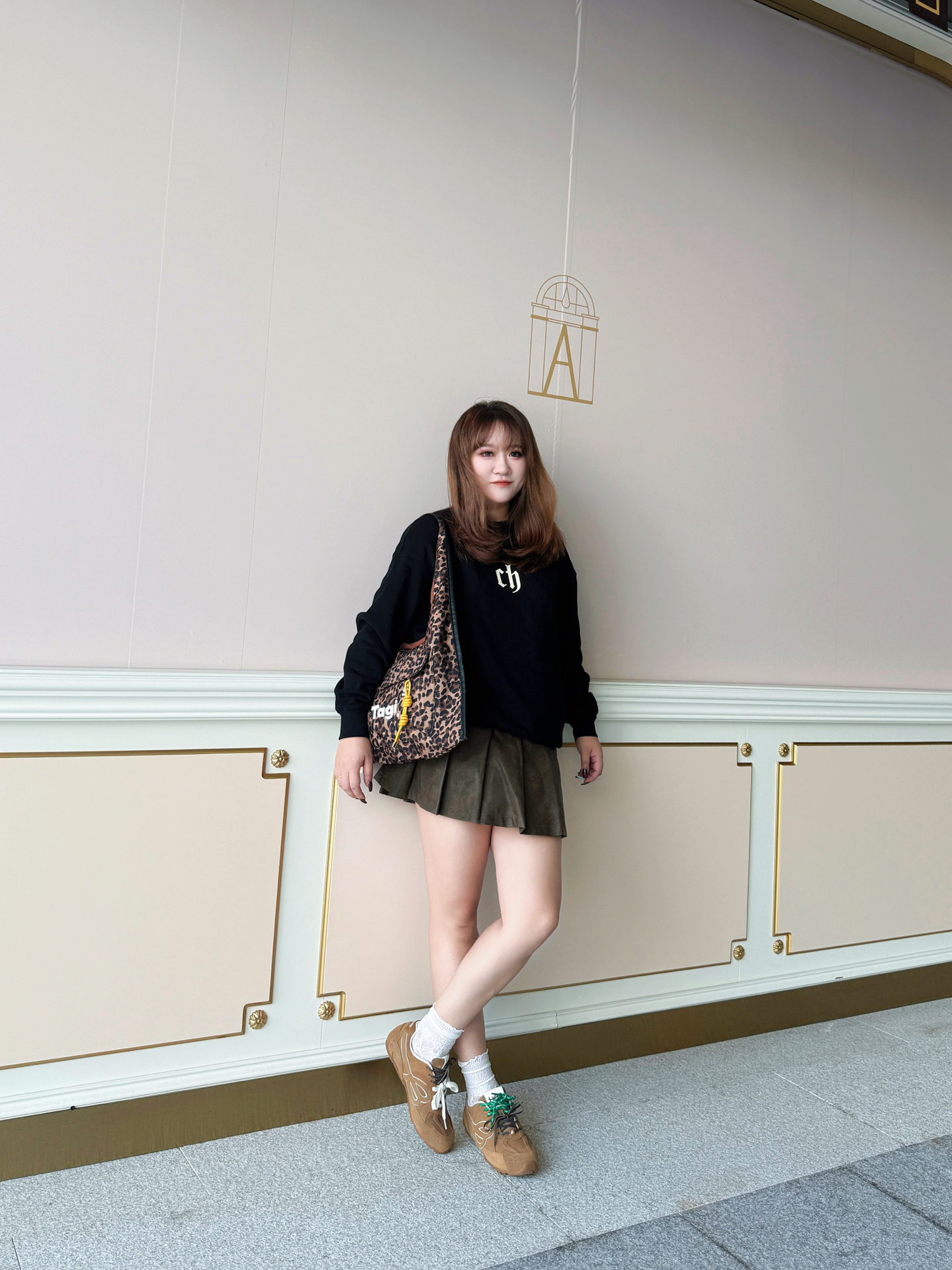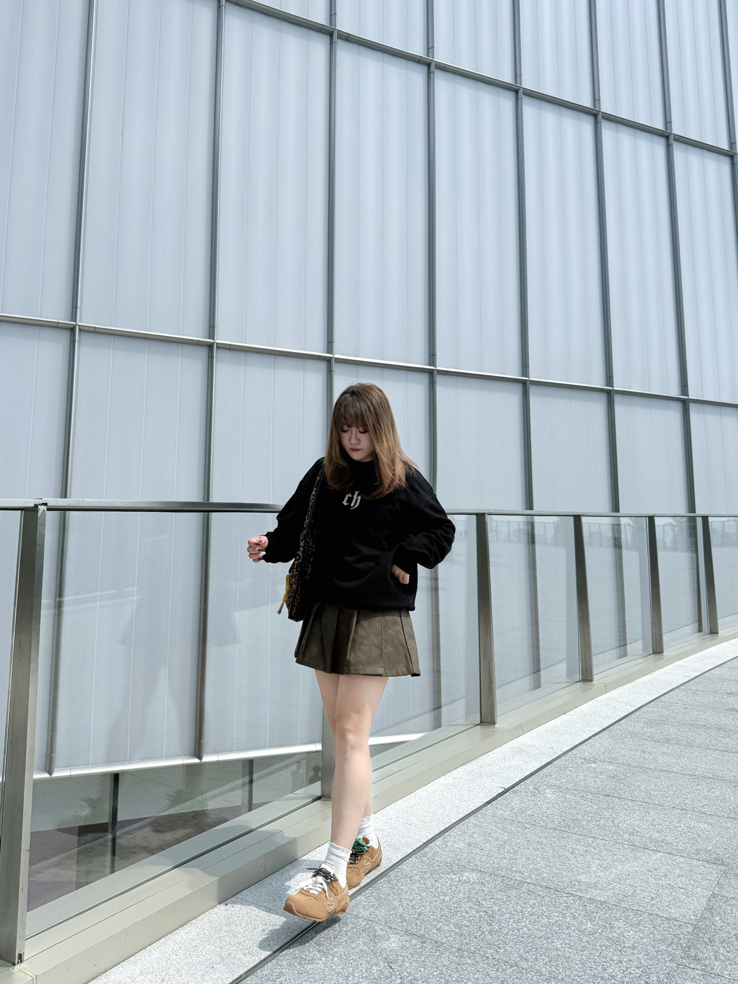 攥着半凉的热奶茶晃到商场外 金色线条装饰的墙前被风掀起卫衣下摆时 这套「黑棕白三重奏」就是秋天的味道~ / 👚 上身:懒人也能穿的「高级感公式」 这件黑卫衣是衣柜里的「万能底色」! 宽松版型裹住小肉感肩膀 胸前小字母像撒了把细碎星光 不扎眼却悄悄提气色~ 下摆自然垂坠 配百褶裙时故意留了两指宽松度 藏住腰侧小赘肉还不显臃肿~ 👗 下装:百褶裙的「显腿魔法」 棕色百褶裙是我秋日的「腿精开关」! A...