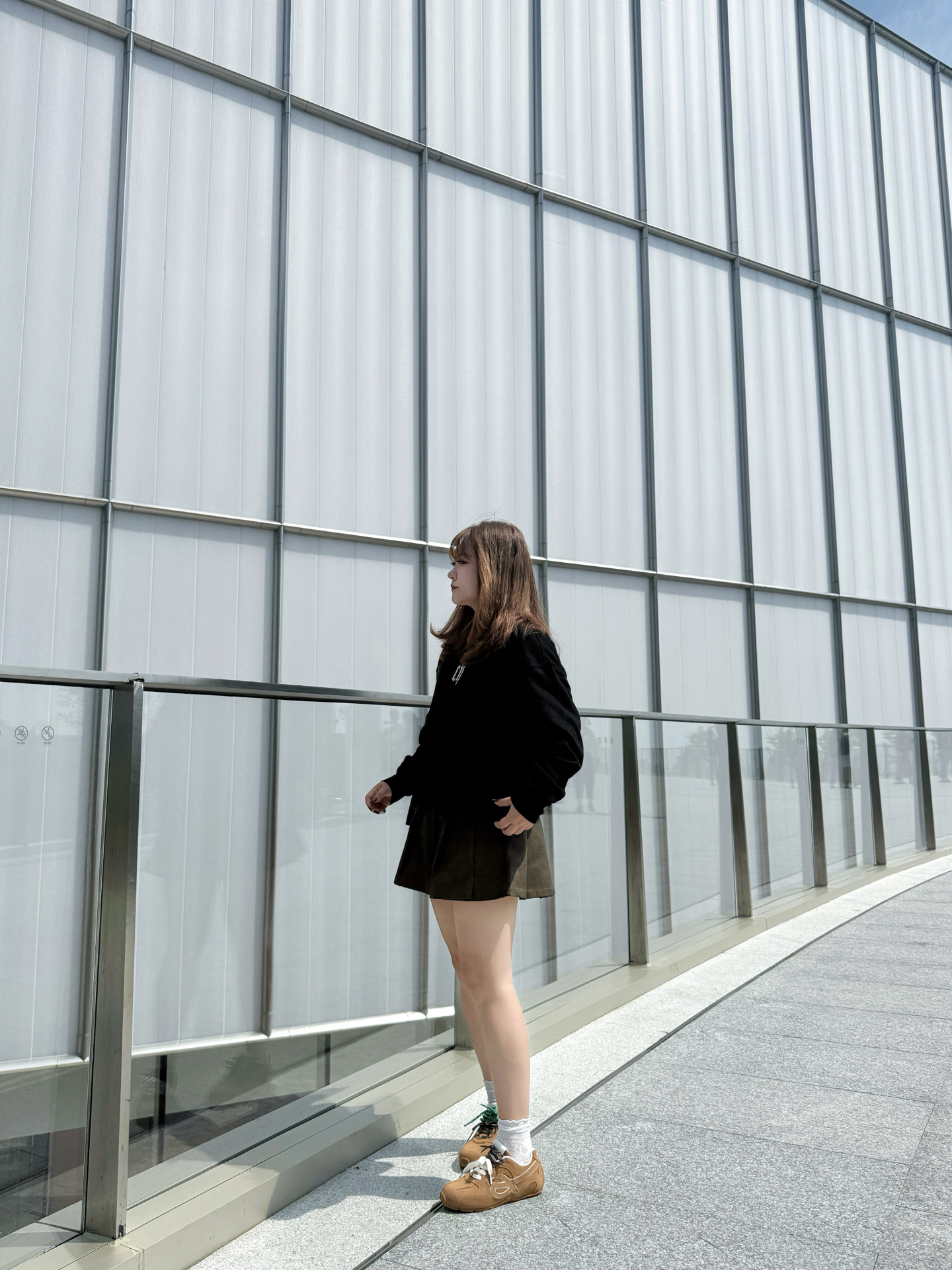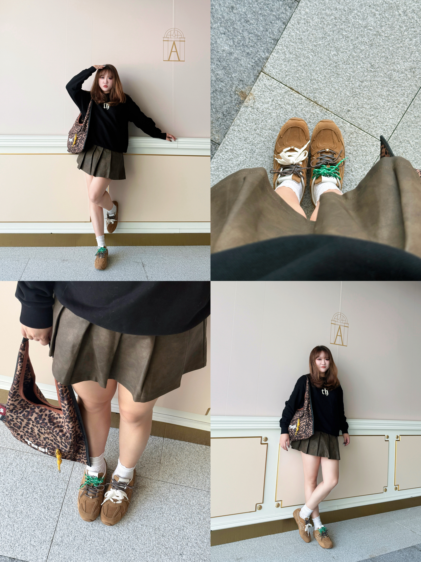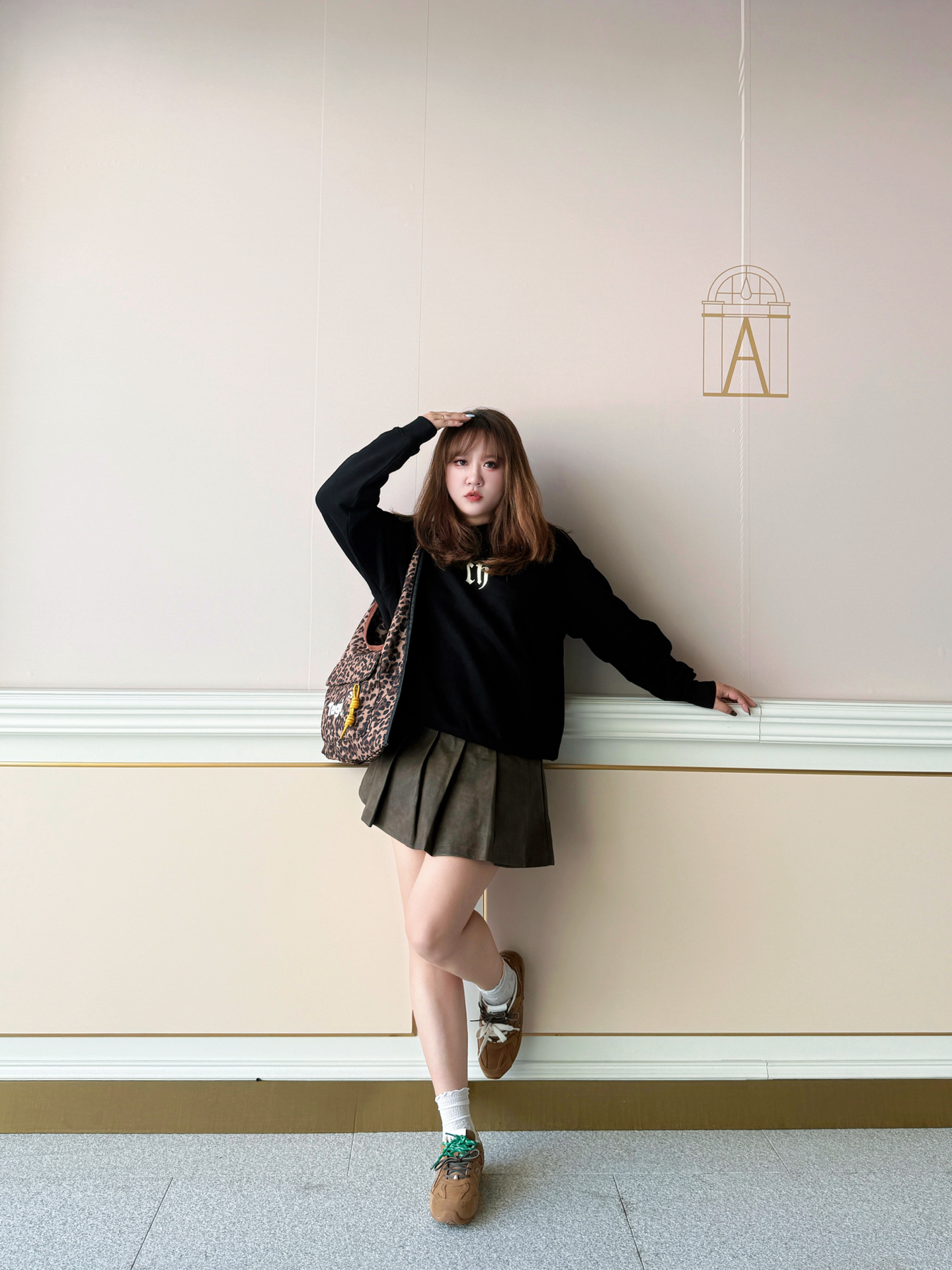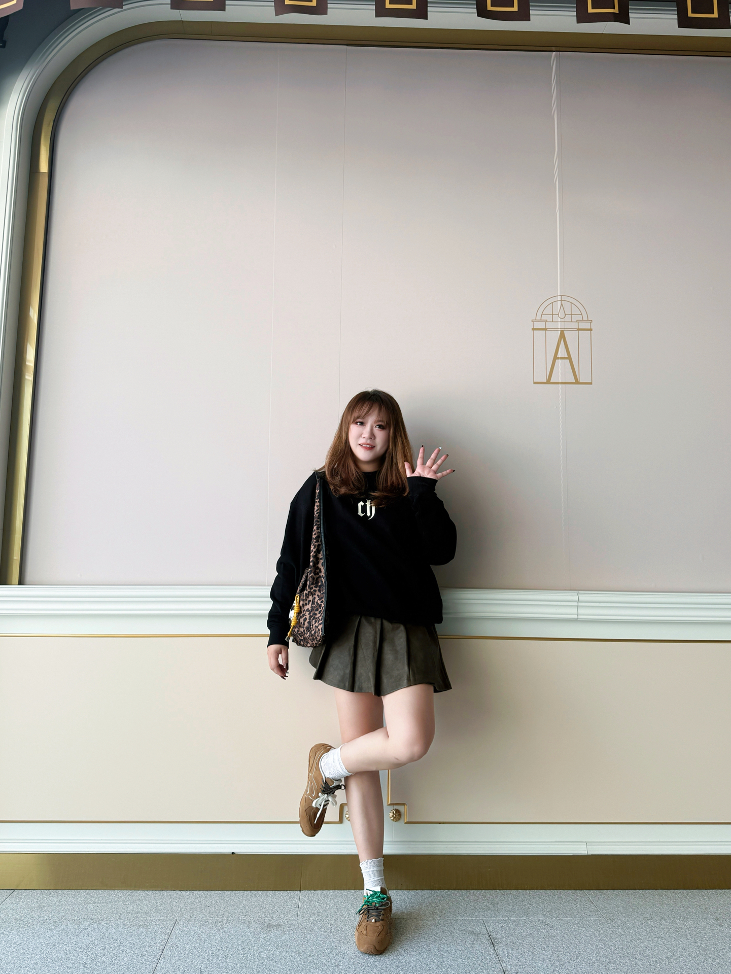 攥着半凉的热奶茶晃到商场外 金色线条装饰的墙前被风掀起卫衣下摆时 这套「黑棕白三重奏」就是秋天的味道~ / 👚 上身:懒人也能穿的「高级感公式」 这件黑卫衣是衣柜里的「万能底色」! 宽松版型裹住小肉感肩膀 胸前小字母像撒了把细碎星光 不扎眼却悄悄提气色~ 下摆自然垂坠 配百褶裙时故意留了两指宽松度 藏住腰侧小赘肉还不显臃肿~ 👗 下装:百褶裙的「显腿魔法」 棕色百褶裙是我秋日的「腿精开关」! A...