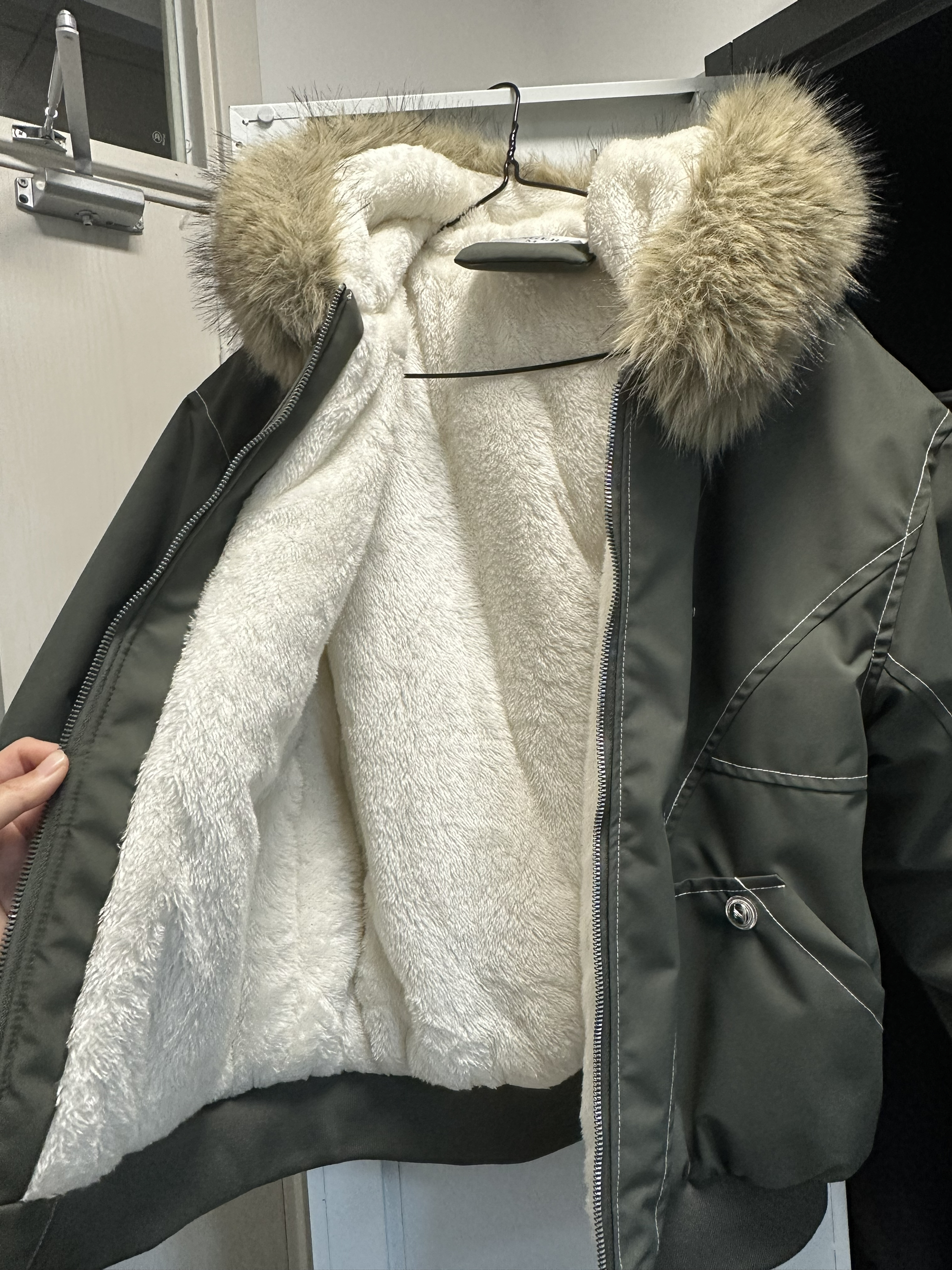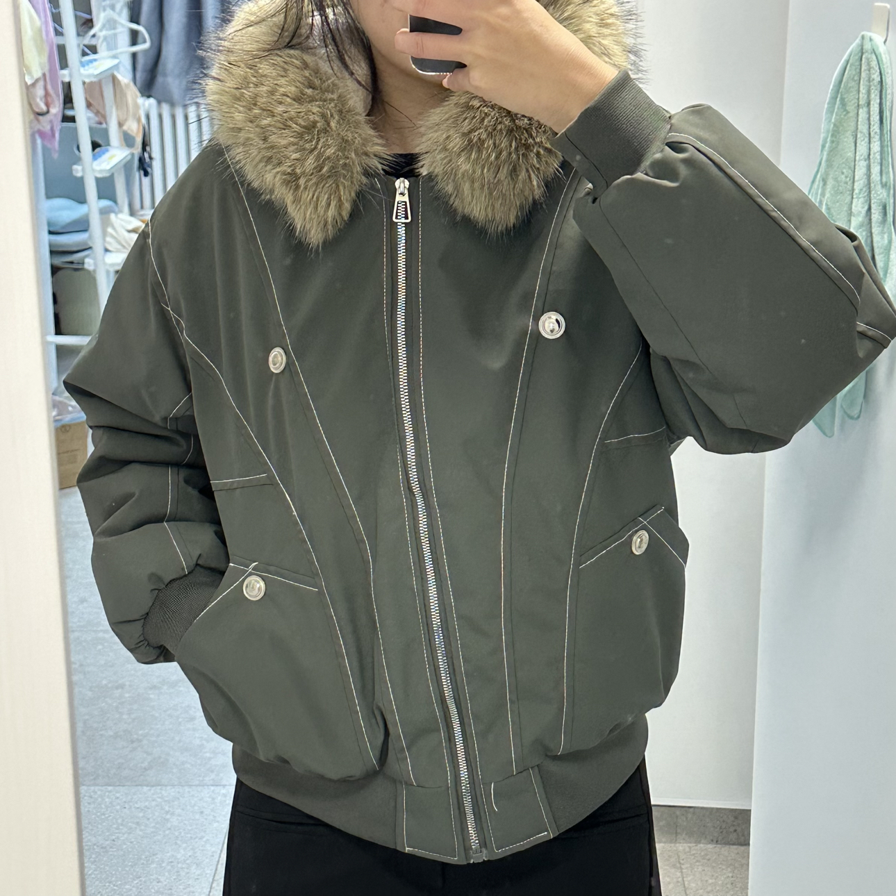 你们冬天喜欢穿短款还是长款外套呀? 这件短款外套太宝藏啦!!!里面全是绒,穿上特别舒服这种颜色也是第一次尝试,属于低饱和的,不是鲜艳的绿色,我很喜欢!!!面料和派克服差不多,还挺防水推荐推荐!!!搭配牛仔裤显休闲、西装裤显利落,总之都好看!