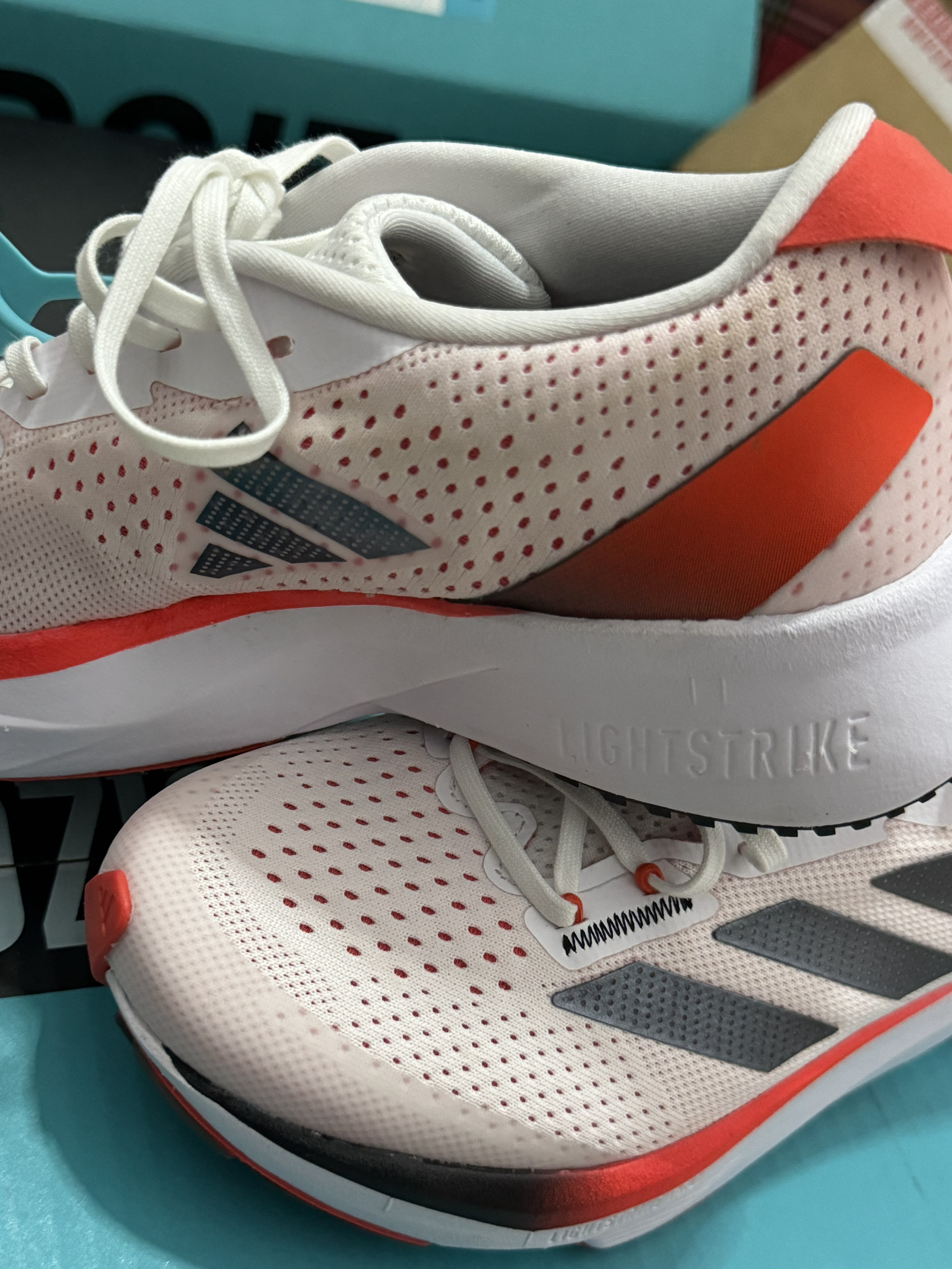 1.鞋子的包裹性很好,跑步时脚部非常稳定,保护性很强。 2.鞋子的重量很轻,走路时几乎感觉不到负担,特别适合跑步。 3.鞋带设计合理,系紧后不容易松脱,非常方便。 4.透气性很好,夏天穿也不会觉得闷脚,非常满意。 5.颜色和图片上完全一致,没有色差,非常漂亮。