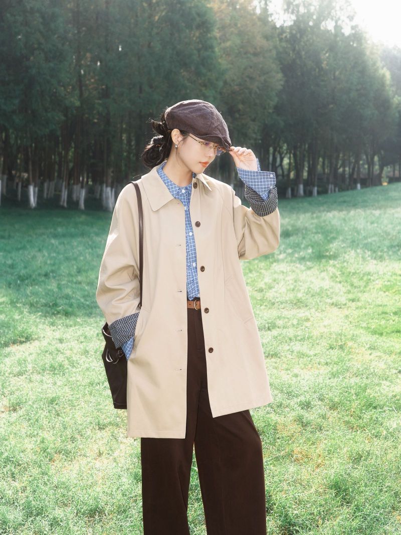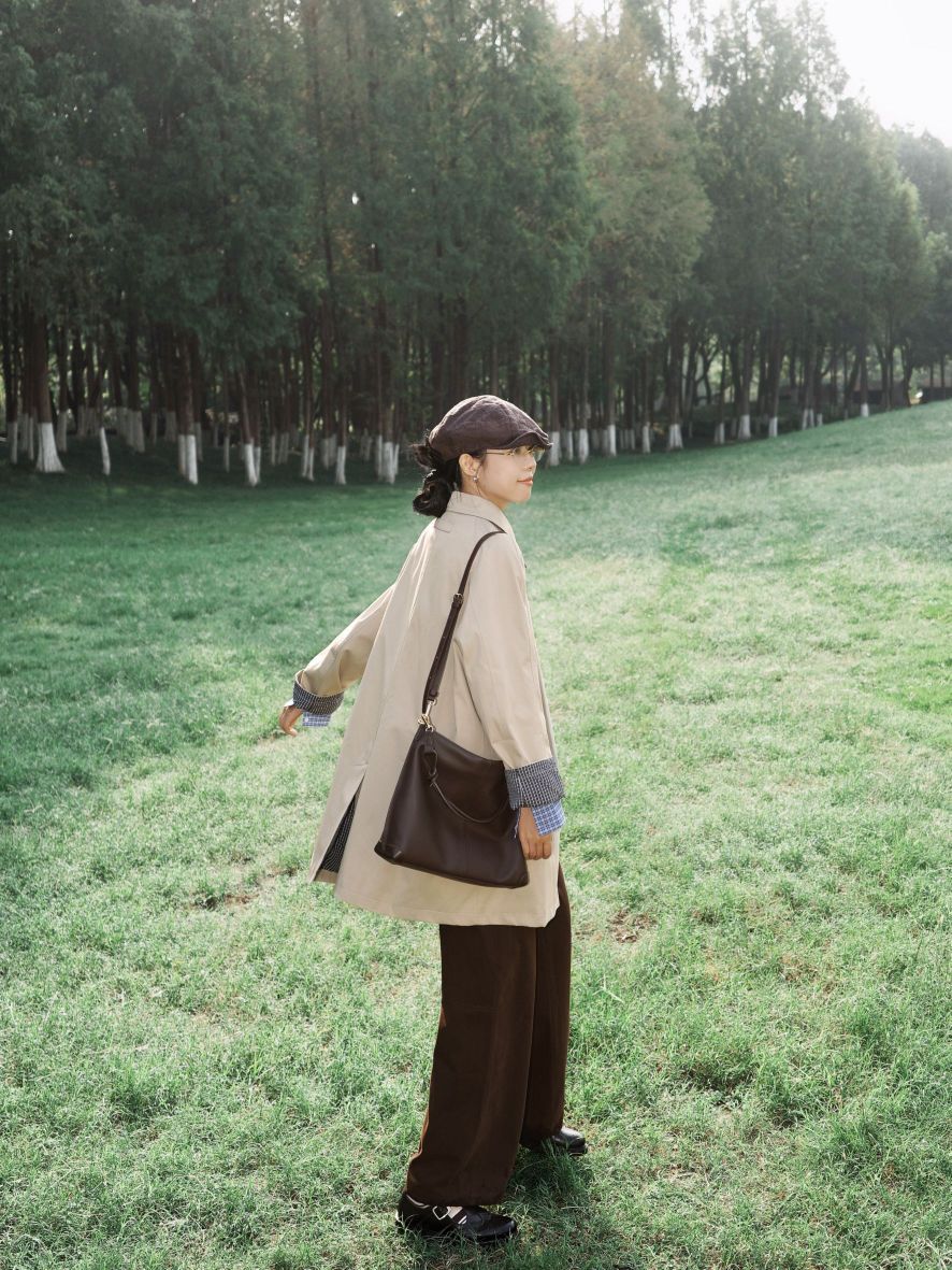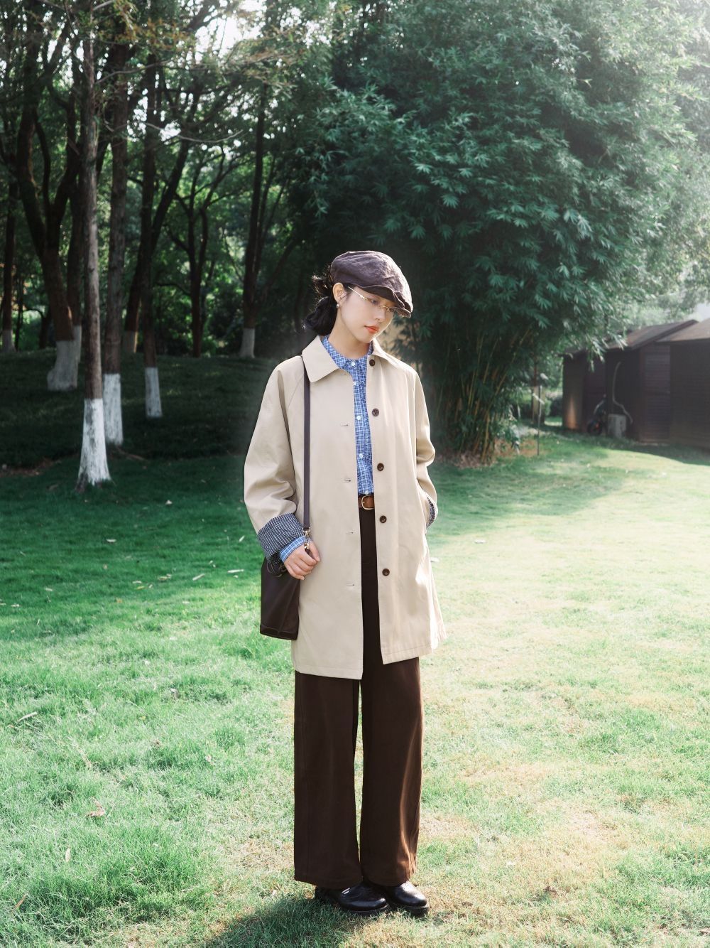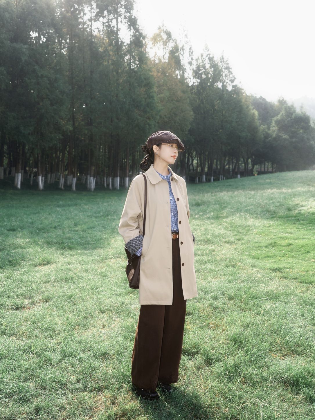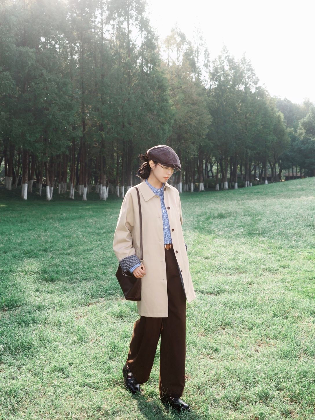 这套复古穿搭简直是秋日出游的天选搭配! 卡其风衣一上身,复古氛围感直接拉满~里面叠个蓝格衬衫,层次感这不就来了嘛!袖口露出的格纹边边,搭配棕色阔腿裤,显腿长还舒服,再配上报童帽和腋下包,就是复古电影的既视感~ 大地色+蓝格的配色,就像秋日落叶邂逅蓝天,和谐又有亮点🍂