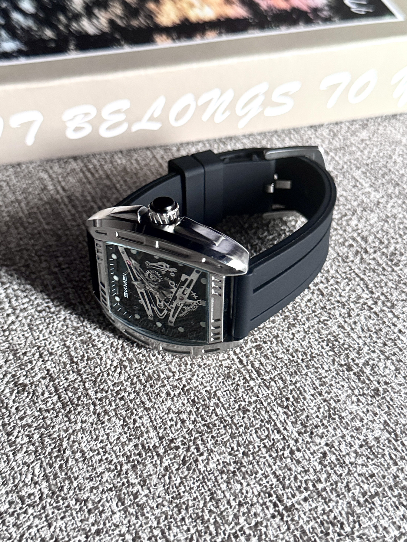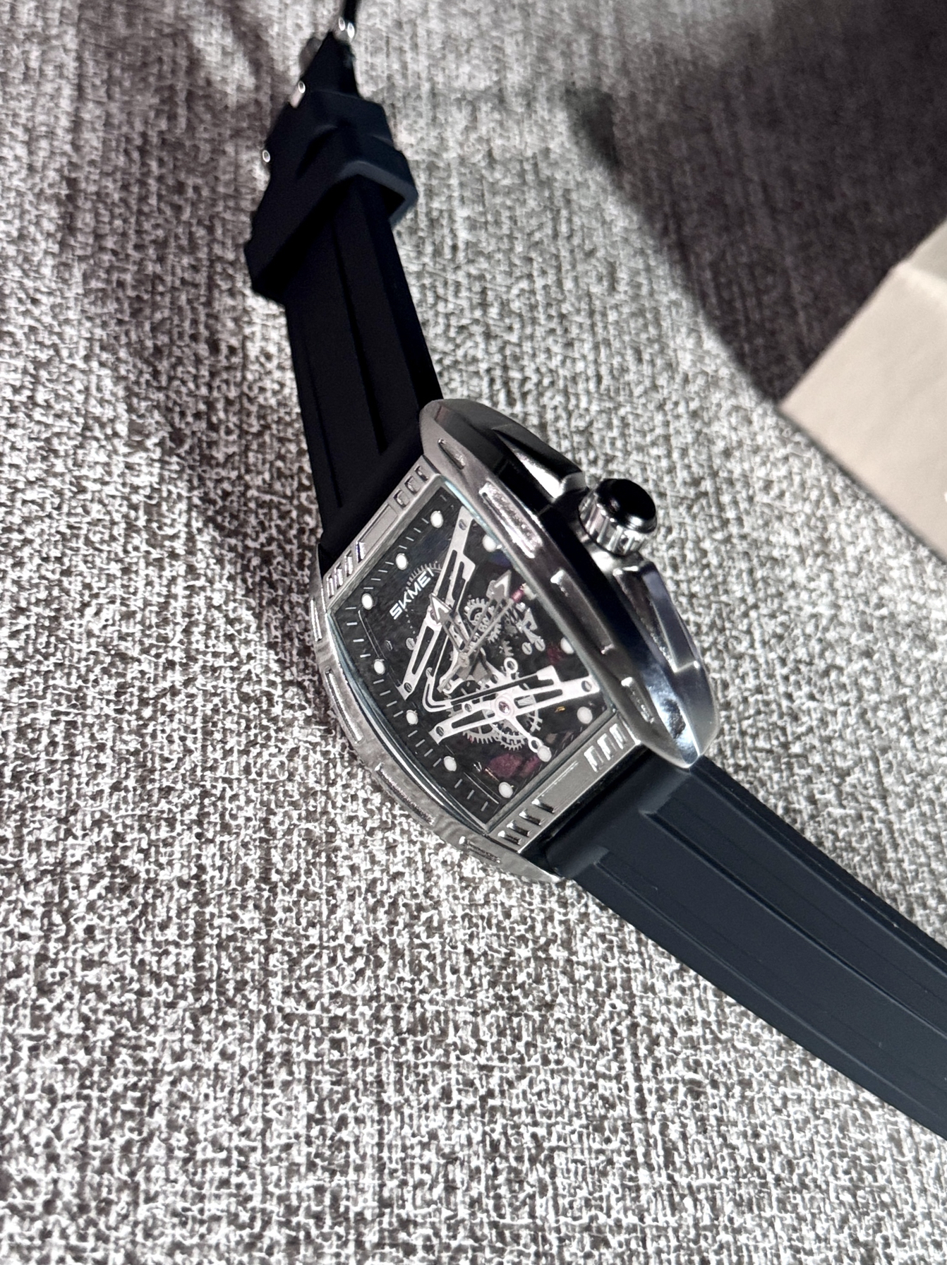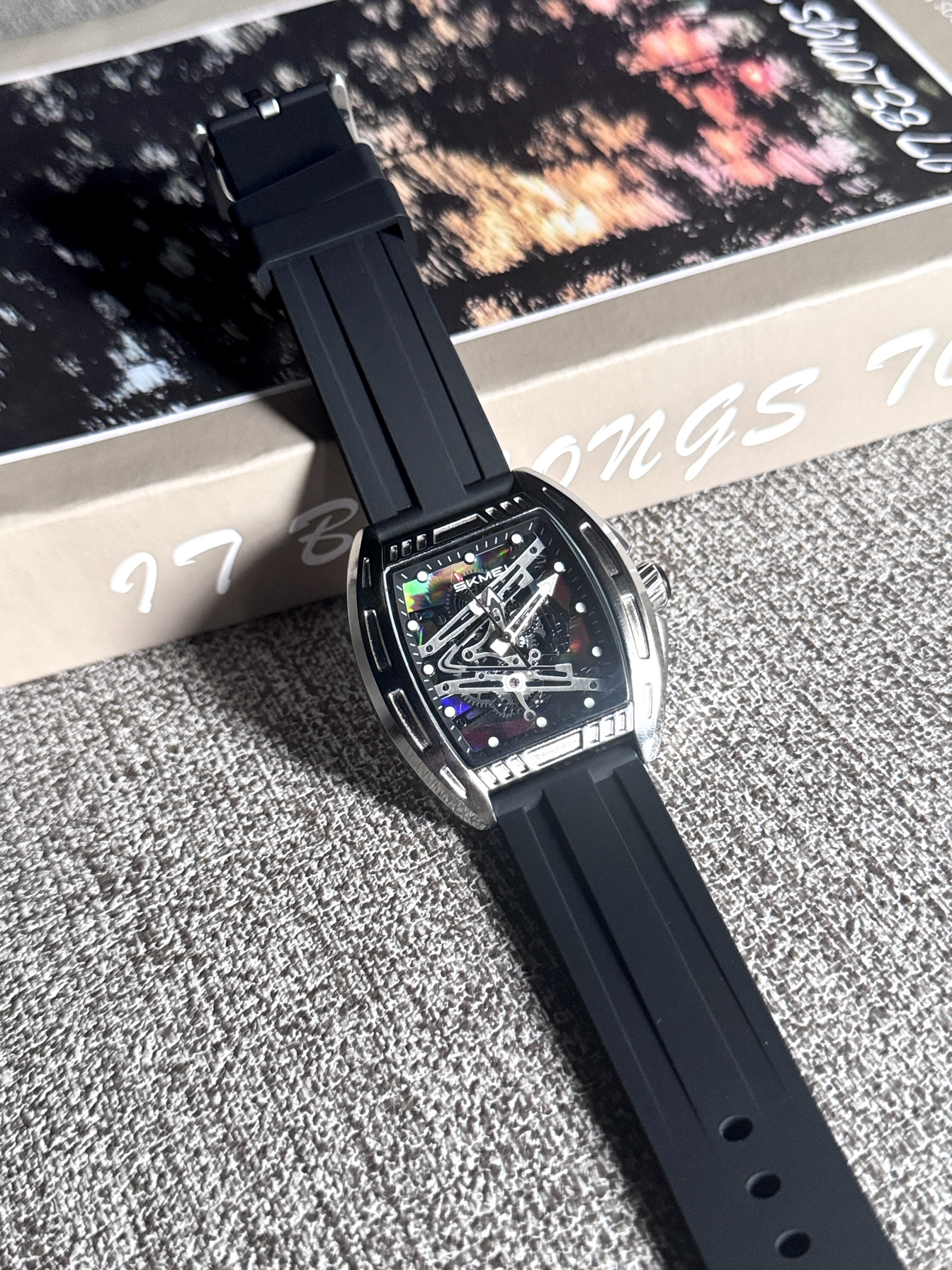 本篇笔记关联了SKMEI/时刻美 时尚镂空酒桶型潮流机械风陀飞轮夜光防水初高中石英男士手表 银壳黑带等商品,为用户提供真实的使用体验和购买参考。