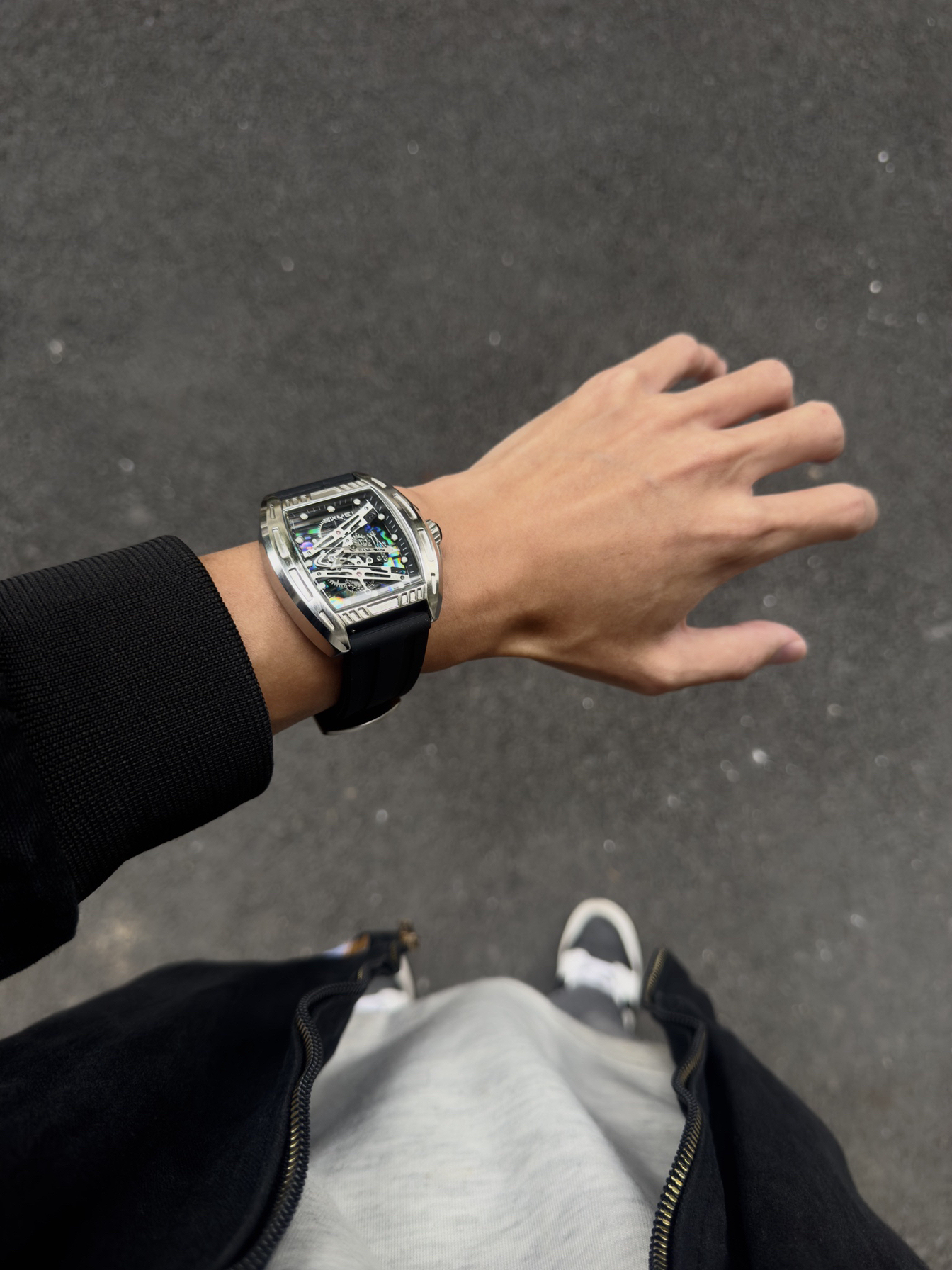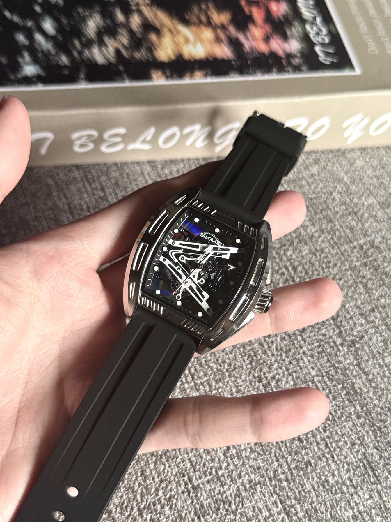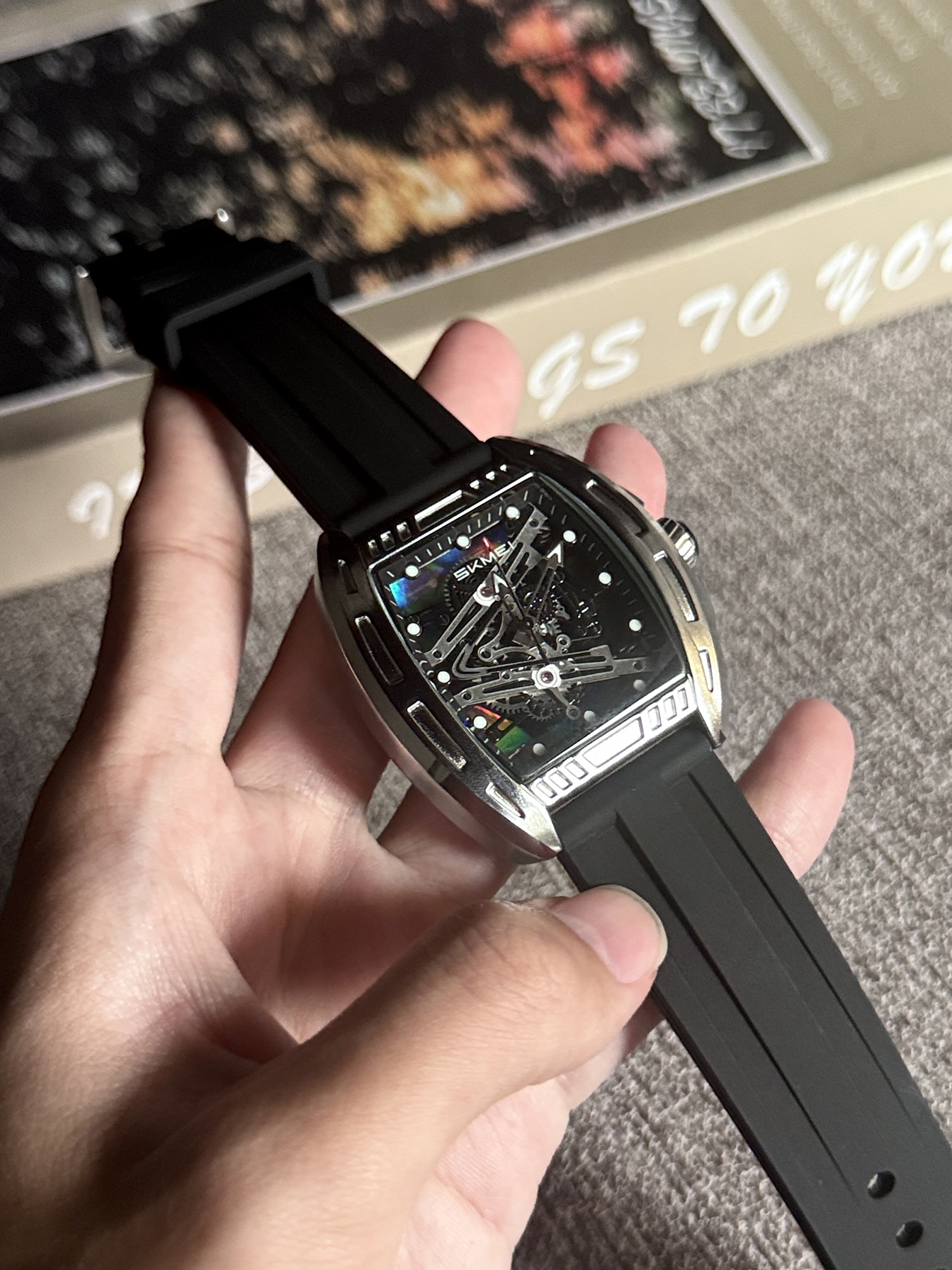说实话 时刻美家的手表上手都很有感觉 今天的这块机械手表就蛮帅的 酒桶型表盘 我超爱的好吧~ 还能看到齿轮⚙️转动的细节 机械感十足 搭配的硅胶表带戴着也蛮舒服的 拍照尊滴很出片~