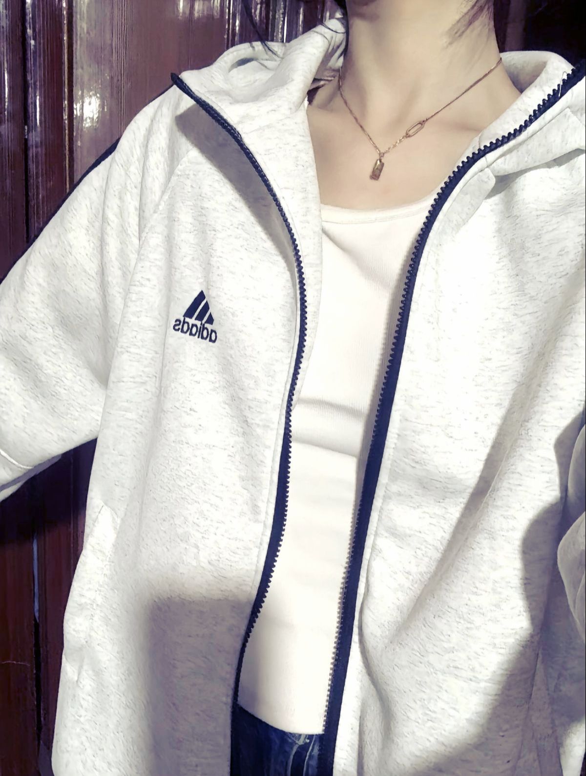 这件阿迪很适合夏天有阳光的时候穿出去,感觉就是青春活力,非常百搭这件白色夹克也太好看了叭‼️ 啊啊啊好喜欢💕