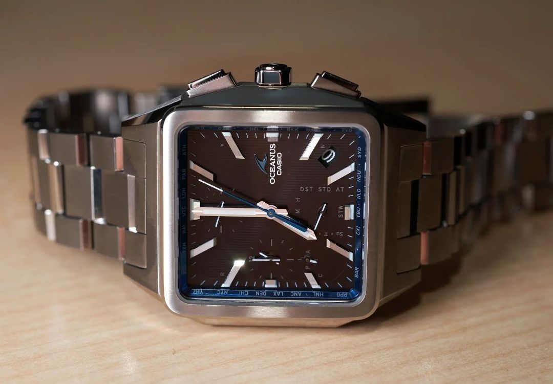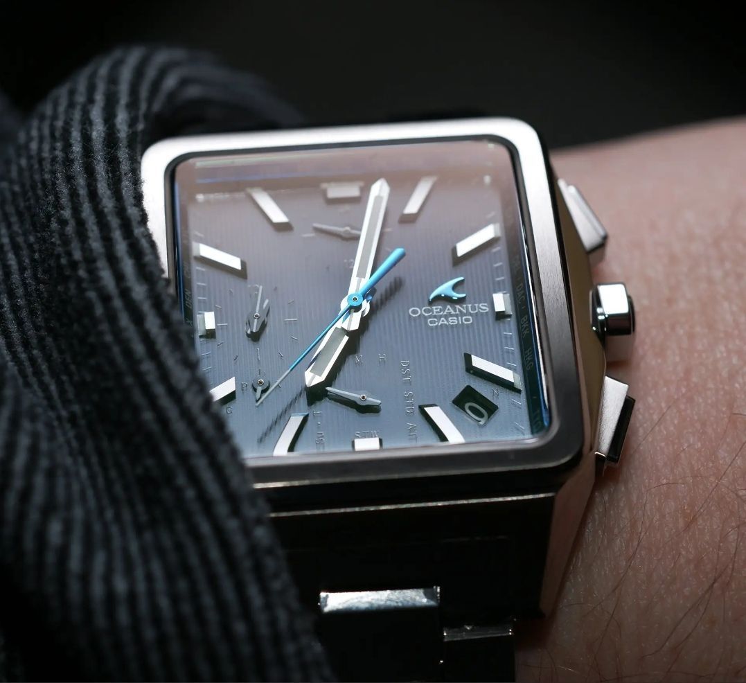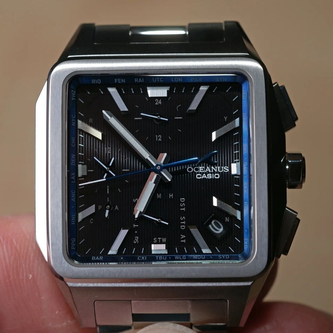 卡西欧oceanus系列的小方块,不过比g-shock系列的小方块更小巧。 整表钛合金材质(碳化钛处理),更加耐磨。 6局电波,可以链接手机蓝牙,非常省心。 如果喜欢商务休闲的款的小方块,这个是首选。