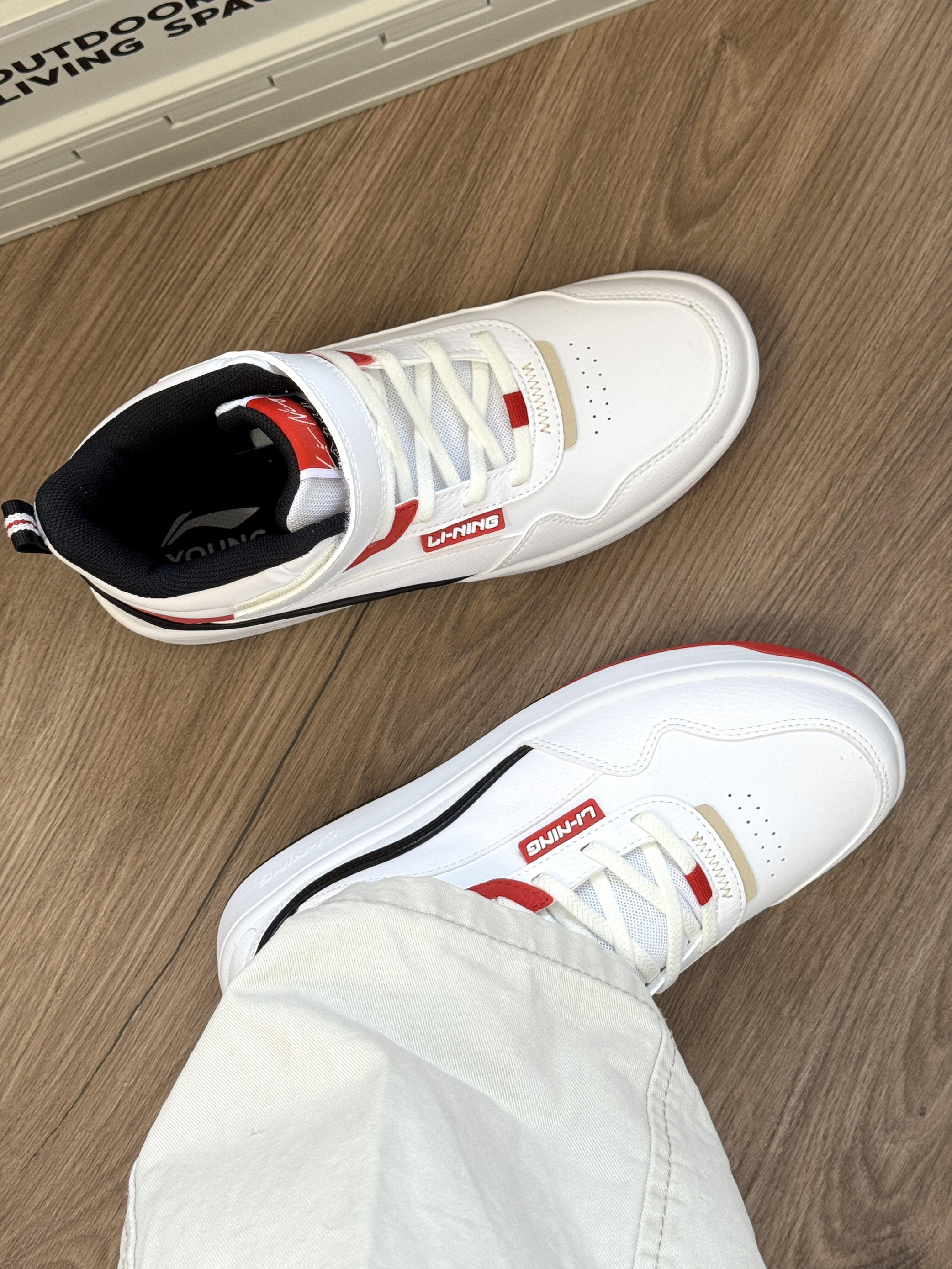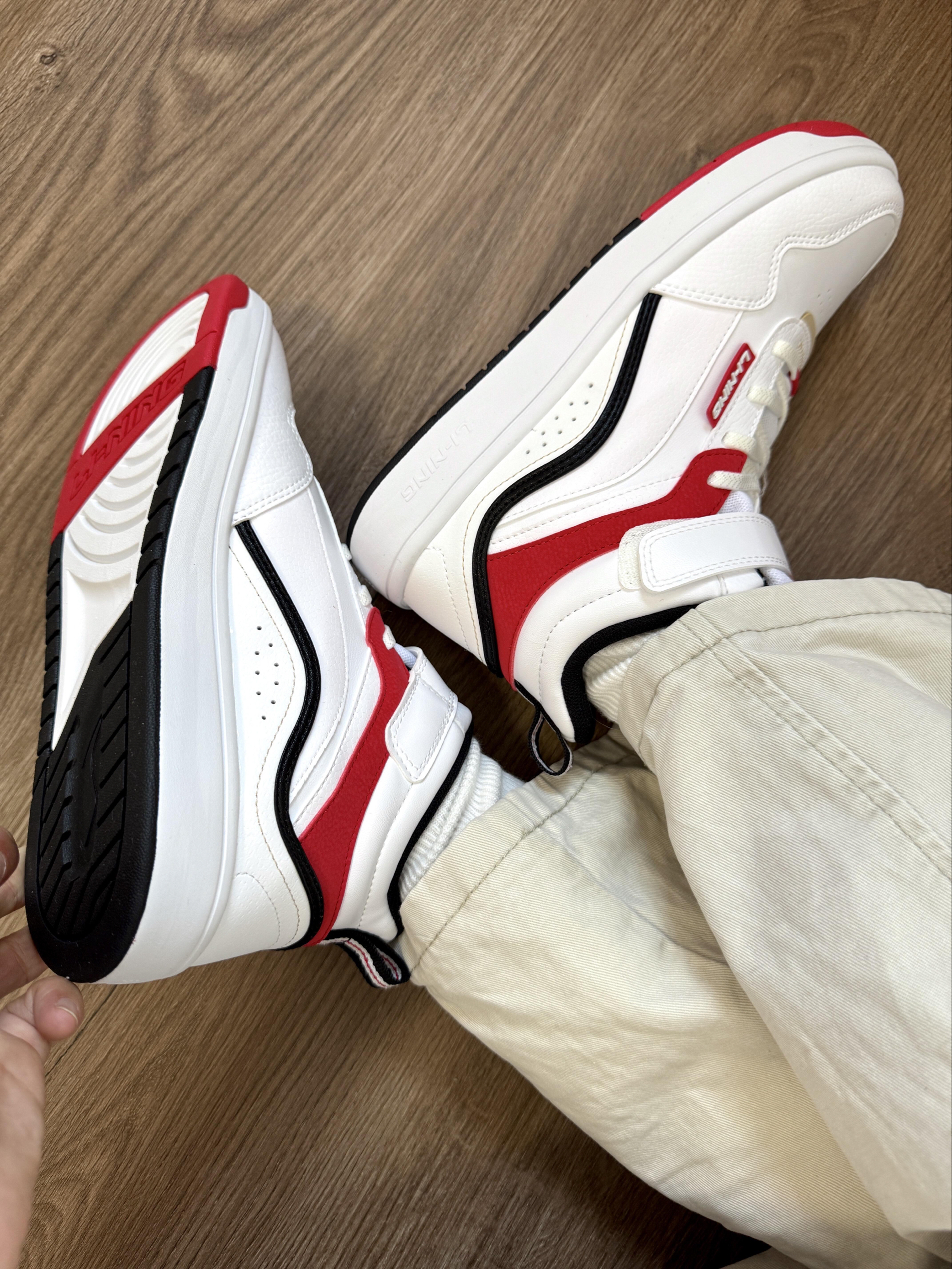 谁懂啊!我刚拆这鞋的快递,楼下修鞋的大叔直接探头:“这鞋是裹了层国旗吧?看着精神得能去走方阵!”——我攥着鞋盒差点把防尘袋扯破! 这鞋是我被“国潮不土”安利盲买的,本来怕红白显俗想转卖,结果上周穿出门直接被堵在便利店要链接:白鞋配红标像踩了团热血,昨天穿它去球场打球,连对手都停脚问“这鞋是不是国家队同款”;魔术贴一粘就稳,跑了一下午快攻,脚都没滑出来,之前买的板鞋穿一次就像踩拖鞋,这双我穿去逛商...