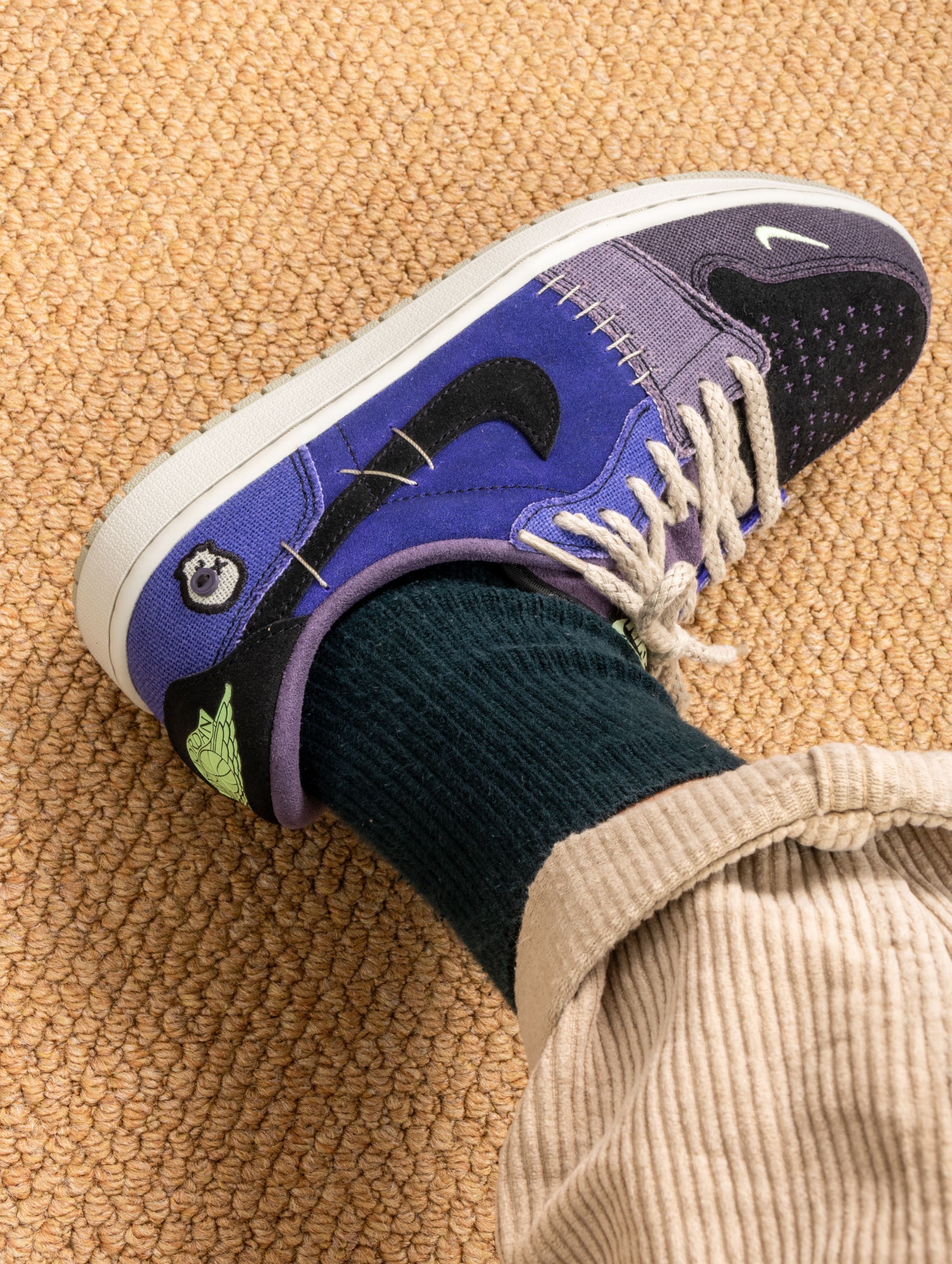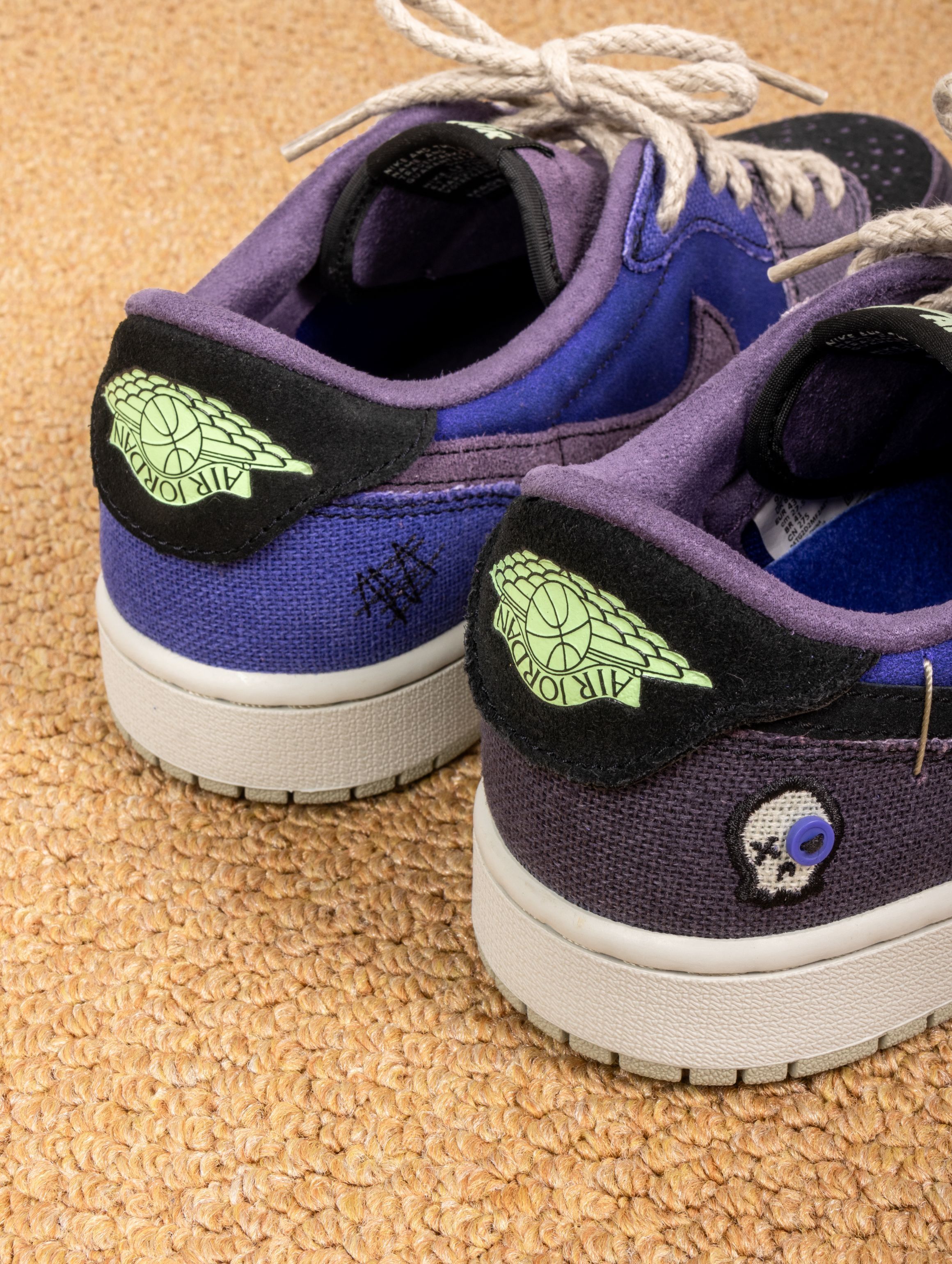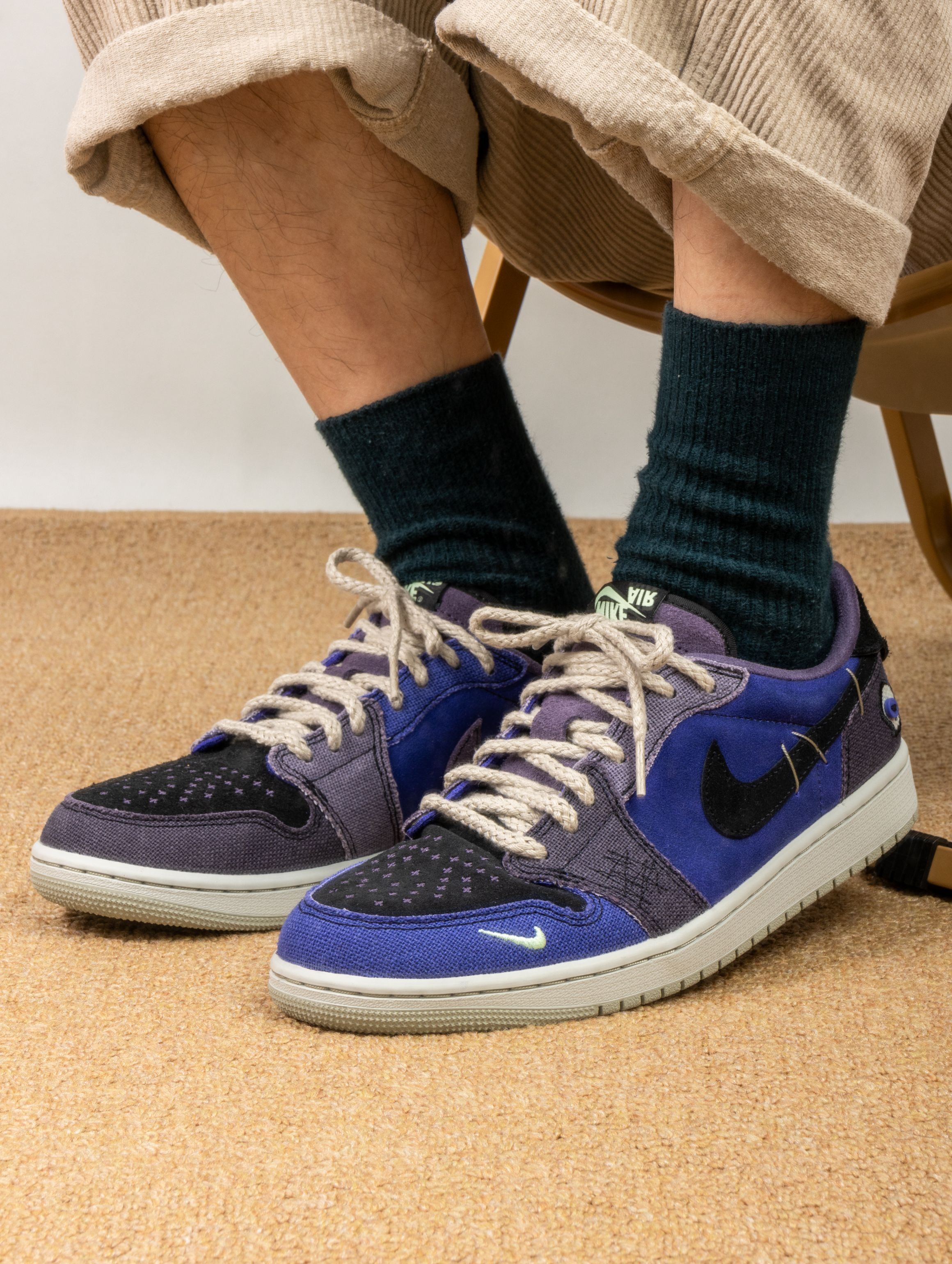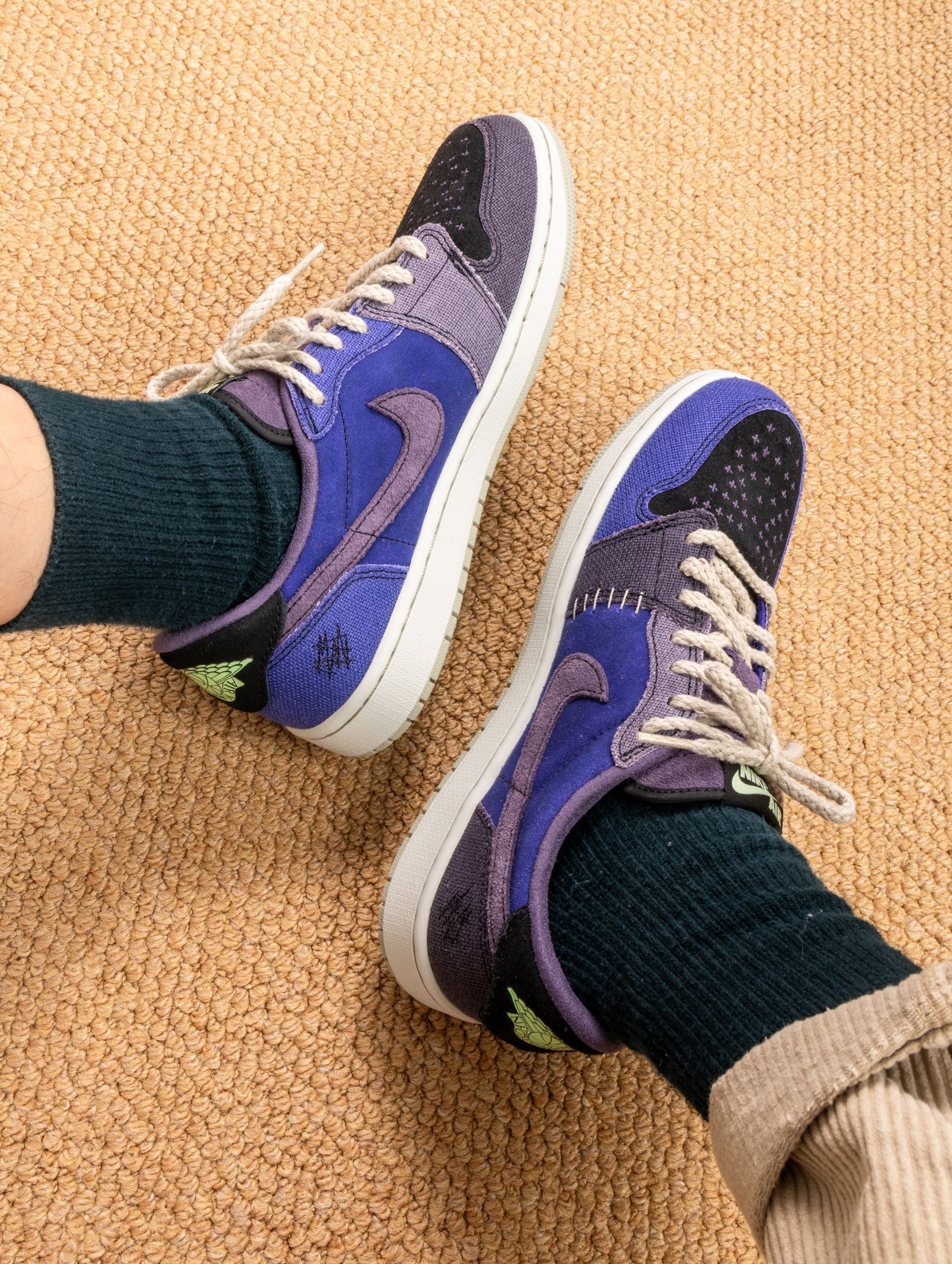 这双鞋的实物真的太适合万圣节了!深邃的紫蓝色麂皮就像暗夜里的魔法,质感高级又应景。上脚第一感觉是包裹性很好,皮质比普通AJ1更柔软,穿着蹦跶整晚都不磨脚。 配黑色卫衣是神秘暗黑风,搭破洞牛仔裤又变身街头魔法师。昨晚穿着去派对,在灯光下鞋面会泛出不同层次的紫色,直接被三个朋友问链接。从万圣节到日常出街都能驾驭,这波入手真的不亏
