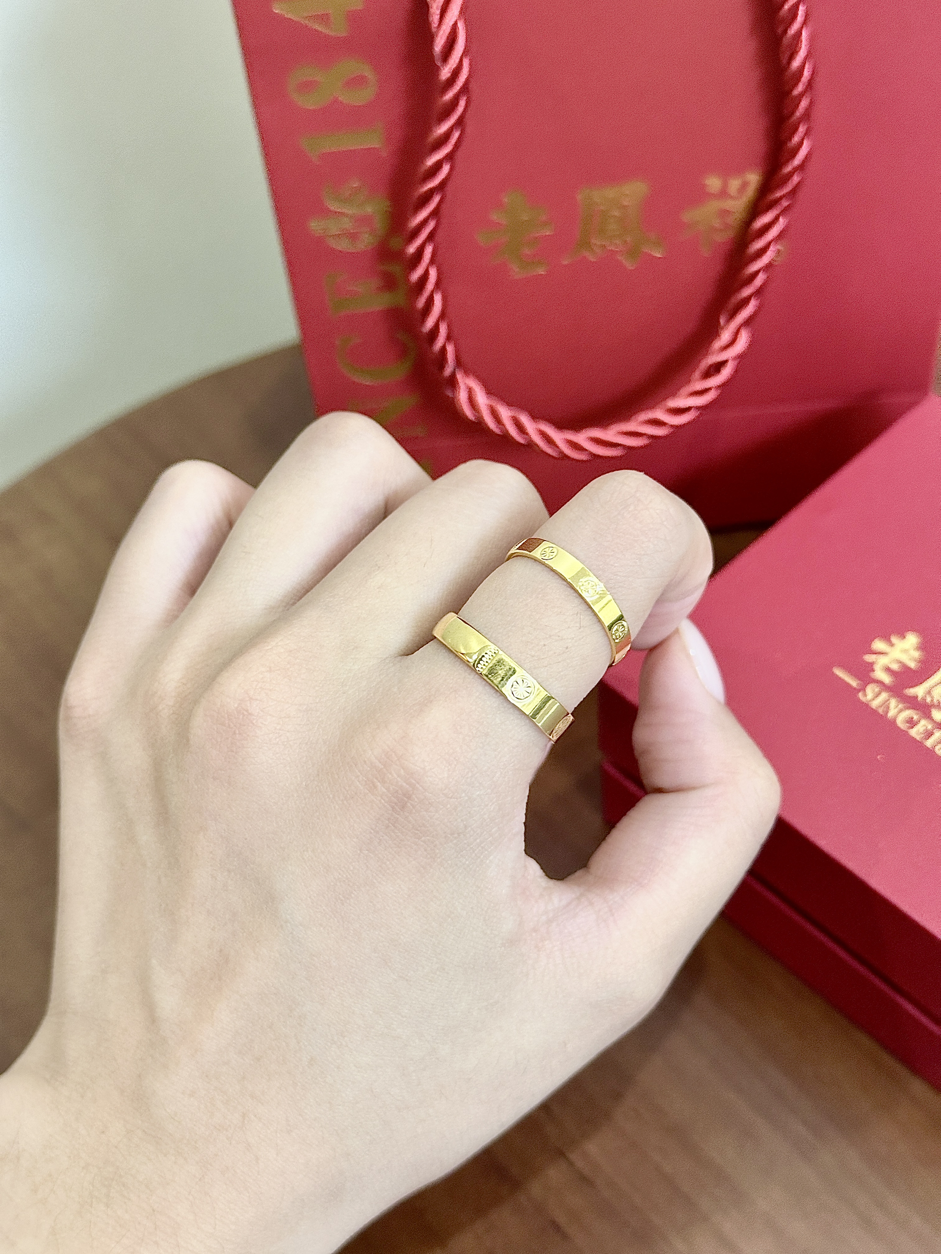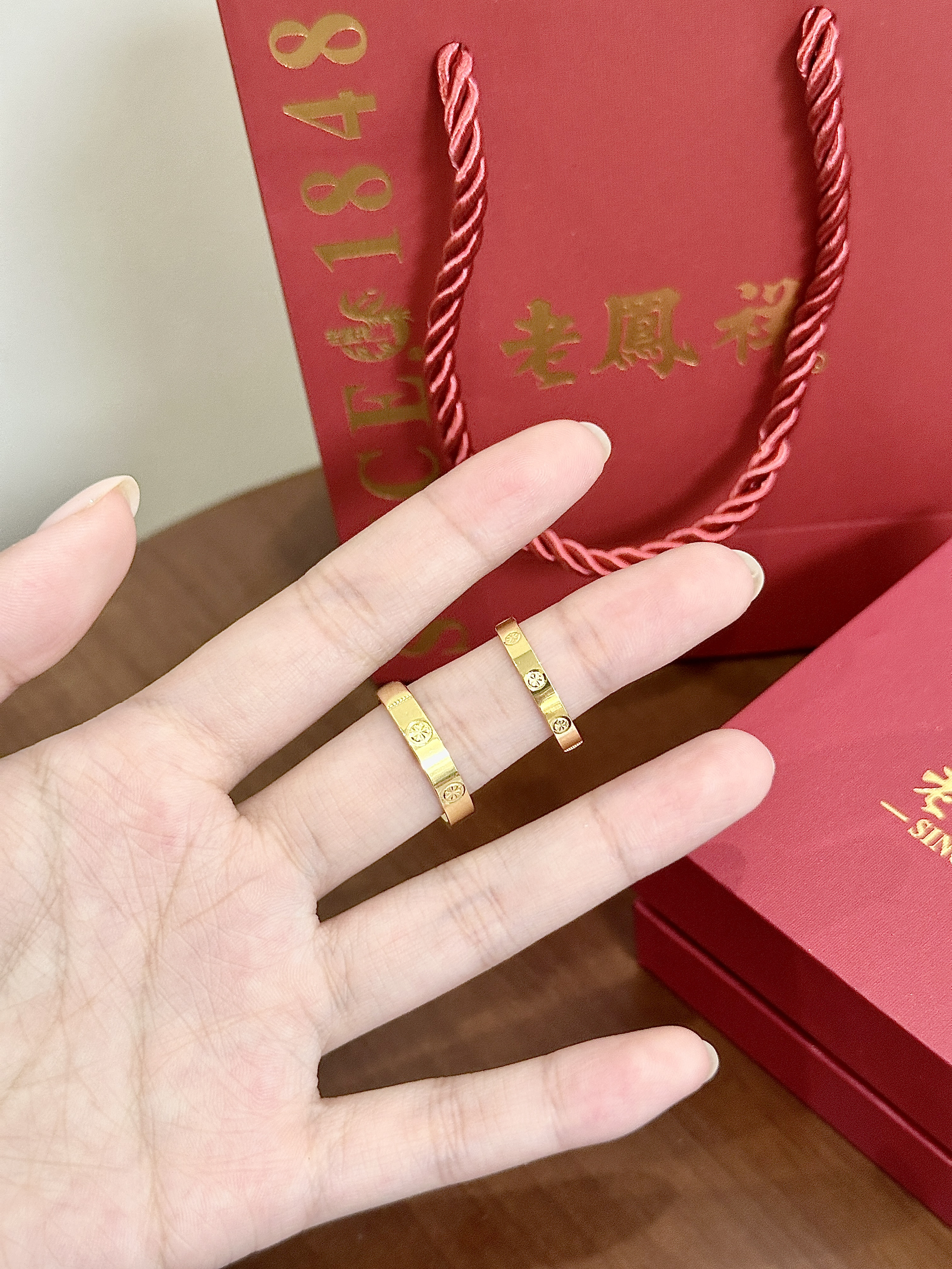 和男朋友逛老凤祥一眼相中介对情侣对戒~ 简约的钻纹素圈设计,还挺有质感的 内侧可以刻字,浪漫手到擒来🌹 细节方面做的蛮不错 戴起来温柔又贵气,传统牌子果然不会让我失望😎 单戴叠戴都好看,日常穿搭的加分小配饰