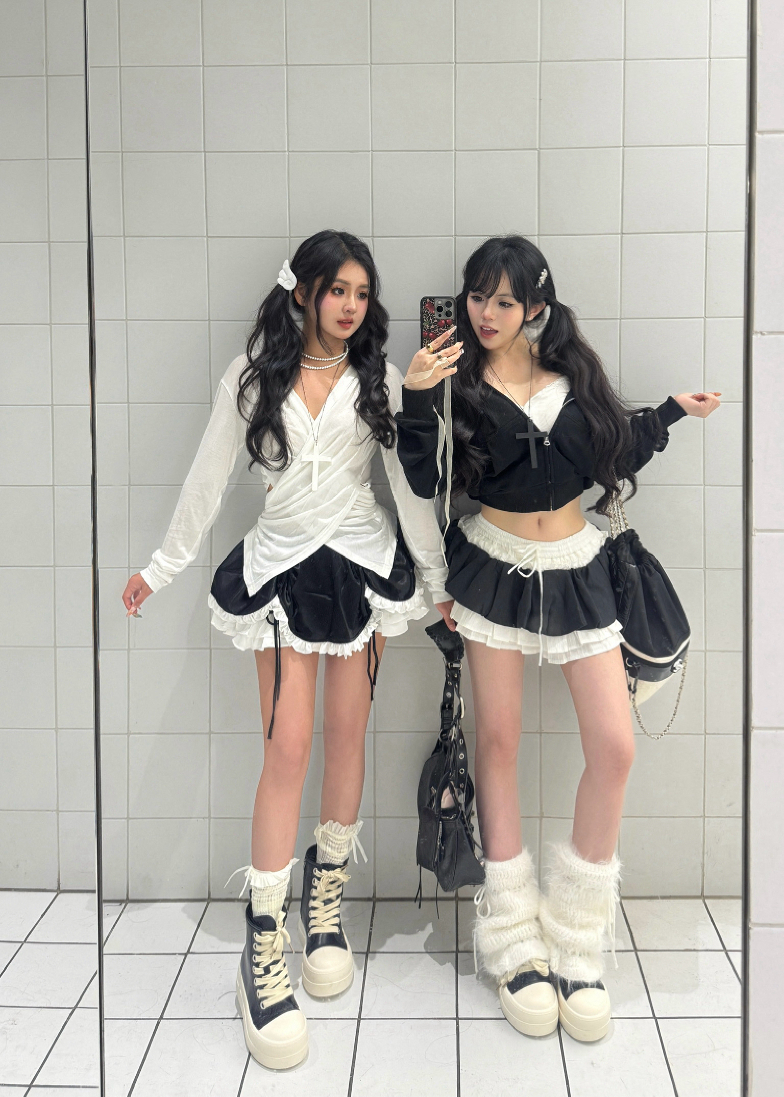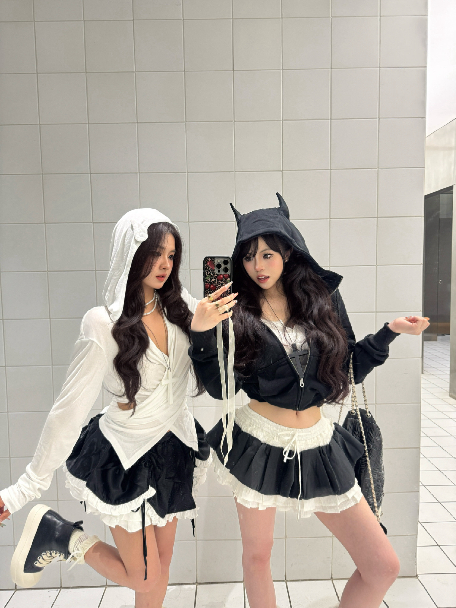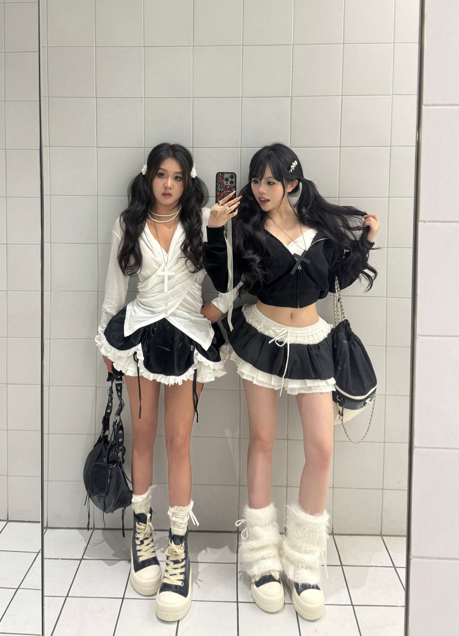咱这套黑白配,一个走圣洁修女风,一个走暗黑小恶魔风,万圣节氛围这不就来了~ 闺蜜脚上这双高帮黑鞋,朋克厚底显得比例很好👍再配铆钉包,往那一站就是修道院叛逆者。我那双低帮黑鞋搭毛绒袜套,甜丧感拉满,小恶魔的俏皮感一下就出来了。 就这穿搭,不管是讨糖还是逛鬼屋,都赚足眼球~