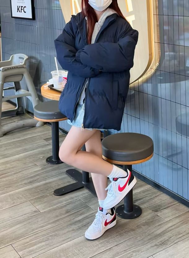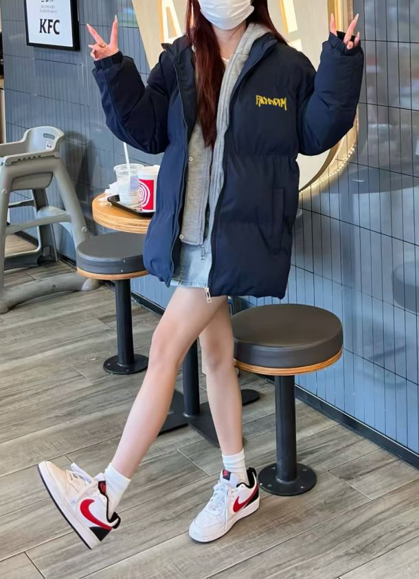 OOTD|女大都穿什么假两件棉服⁉️ 假两件的连帽设计感外套一眼爱上~ 配色日常简约又百搭 印花不会显得单调 宽松的版型很包容身材 男女都可以穿