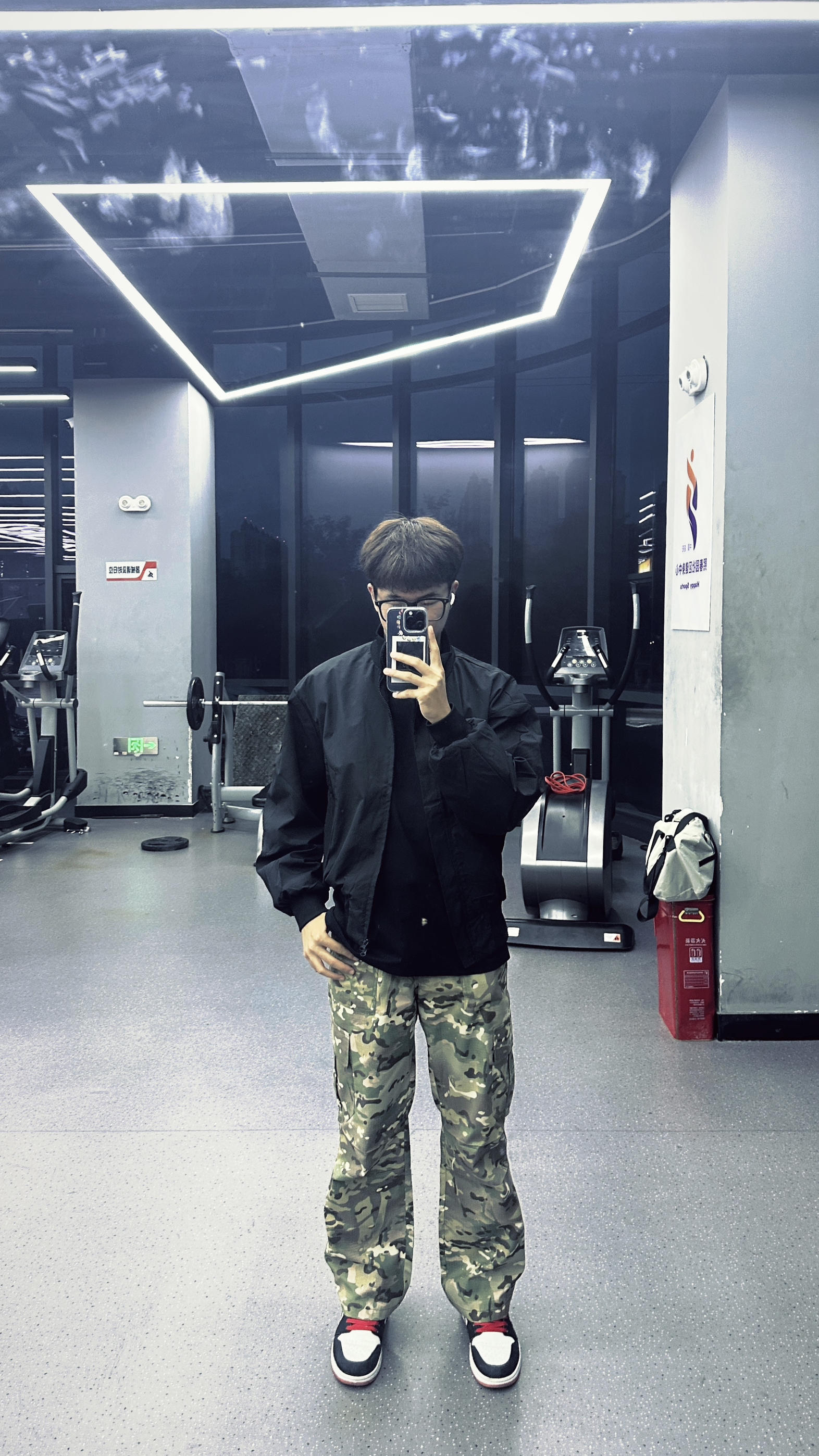 分享下今天的健身穿搭真实感受: • 上衣:黑色宽松夹克+内搭黑T,健身房里空调足,夹克防风又不会闷,脱了直接练也方便,低调还显瘦; • 裤子:迷彩工装裤,版型是偏阔的那种,深蹲、拉伸完全不卡裆,口袋能装手机钥匙,实用性拉满; • 鞋子:黑红白配色的板鞋,轻便不笨重,从健身房出来顺路逛个街也不违和。 整体是“不用费脑但又有点风格”的搭配,适合想舒服健身、又不想穿得太“运动服”的朋友~