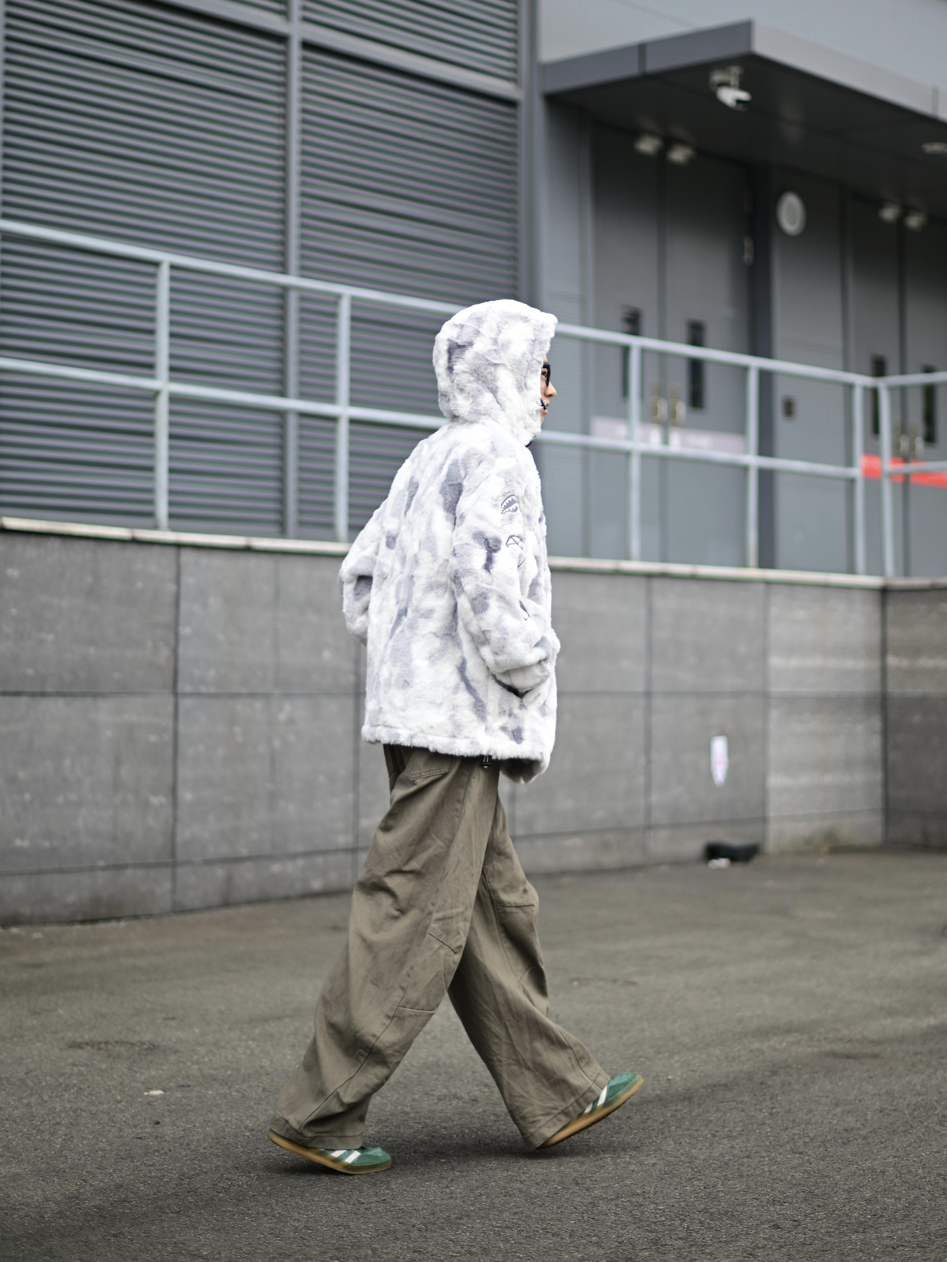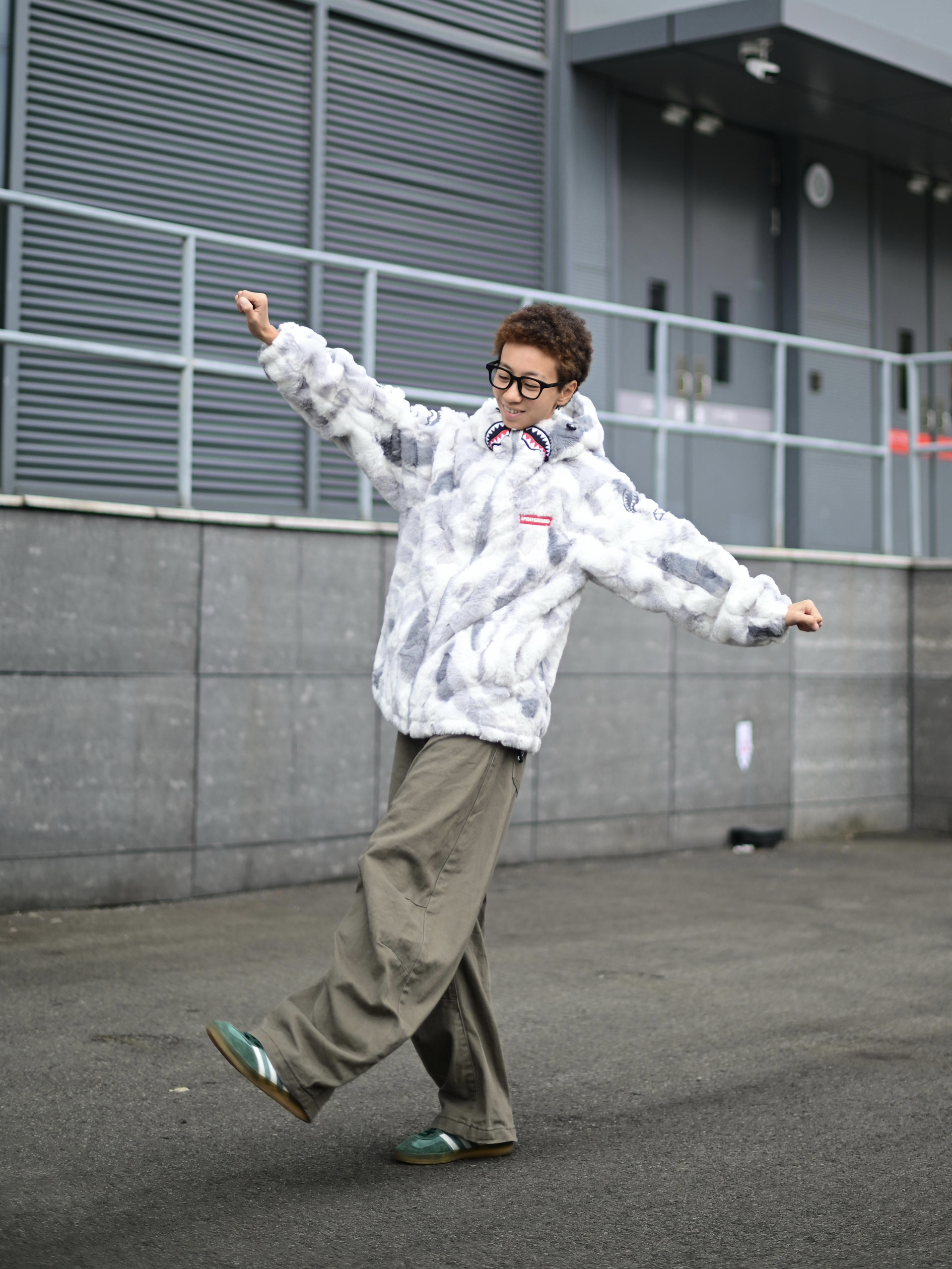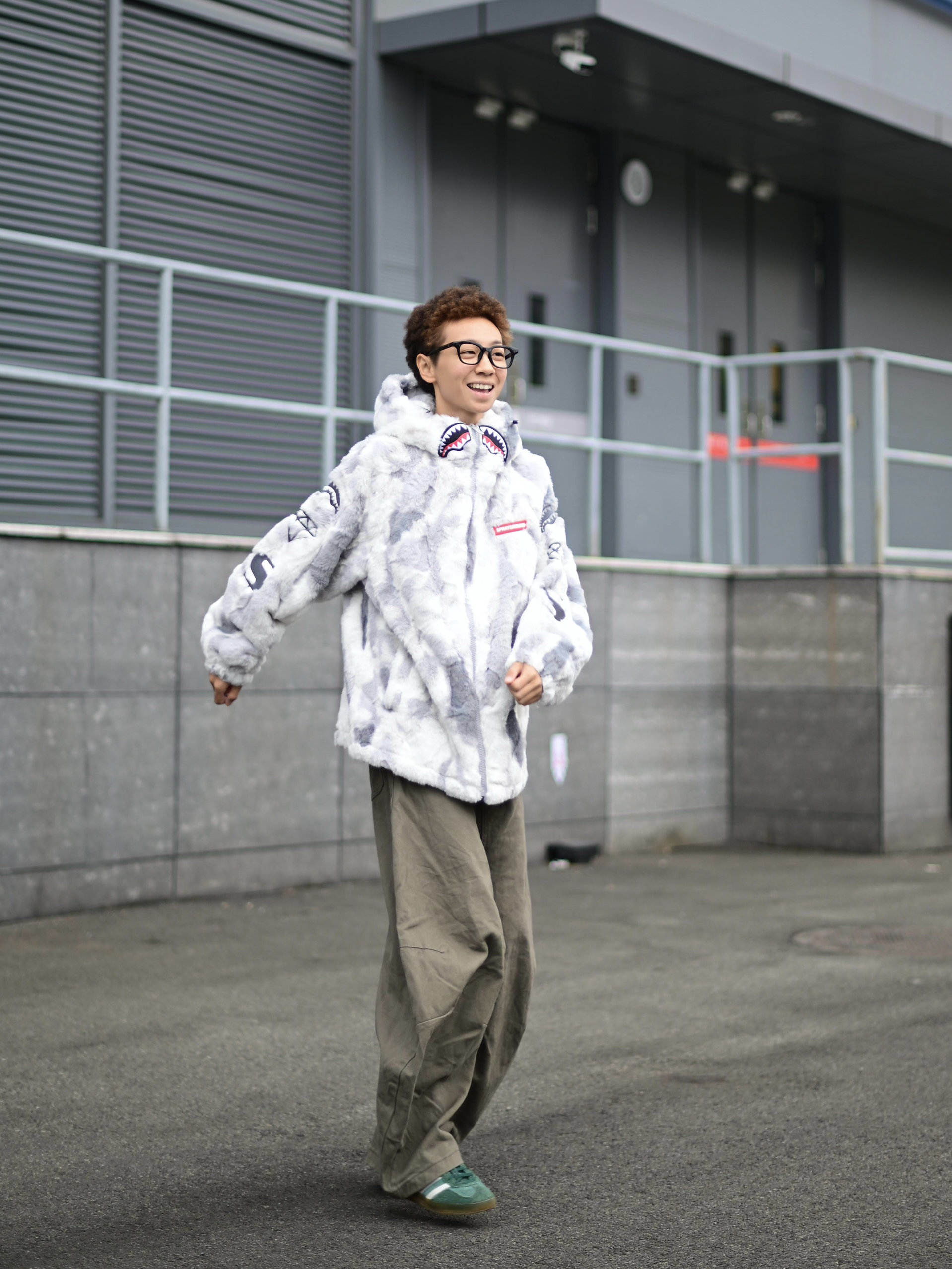 172CM|55KG 👔:m👖:m|👟:39码 降温天就需要一件又暖又帅的羊羔绒外套! SPRAYGROUND灰白迷彩配色真的深得我心 胸前的鲨鱼刺绣细节感拉满 加厚材质包裹性好 起风天也能锁住温度❄️ 内搭选了纯黑卫衣打底 下身搭配卡其色阔腿工装裤 用绿白配色运动鞋提亮整体 外套的宽松版型活动起来自在 背影侧身都很有立体感 日常通勤或周末出游都能穿出街头慵懒感~