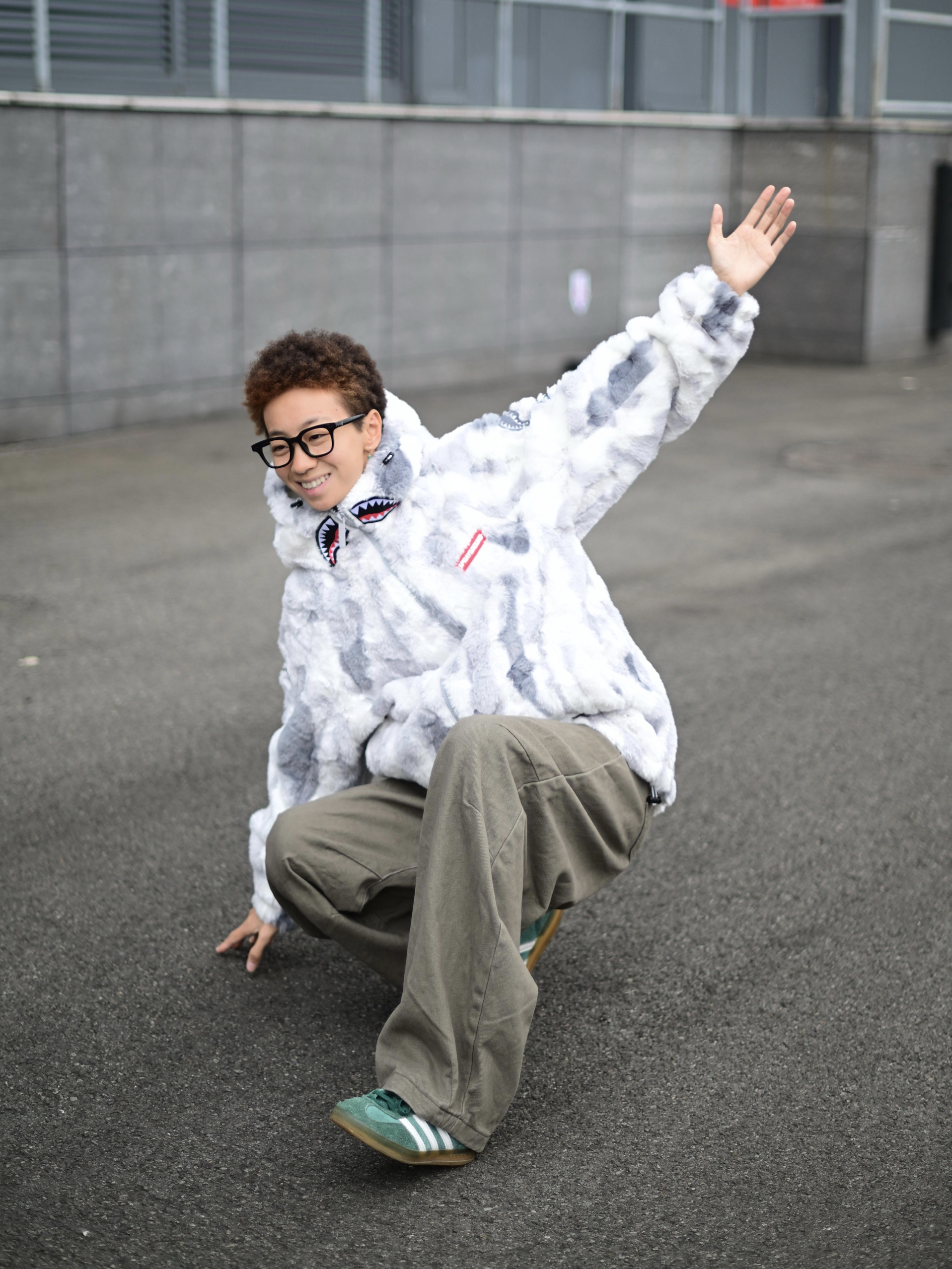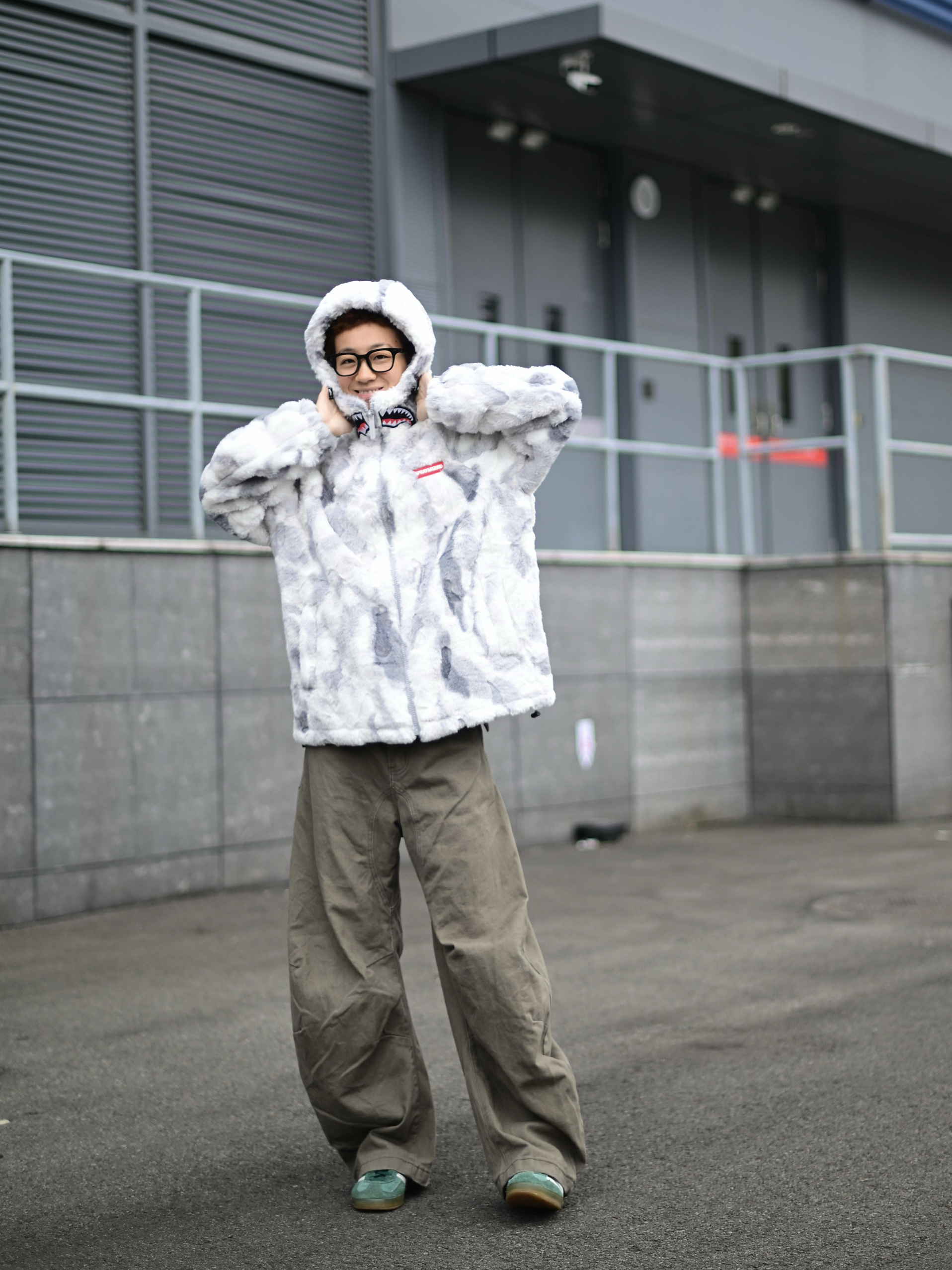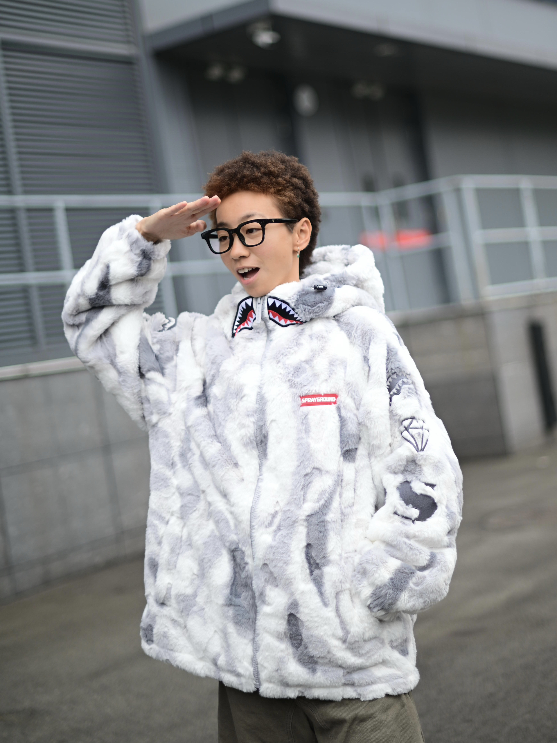 172CM|55KG 👔:m👖:m|👟:39码 降温天就需要一件又暖又帅的羊羔绒外套! SPRAYGROUND灰白迷彩配色真的深得我心 胸前的鲨鱼刺绣细节感拉满 加厚材质包裹性好 起风天也能锁住温度❄️ 内搭选了纯黑卫衣打底 下身搭配卡其色阔腿工装裤 用绿白配色运动鞋提亮整体 外套的宽松版型活动起来自在 背影侧身都很有立体感 日常通勤或周末出游都能穿出街头慵懒感~