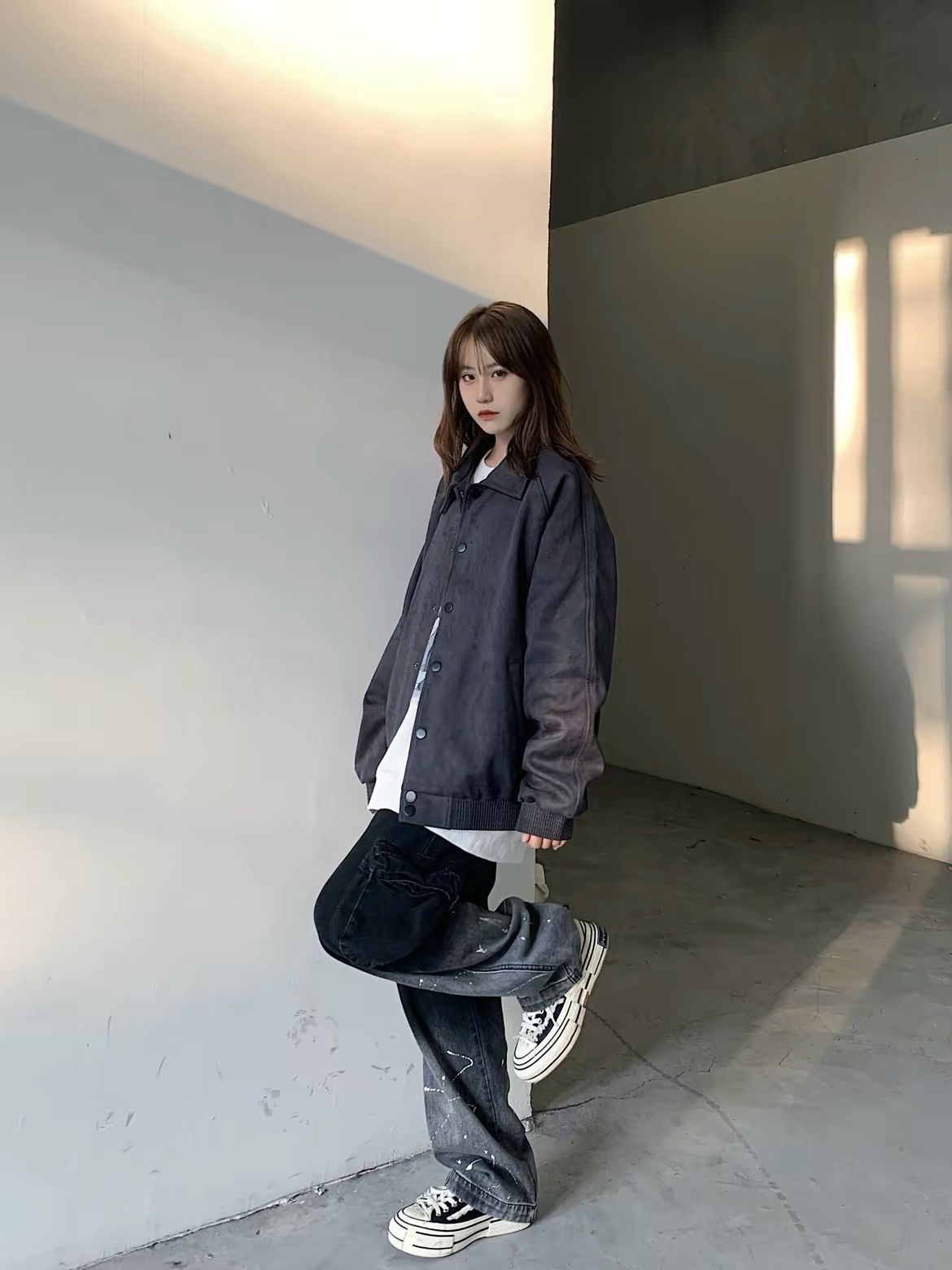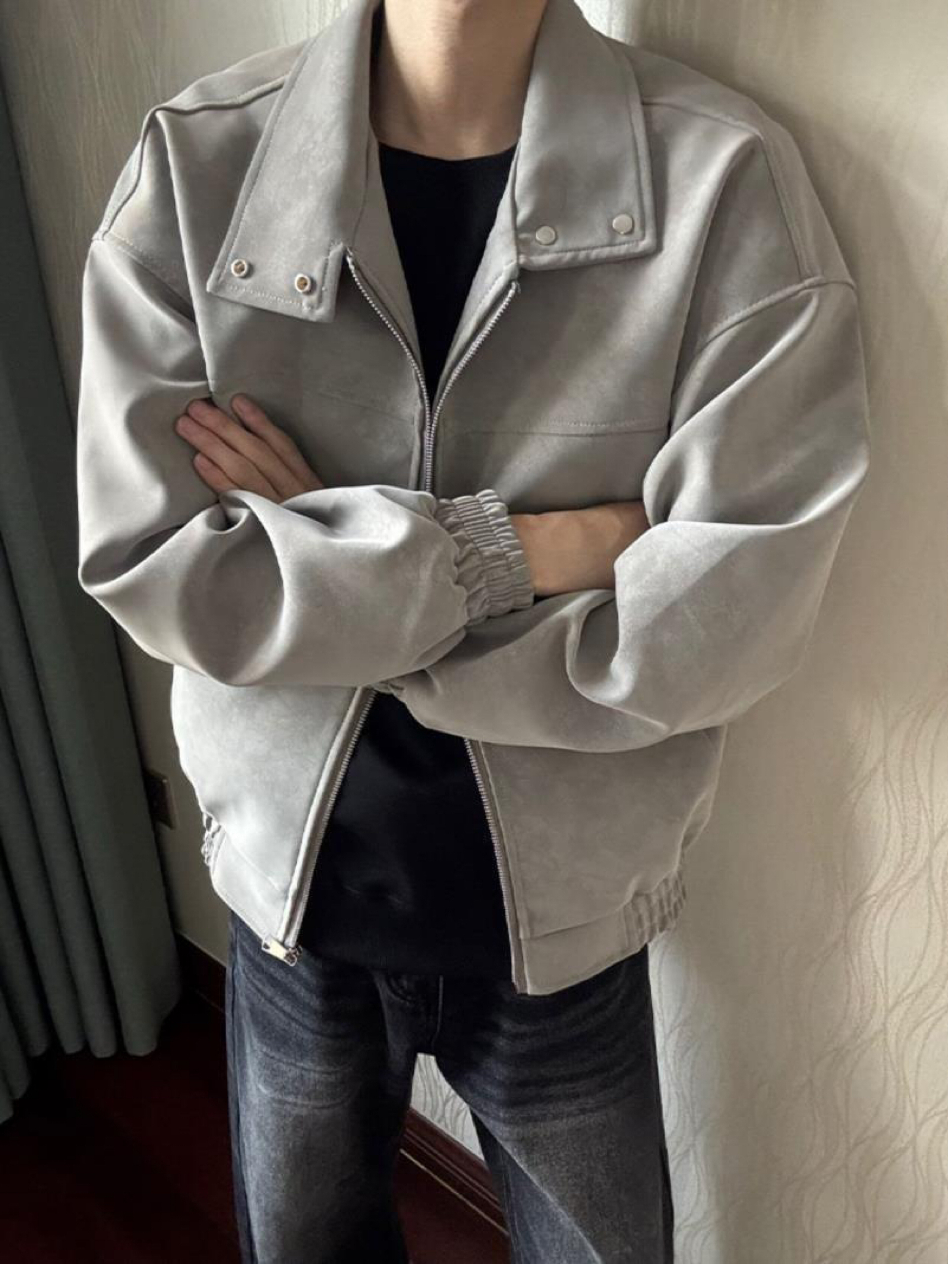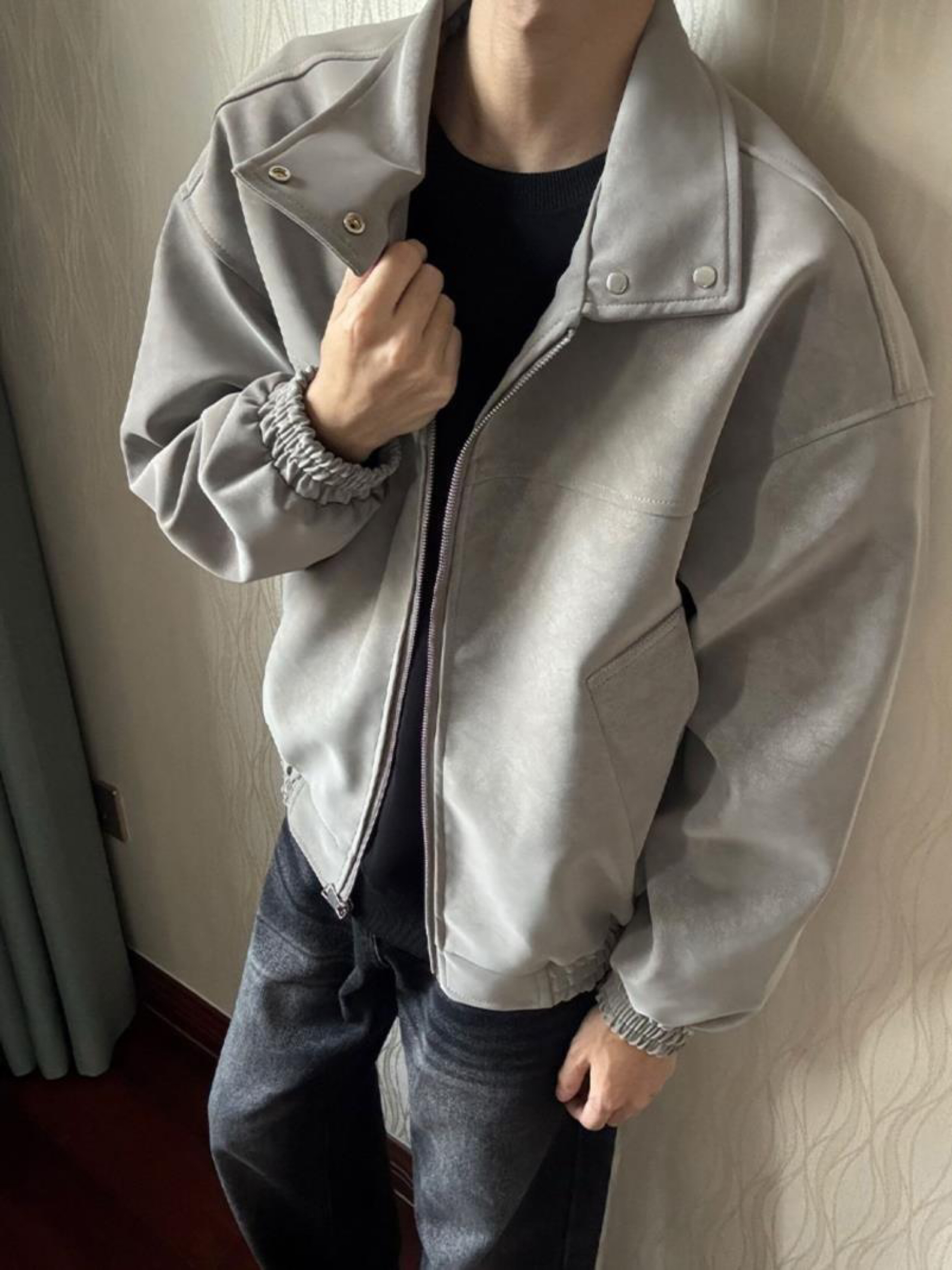谁能拒绝一件软fufu的麂皮夹克啊!浅灰色调高级又百搭,麂皮材质摸起来糯叽叽的,穿上瞬间变身质感达人~立领设计利落又显精神,拉链和金属扣细节满满,搭配白T牛仔裤,休闲感拉满;配衬衫西裤,通勤也很绝! 版型宽松不挑身材,秋冬叠穿超有层次,这波穿搭“小心机”,我先锁死了