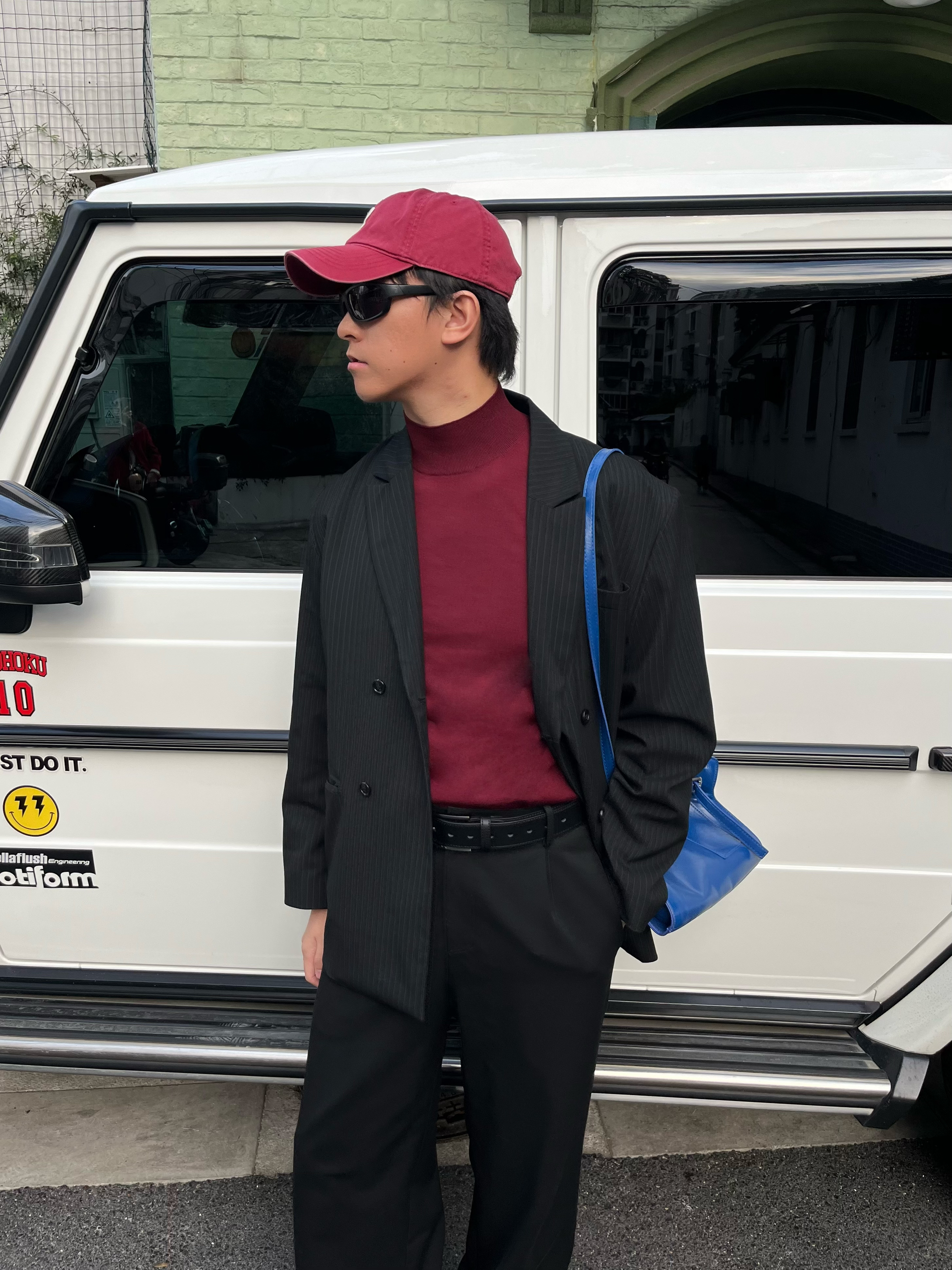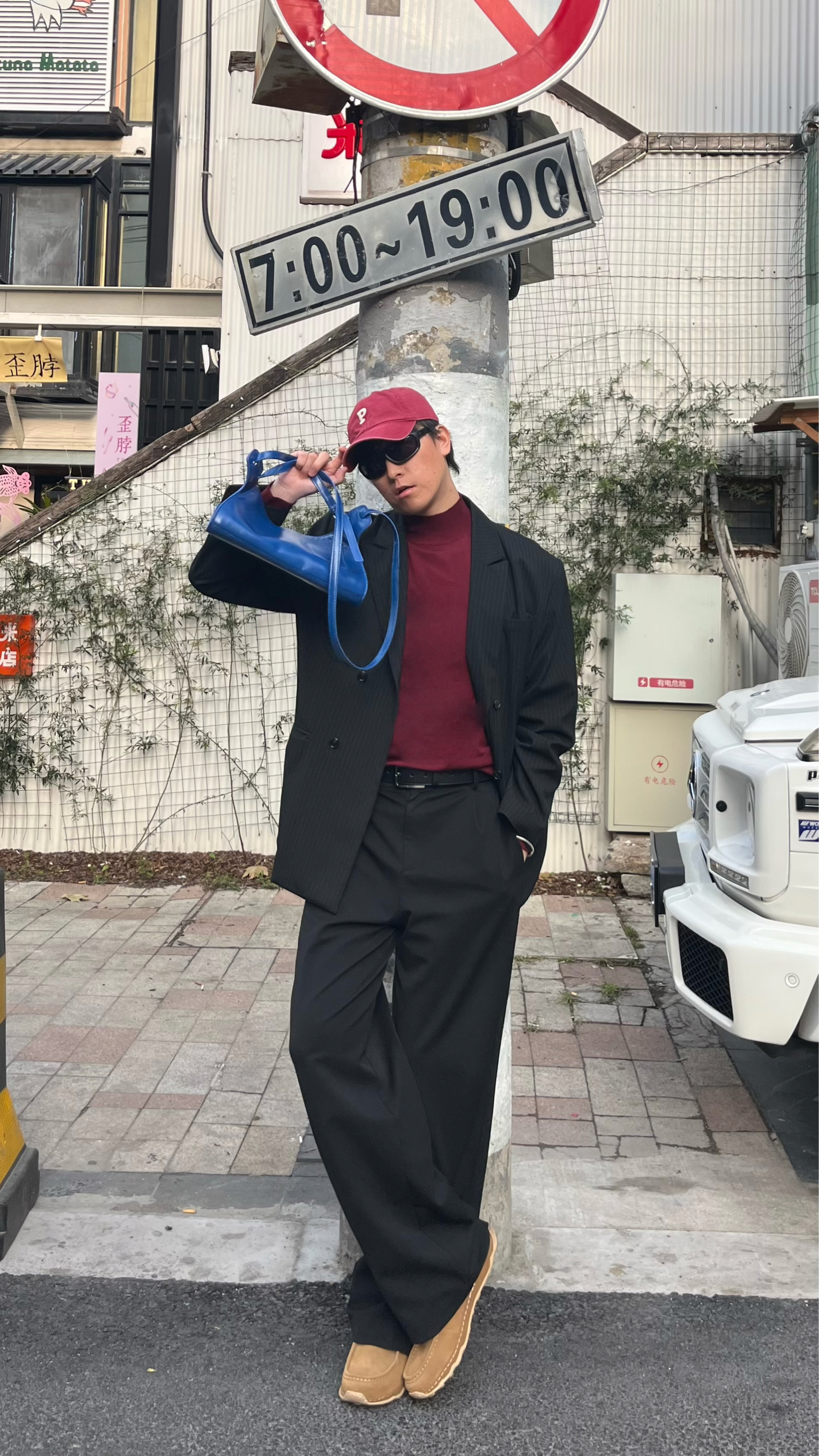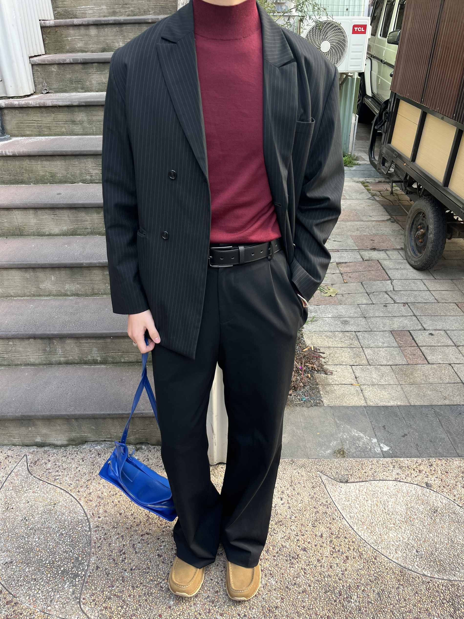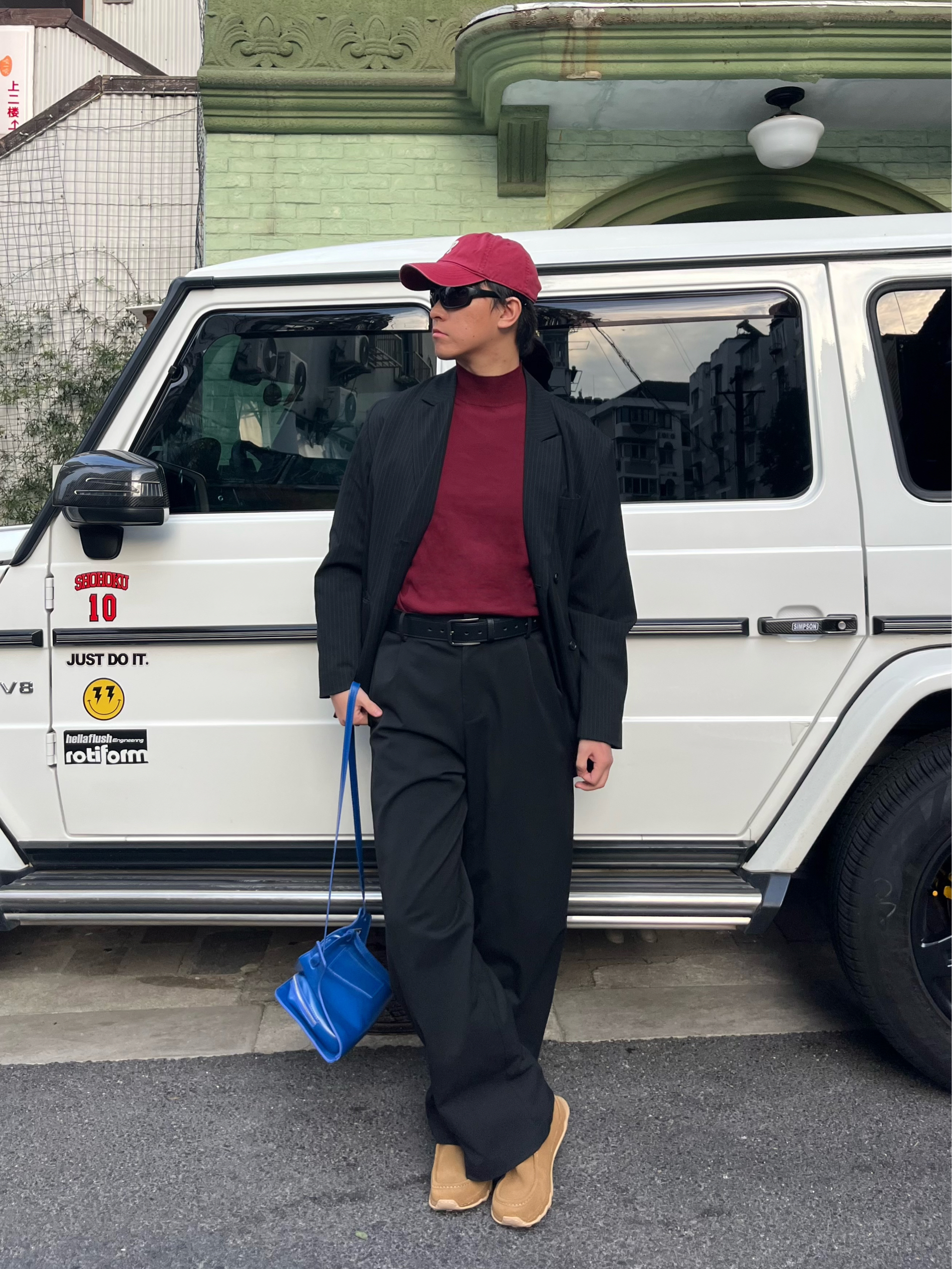 谁懂啊!黑西装的“闷”,被酒红高领+克莱因蓝包直接盘活了 暗条纹西装+垂感西裤是复古基底,酒红内搭偷偷加了秋冬氛围buff,最后甩个亮蓝包——沉稳里跳出来的“野”,这才是复古搭的小心机! 麂皮靴的暖棕收尾,硬是把“冷硬感”揉成了松弛的街潮味~ 这套“暗调撞色公式”你们学废没?评论区晒出你的撞色搭!