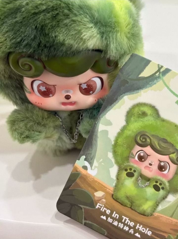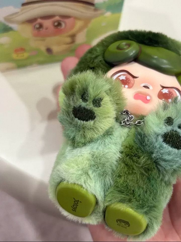【谁懂啊!这只“绿毛特种兵”直接戳中我的心巴💥】 谁能拒绝一只穿满绿毛绒、眼神带星的特种兵崽啊!! 从盒里掏出来的瞬间直接被萌晕——头顶俩卷毛犄角,脸颊小腮红配星星眼,连爪爪都是毛绒绒的小肉垫🥺 脖子上挂的小银链拽里拽气,结果一翻脚底,“jotoys”和Q版小头像又乖得要命… 咱就是说,这只“Fire In The Hole”崽崽,把“凶萌反差感”玩明白了!摆在桌上当摆件,出门挂包上当挂件...