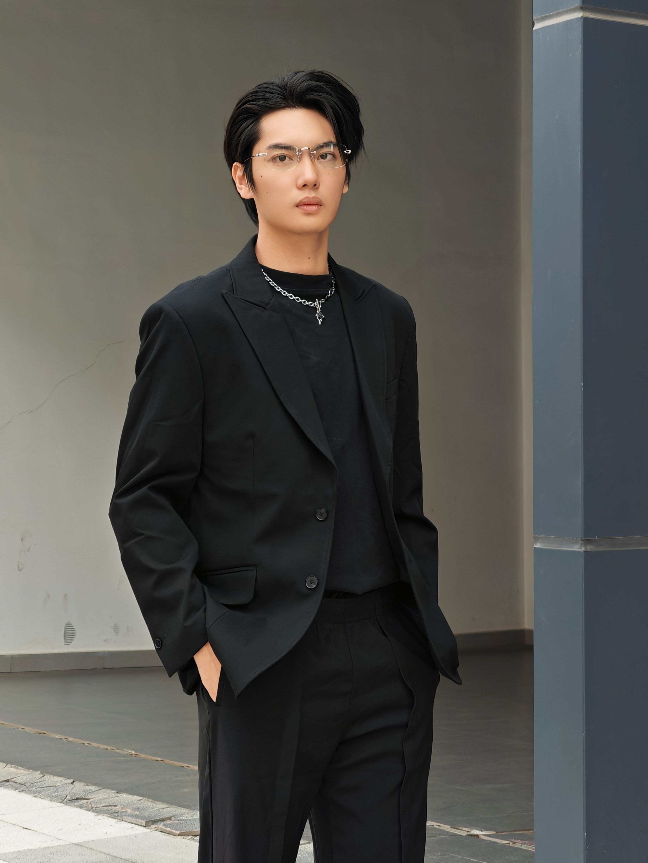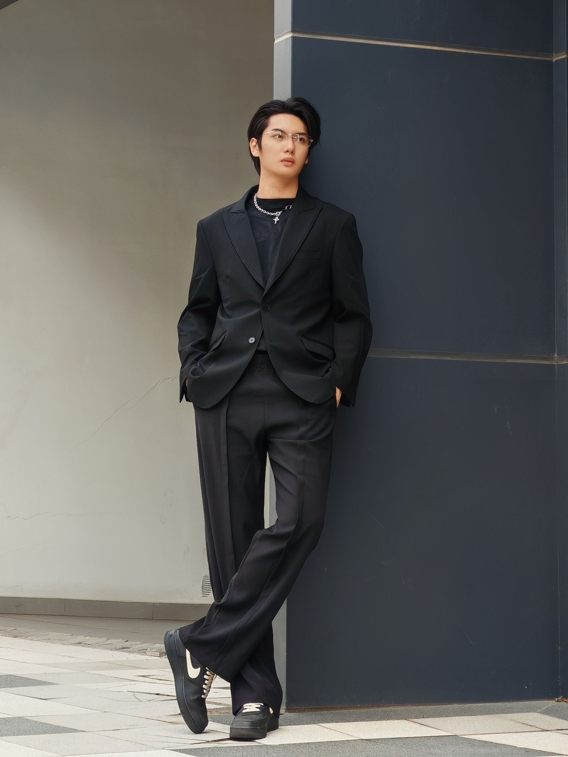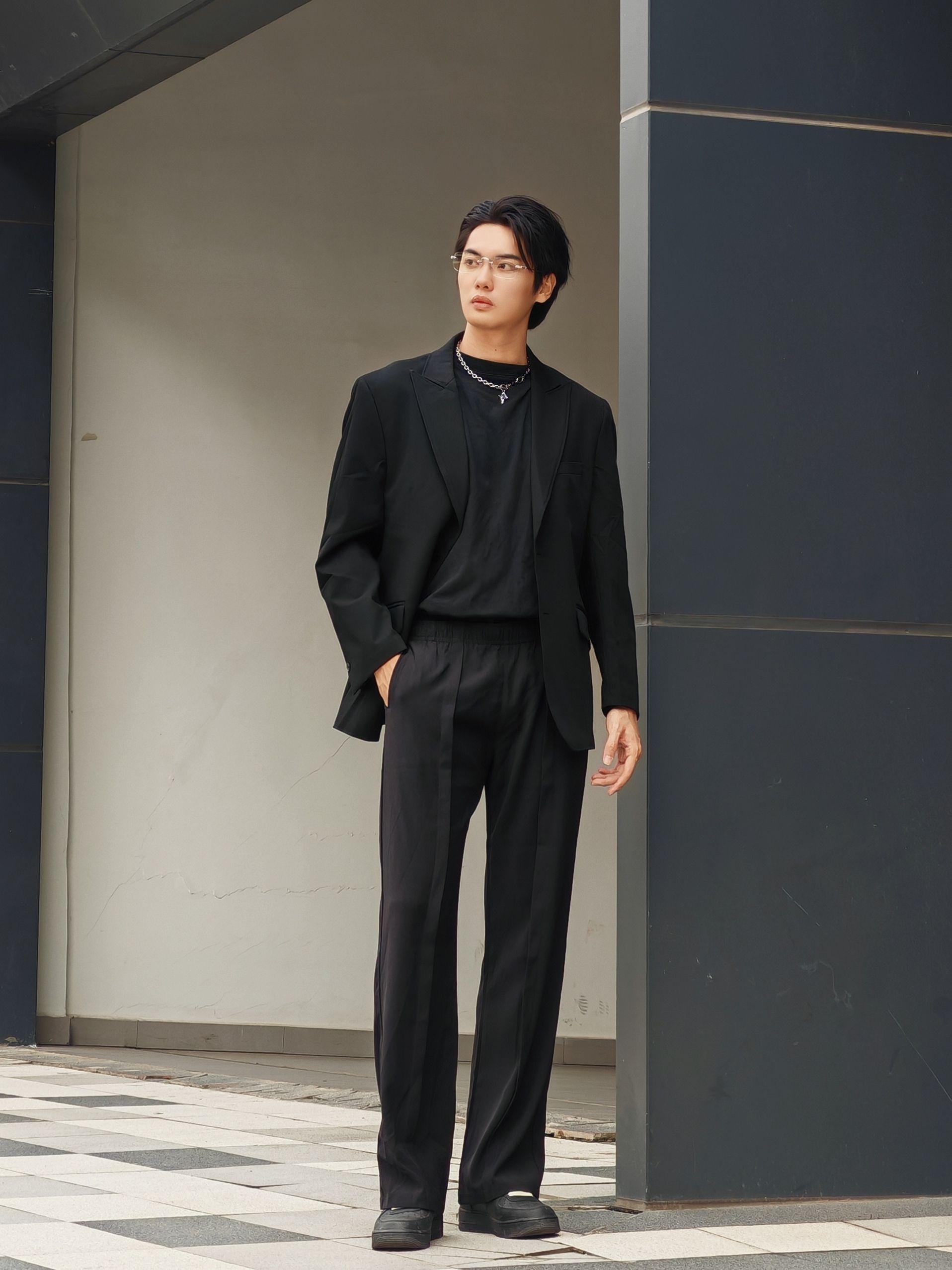 黑色系轻熟风,高级感直接焊在身上! 想走轻熟高级风的男生看过来!这套全黑系松弛感穿搭把“好命感”拿捏得死死的~ - 上衣:oversize黑色西装+内搭黑色圆领衫,廓形西装弱化正式感,多了几分随性;内搭简约不抢戏,让造型层次更丰富。 - 下装:黑色垂感阔腿西裤,高腰+直筒版型巨显腿长,走路带风的松弛感谁穿谁懂! - 配饰:银色链条项链点睛,打破全黑沉闷;透明边框眼镜+黑色厚底鞋,把轻熟和潮...