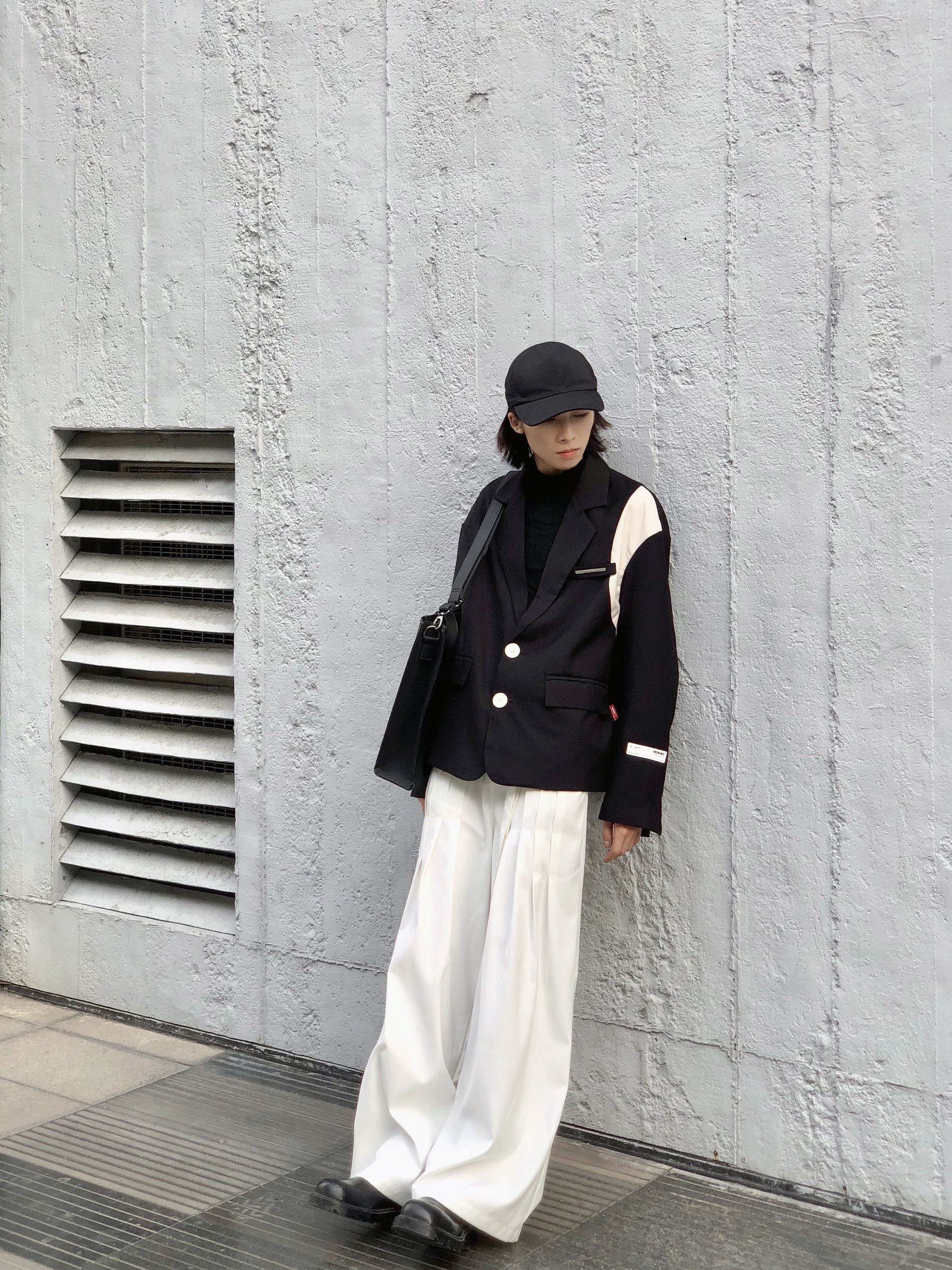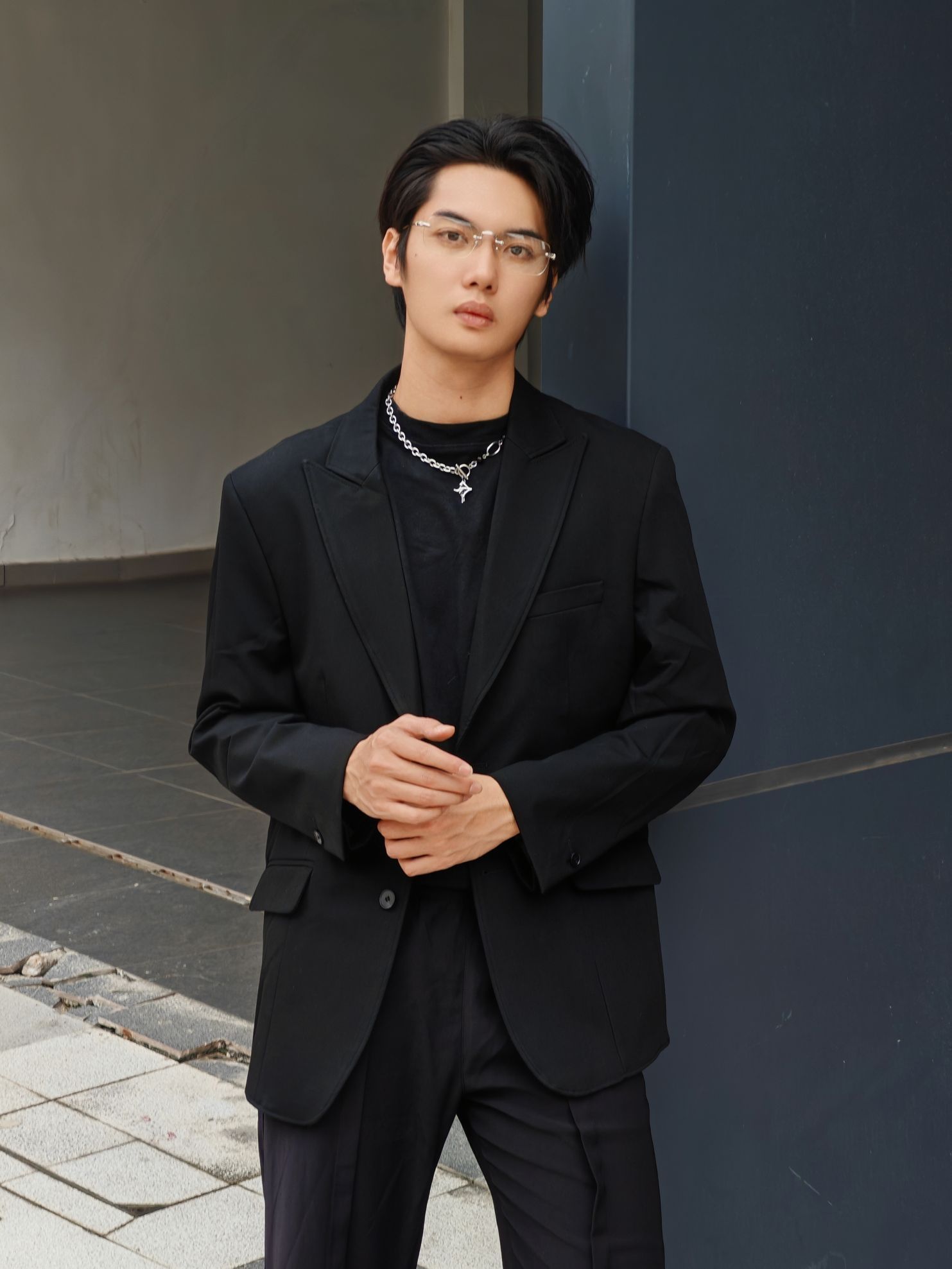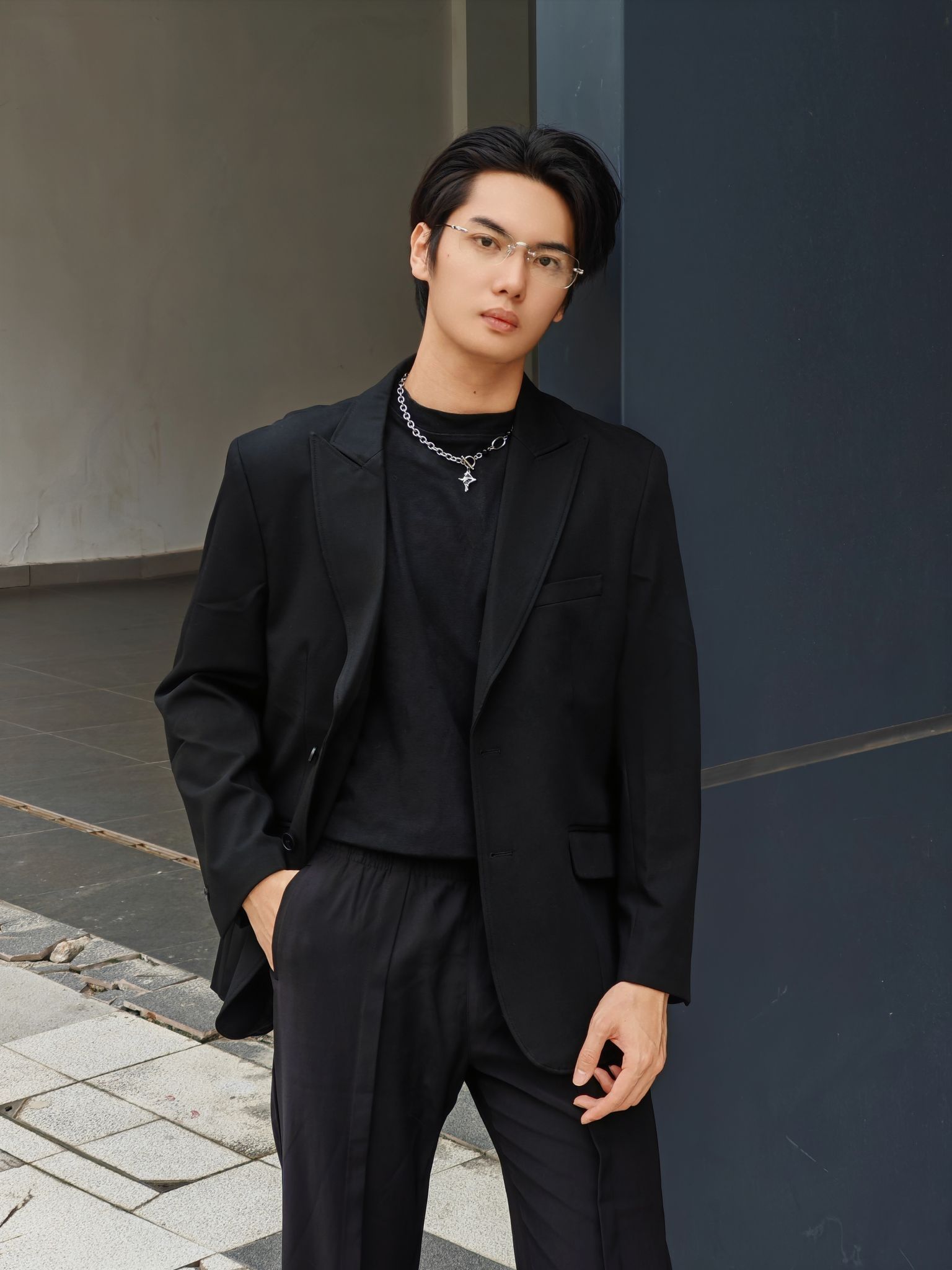 黑色系轻熟风,高级感直接焊在身上! 想走轻熟高级风的男生看过来!这套全黑系松弛感穿搭把“好命感”拿捏得死死的~ - 上衣:oversize黑色西装+内搭黑色圆领衫,廓形西装弱化正式感,多了几分随性;内搭简约不抢戏,让造型层次更丰富。 - 下装:黑色垂感阔腿西裤,高腰+直筒版型巨显腿长,走路带风的松弛感谁穿谁懂! - 配饰:银色链条项链点睛,打破全黑沉闷;透明边框眼镜+黑色厚底鞋,把轻熟和潮...
