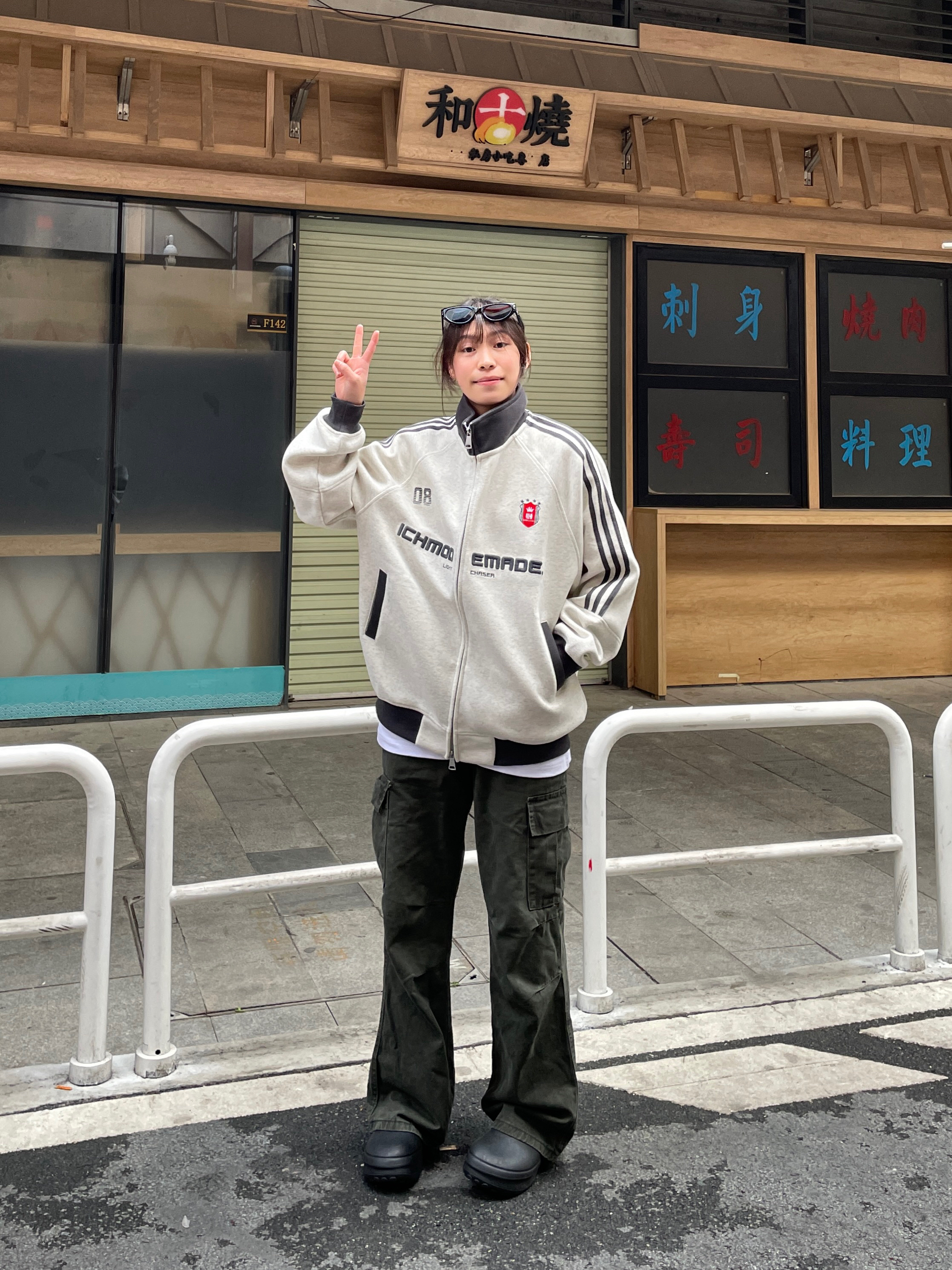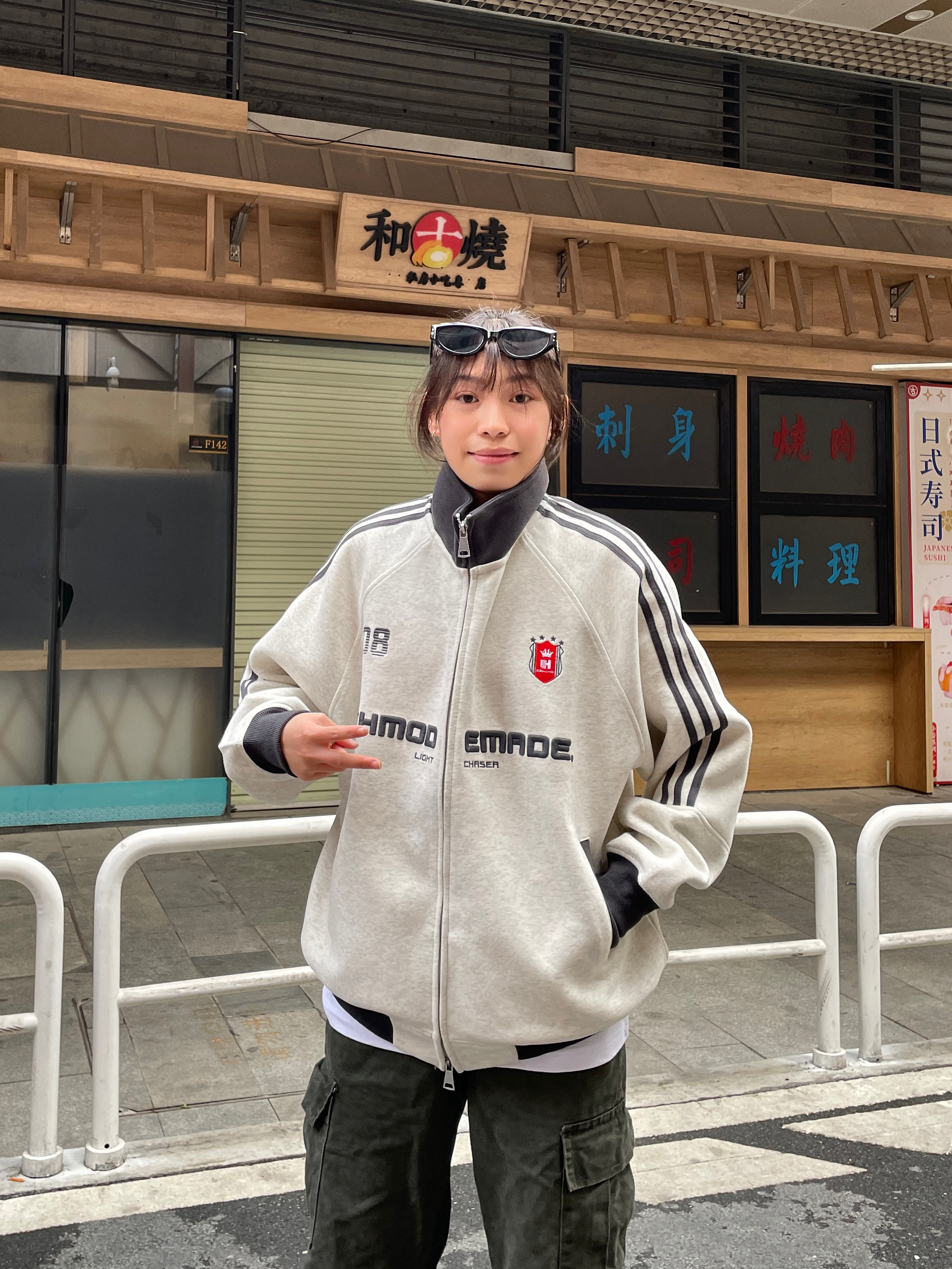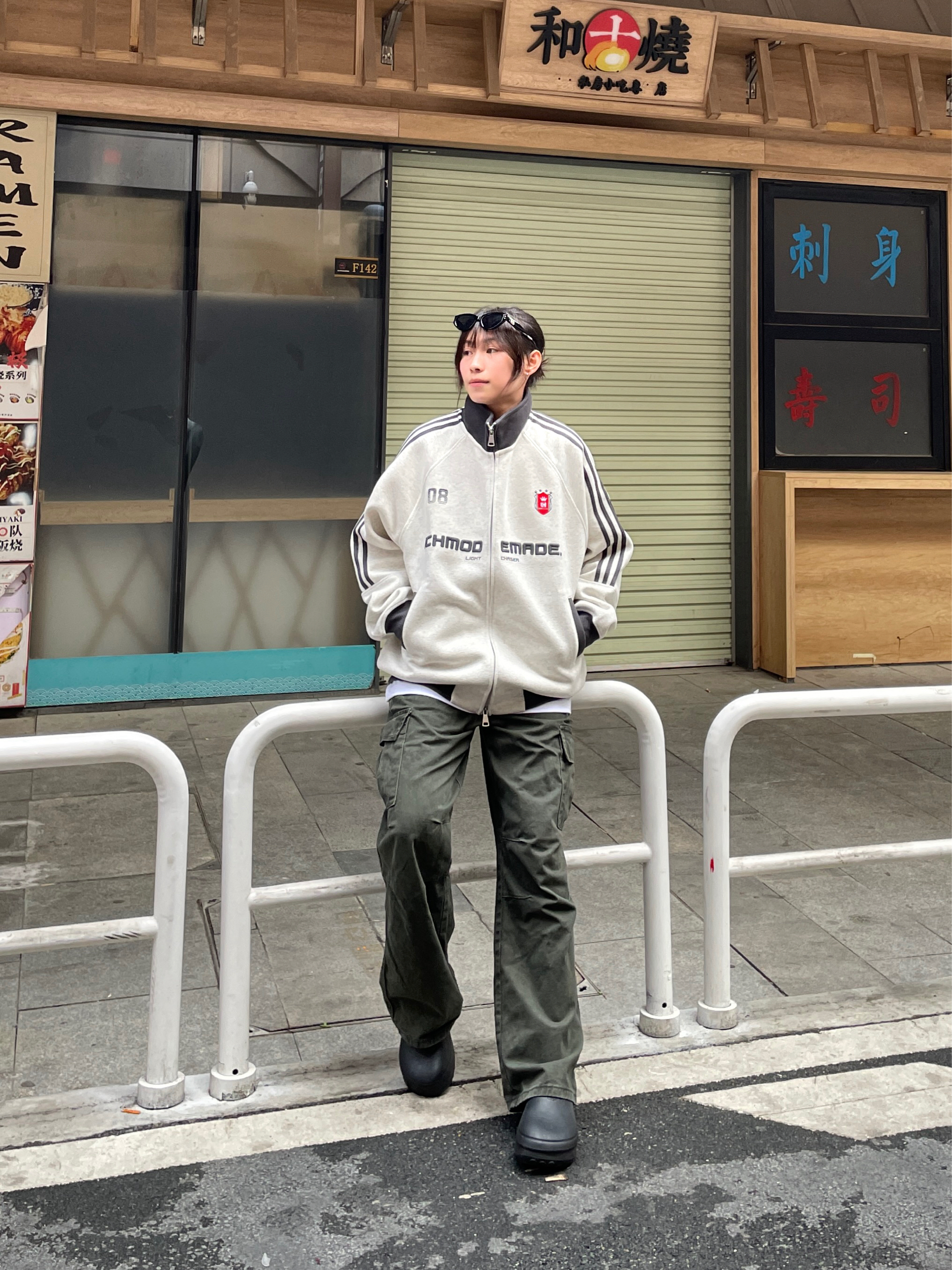 Hello~这里是穿搭女孩Dali - 广州的秋冬季一件立领卫衣就搞定了! 上身一件ICH家的条纹开衫外套 宽松舒适的版型加上赛车元素美式风满满 搭配一条美式直筒工装裤