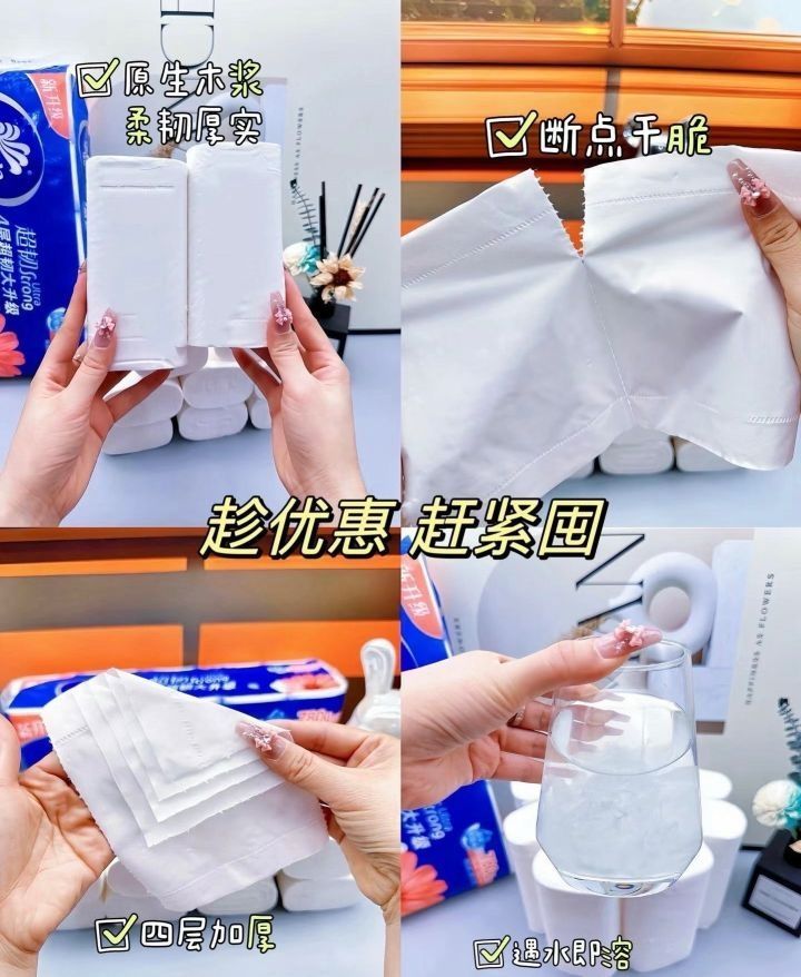 原生木浆柔软亲肤,厚实强韧,湿水不破超实用~ 细腻无屑不刺激,吸水快速,居家囤货性价比超高!