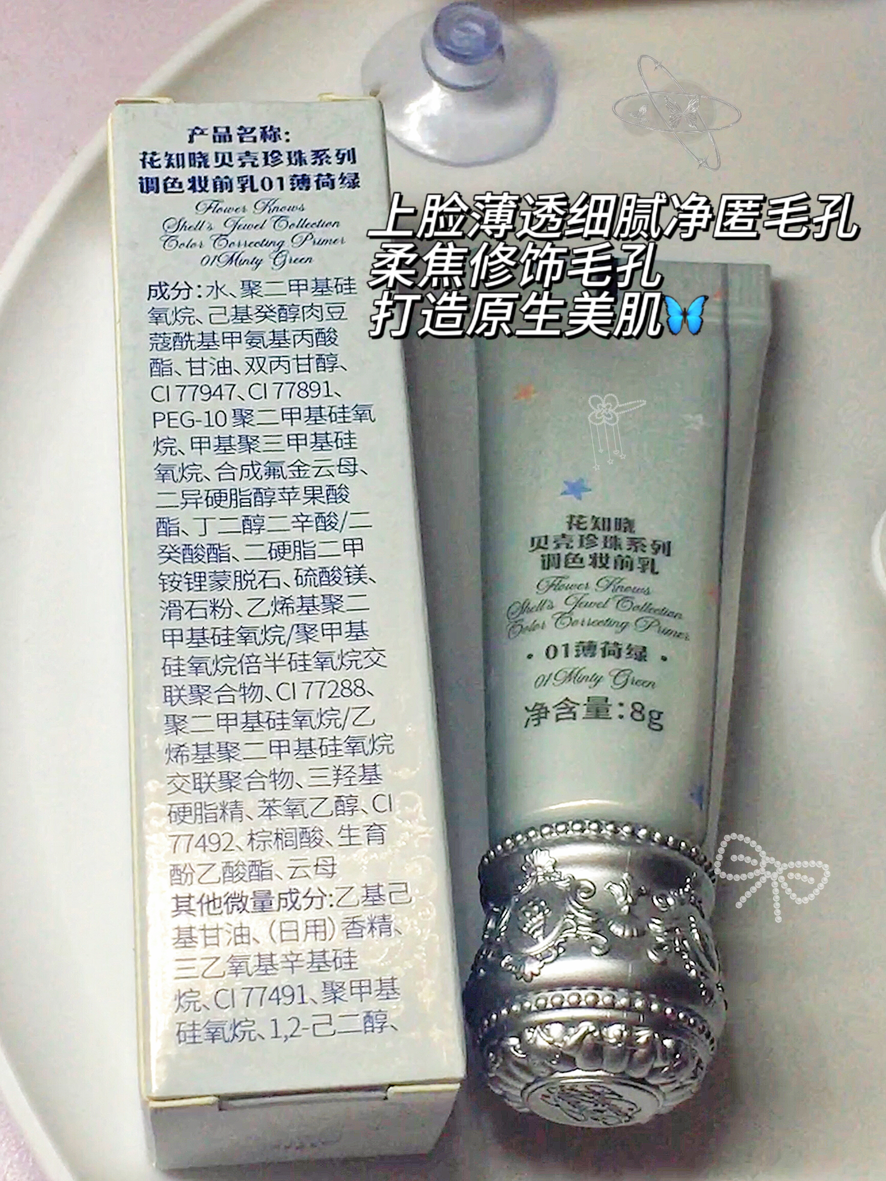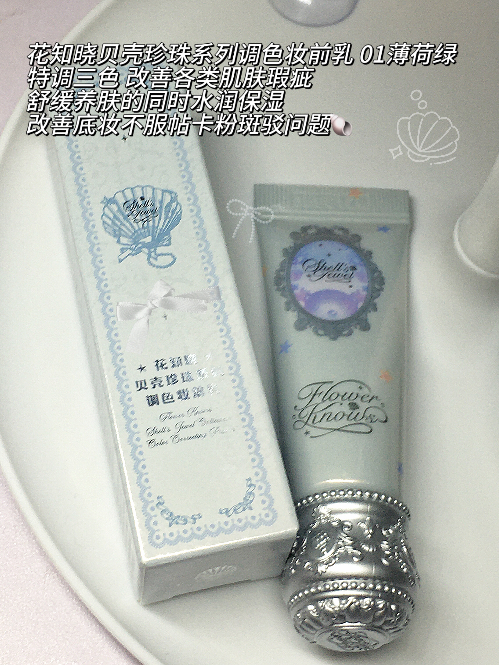 HelloHello 大家好我是小靳,今天给大家分享一款不止好看还超好用的妆前乳!花知晓贝壳珍珠系列调色妆前乳01薄荷绿! 花知晓贝壳珍珠系列调色妆前乳 01薄荷绿 特调三色 改善各类肌肤瑕疵 舒缓养肤的同时水润保湿 改善底妆不服帖卡粉斑驳问题 上脸薄透细腻净匿毛孔 柔焦修饰毛孔 打造原生美肌 沁润融肤 告别假面感 光透不易油腻 是淡淡的桃子香味! 还有这个包装真的很好看 即使是小样的包装也很...