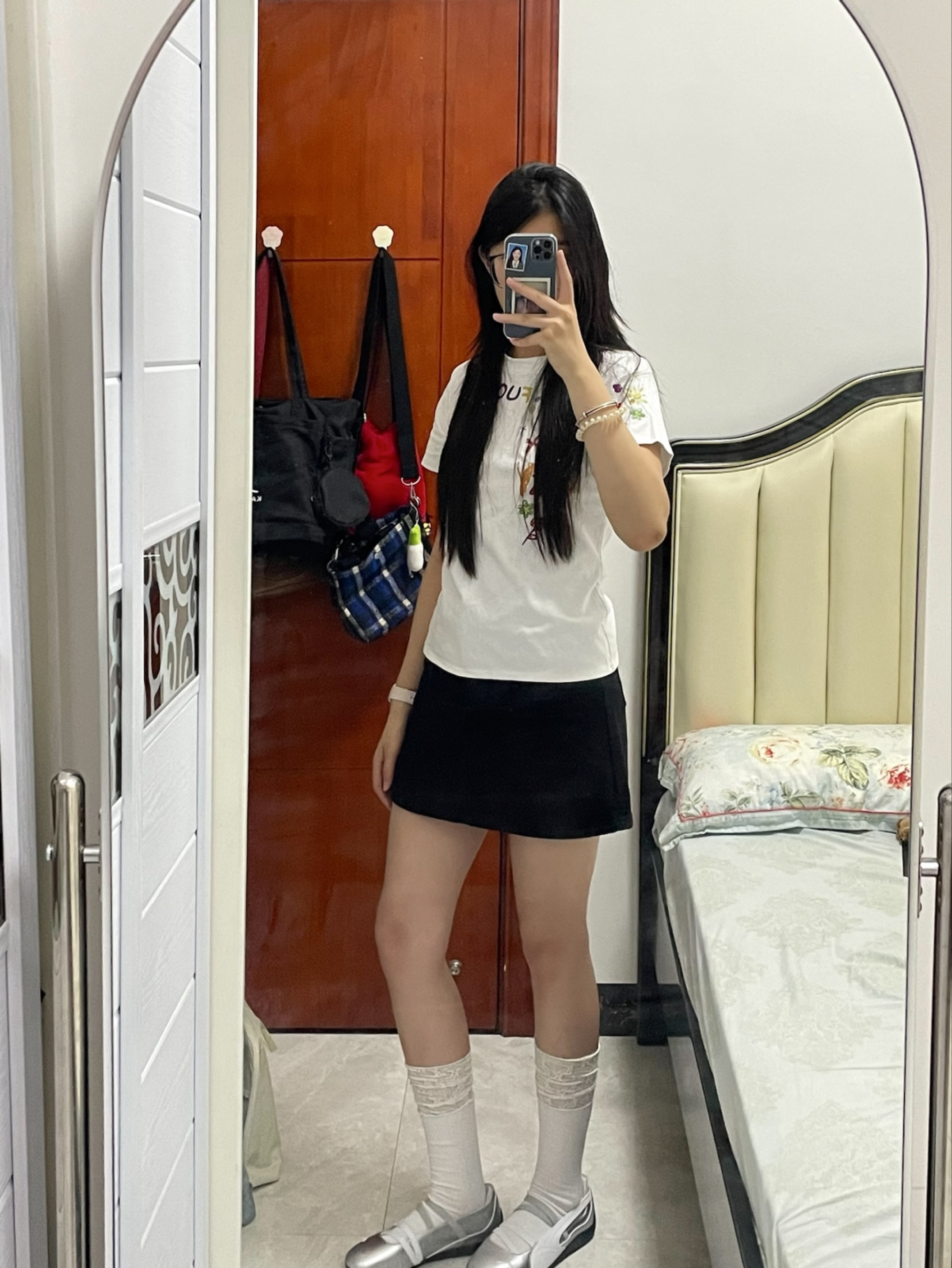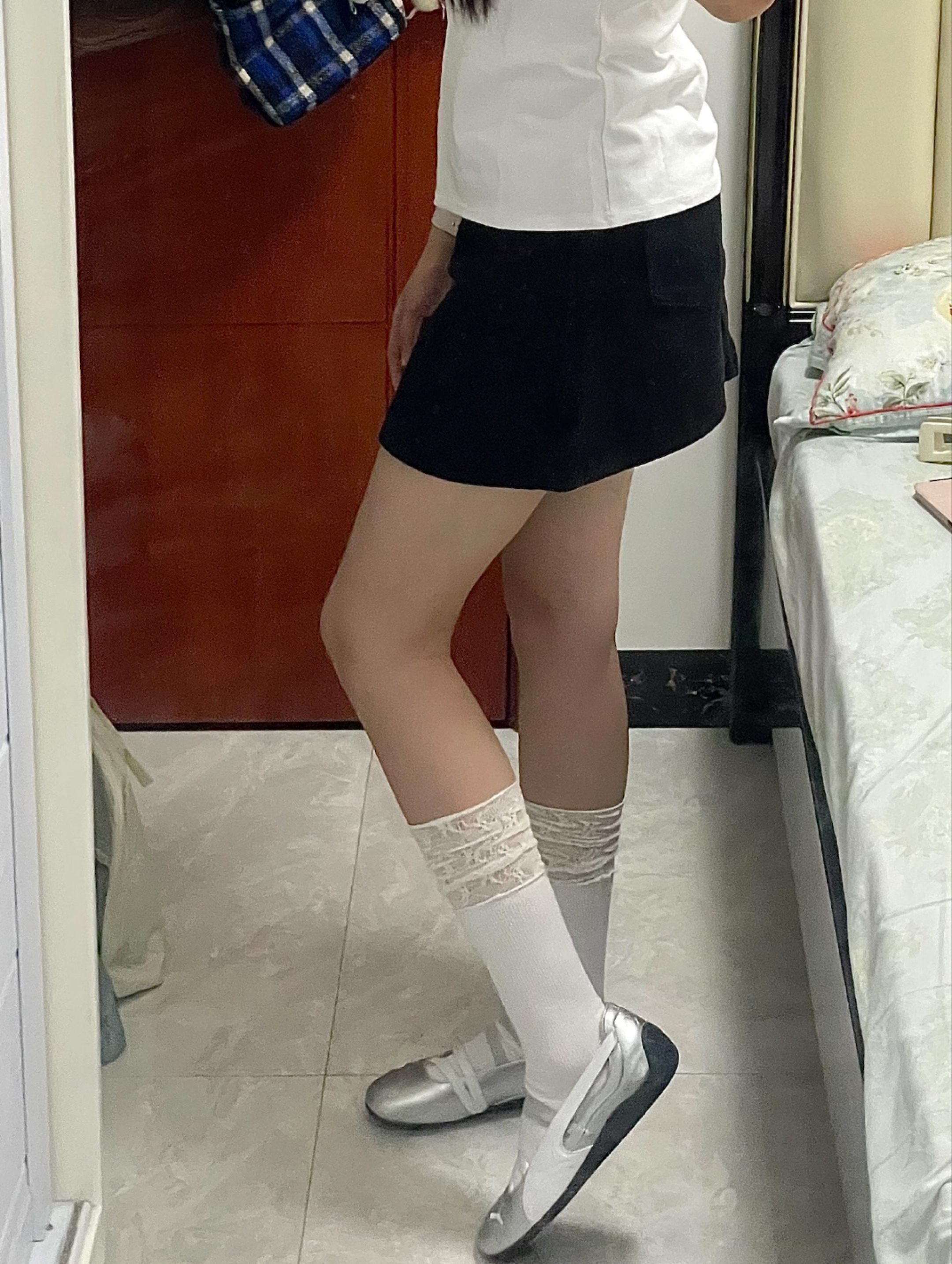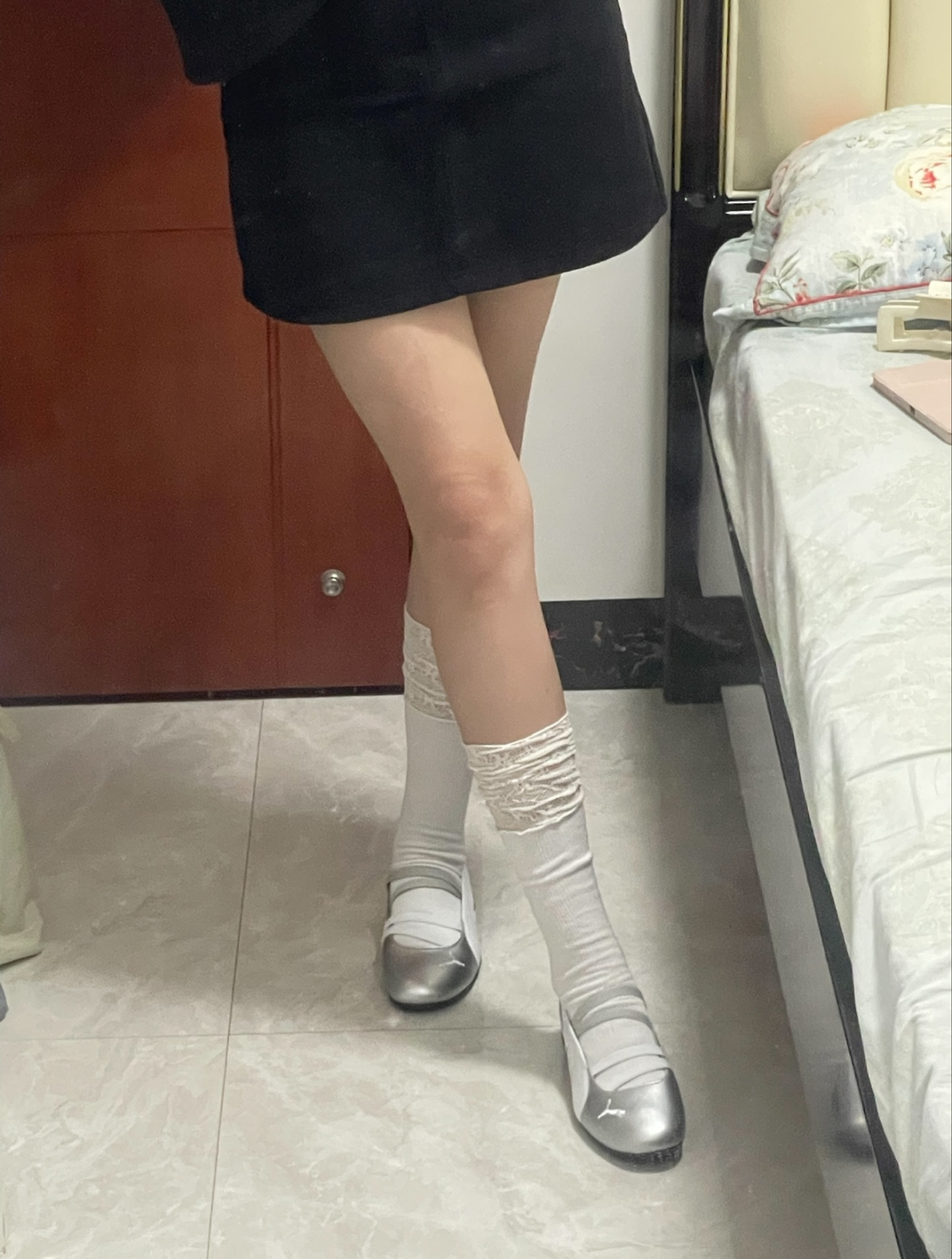 一直没买到白粉配色 去了实体店也是要调货等 但是真的觉得芭蕾舞鞋很适合配短裤短裙 所以忍不住就下单了.. 但是其实感觉银色搭配起来也很有特色 就是会比较挑袜子, 我一开始穿的普通白袜真的很吃丑感觉乡下人一样 后面换了家里仅此一双的蕾丝边袜子 看起来正常多了 配长裤的话可能比较没那么百搭 但是穿起来走路还是挺舒服的 如果是穿久了的话鞋子前面可能会有褶皱,因为他好像是皮质的前面,白粉色朴彩英那款的材...
