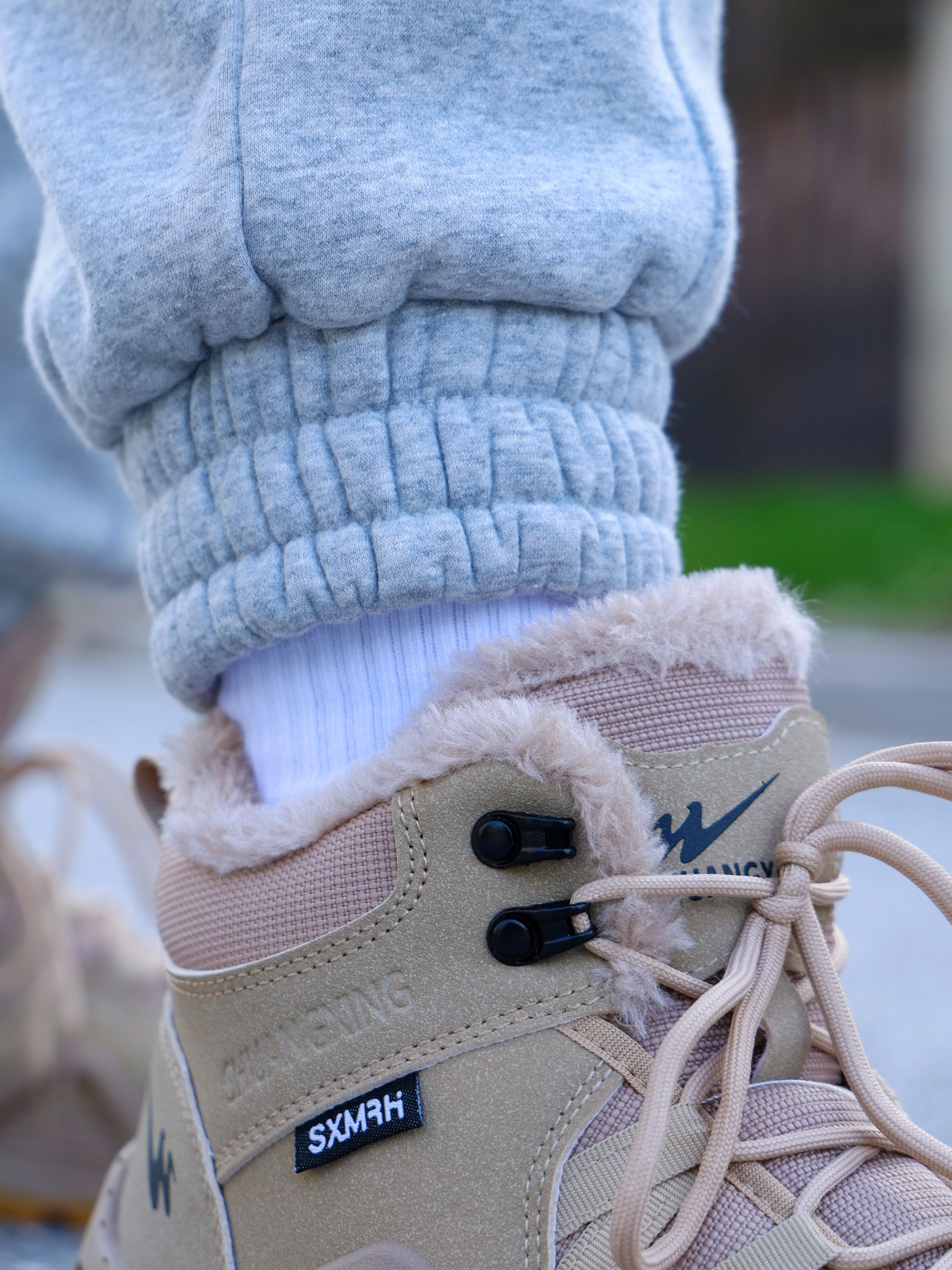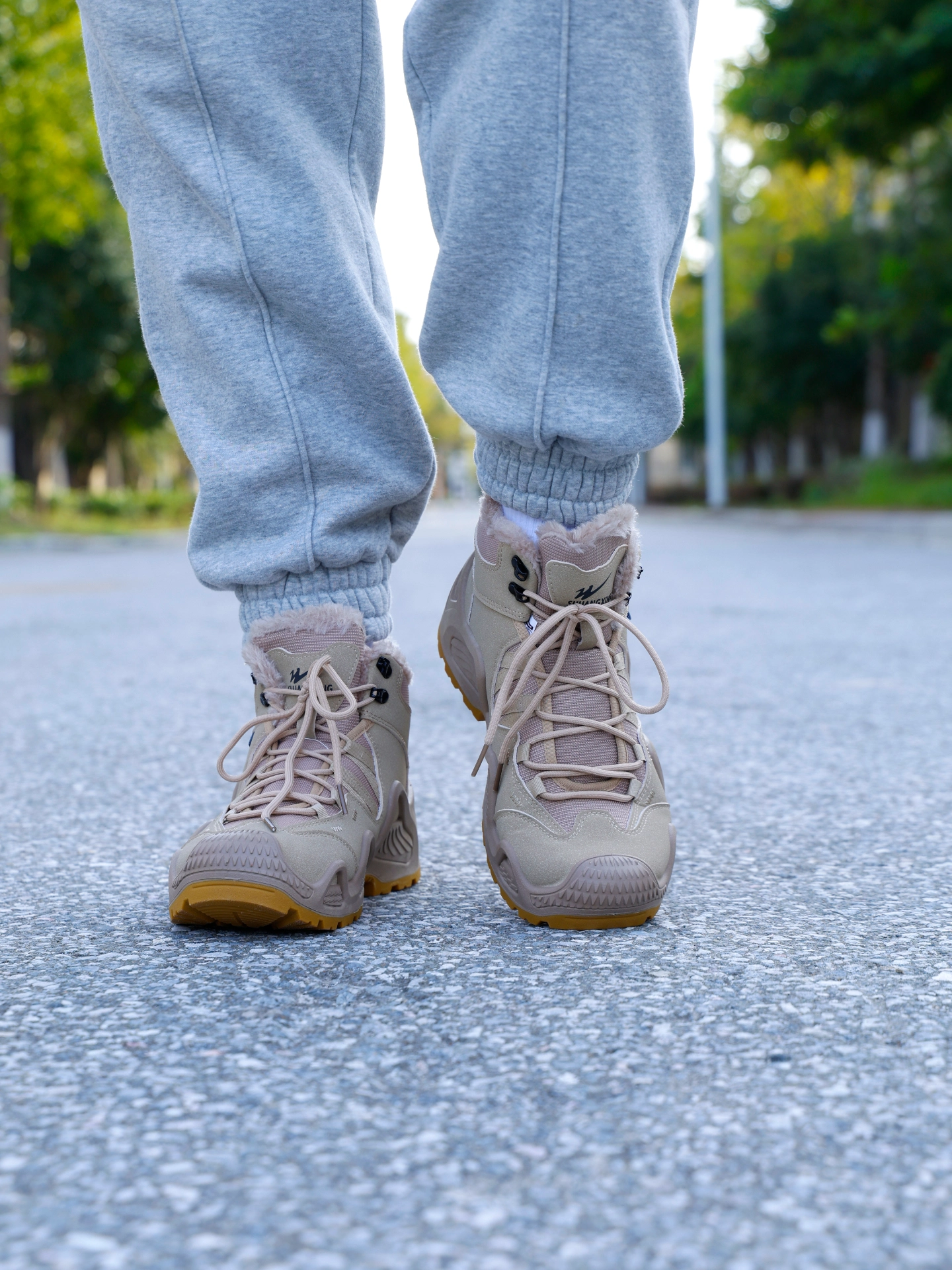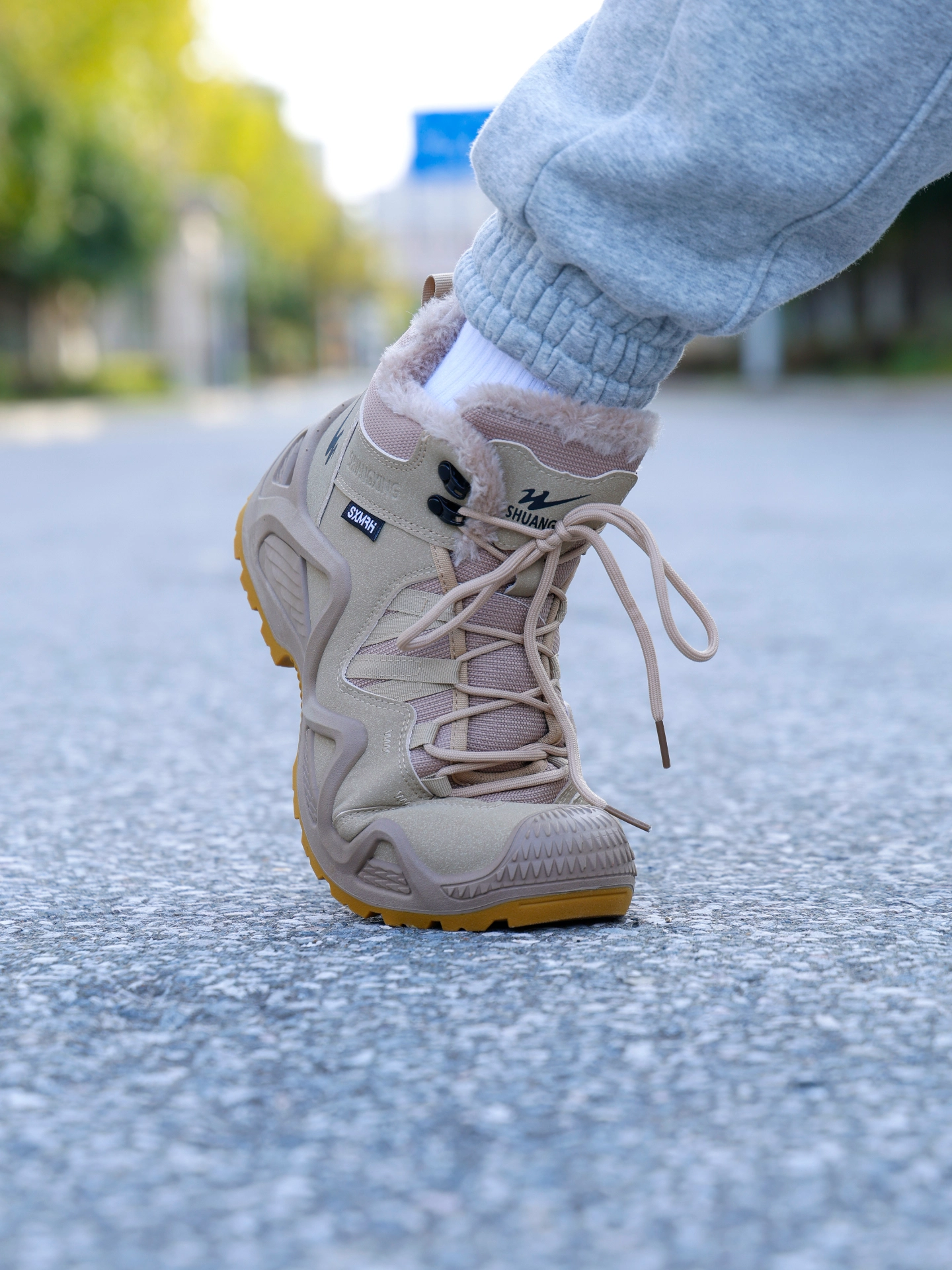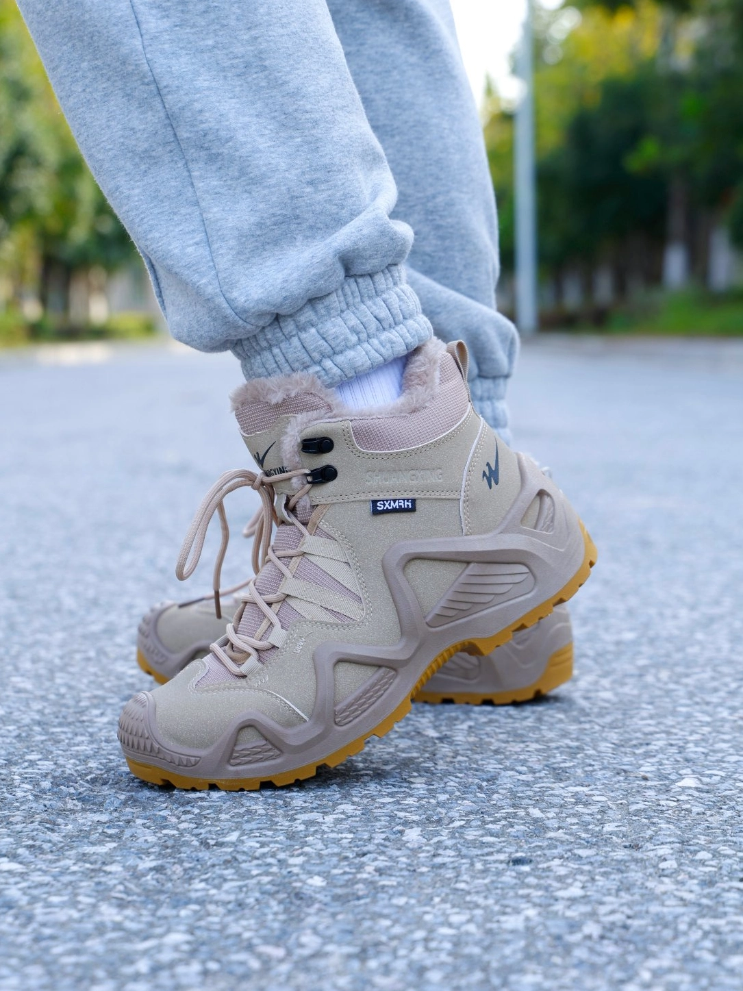 硬核徒步者的“万能鞋”:耐磨、防滑、能扛零下天 这双米杏色靴子初看低调,实则暗藏玄机。加厚牛筋大底像装了“吸盘”——走湿滑青石板不打滑,攀30度缓坡也能稳住跟。毛绒内里暖到能扛零下5℃,去年冬天我穿它踏过3cm积雪,脚面都没渗湿气。最硬核的是鞋身——头层牛皮+防刮涂层,灌木丛里穿行两周没刮花,鞋头还顶住了两次石头磕碰。 如今它成了我户外包的“常驻嘉宾”:穿它走30公里山路,脚踝没酸过;露营...