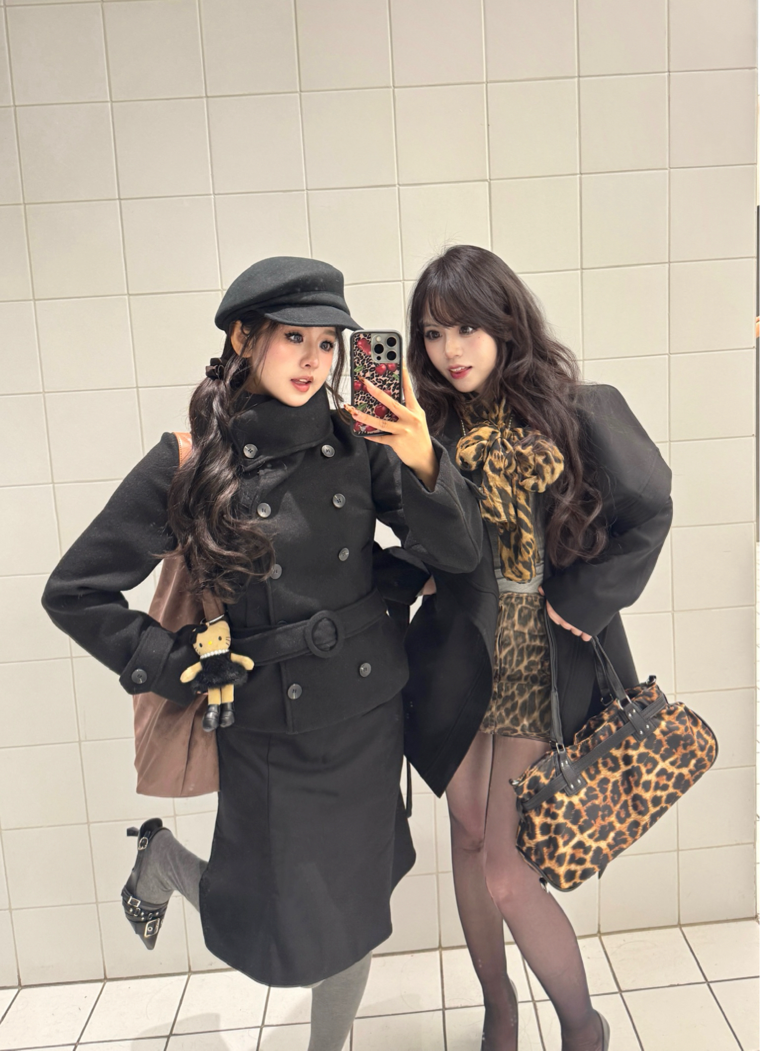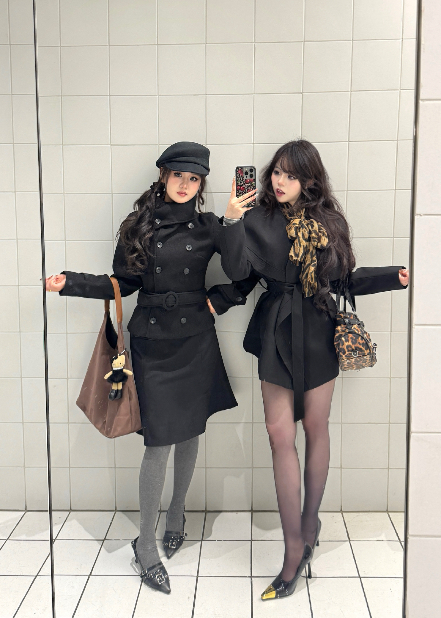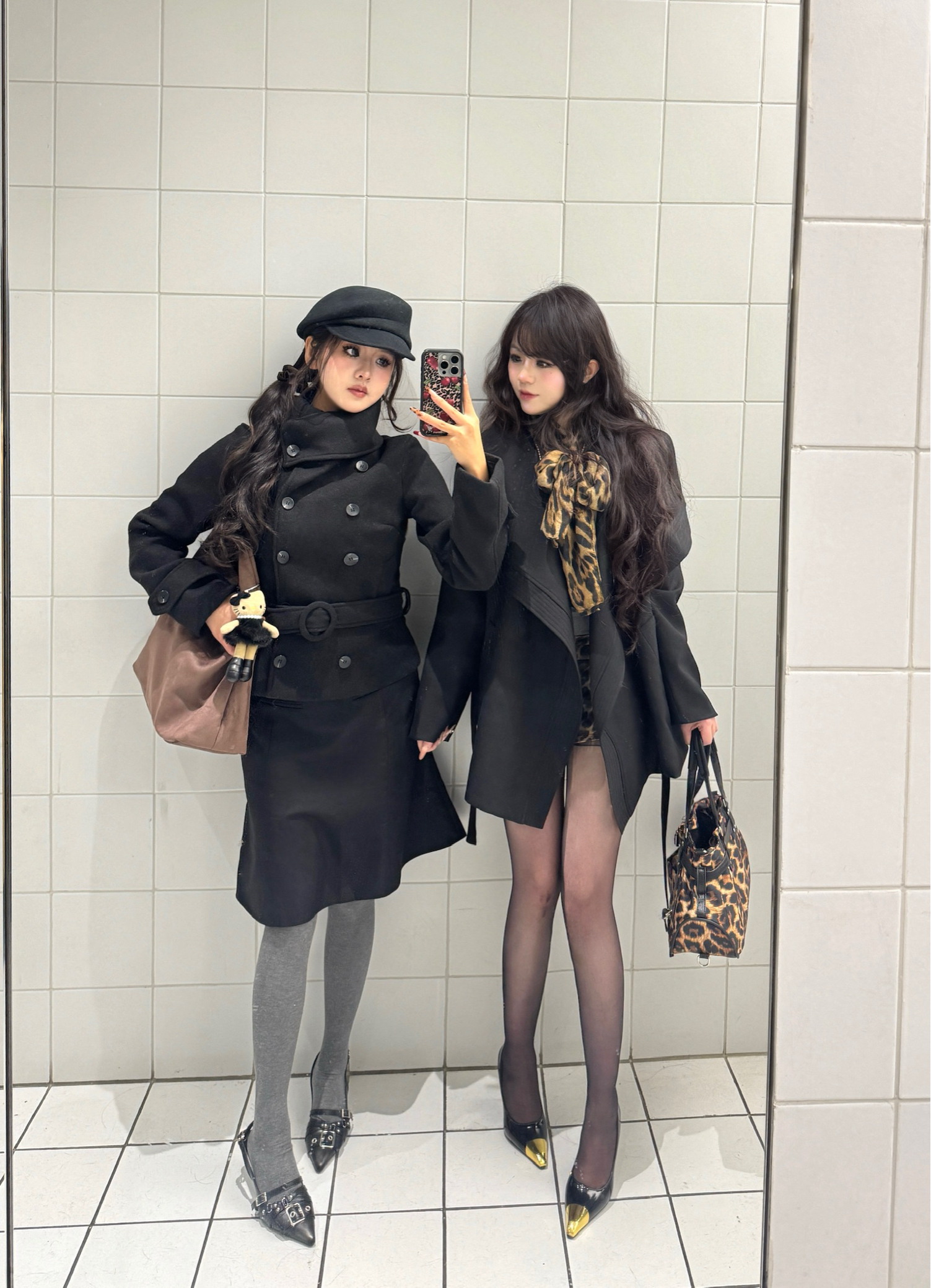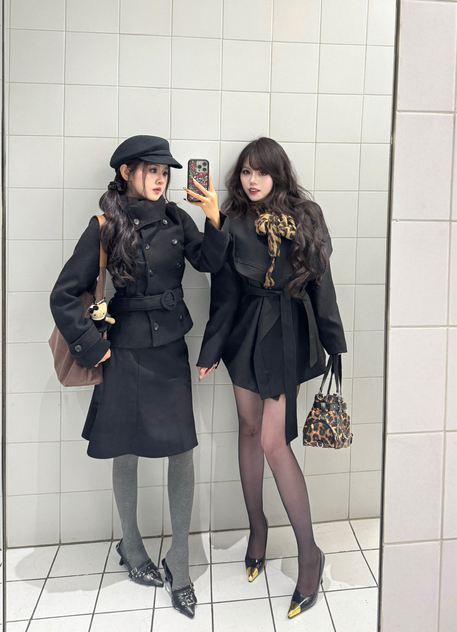 今天和姐妹的黑系出街搭子局,两套都是“不用动脑但赢很大”的秋冬公式👇 左边甜酷款(适合想藏肉/走学院拽姐风): 短款收腰黑大衣+半裙,配灰色连裤袜+带扣小皮鞋,贝雷帽压一压长发,棕包挂个玩偶直接甜酷中和——梨形身材这么穿,腰细胯遮得明明白白。 右边辣妹款(适合小个子/想露腿但不冻): 长款黑大衣直接当裙穿,内搭同色系短裙,豹纹丝巾+豹纹包做呼应,黑丝配金尖高跟鞋,露腿但靠大衣+厚丝绒面料锁温—...