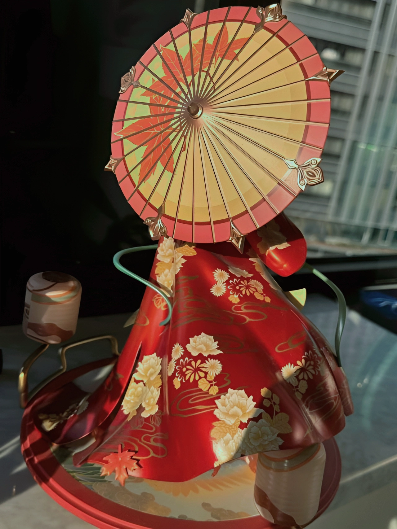 阿离真是绝美,还原度很高,双腿好评,质感超棒。 服饰细节拉满,红色和米黄色的搭配很亮眼。 服装上的图案,伞面的枫叶纹理刻画的也超精致。 色彩涂装均匀,渐变自然。 要注意的是手办本身比较脆弱,小部件越多,不小心碰到越容易损坏,摆放和移动要格外小心。 #更新我的桌面手办 #为手办女神拍组大片 #潮玩手办新品 #怦然心动的玩具 #秀秀我的新手办