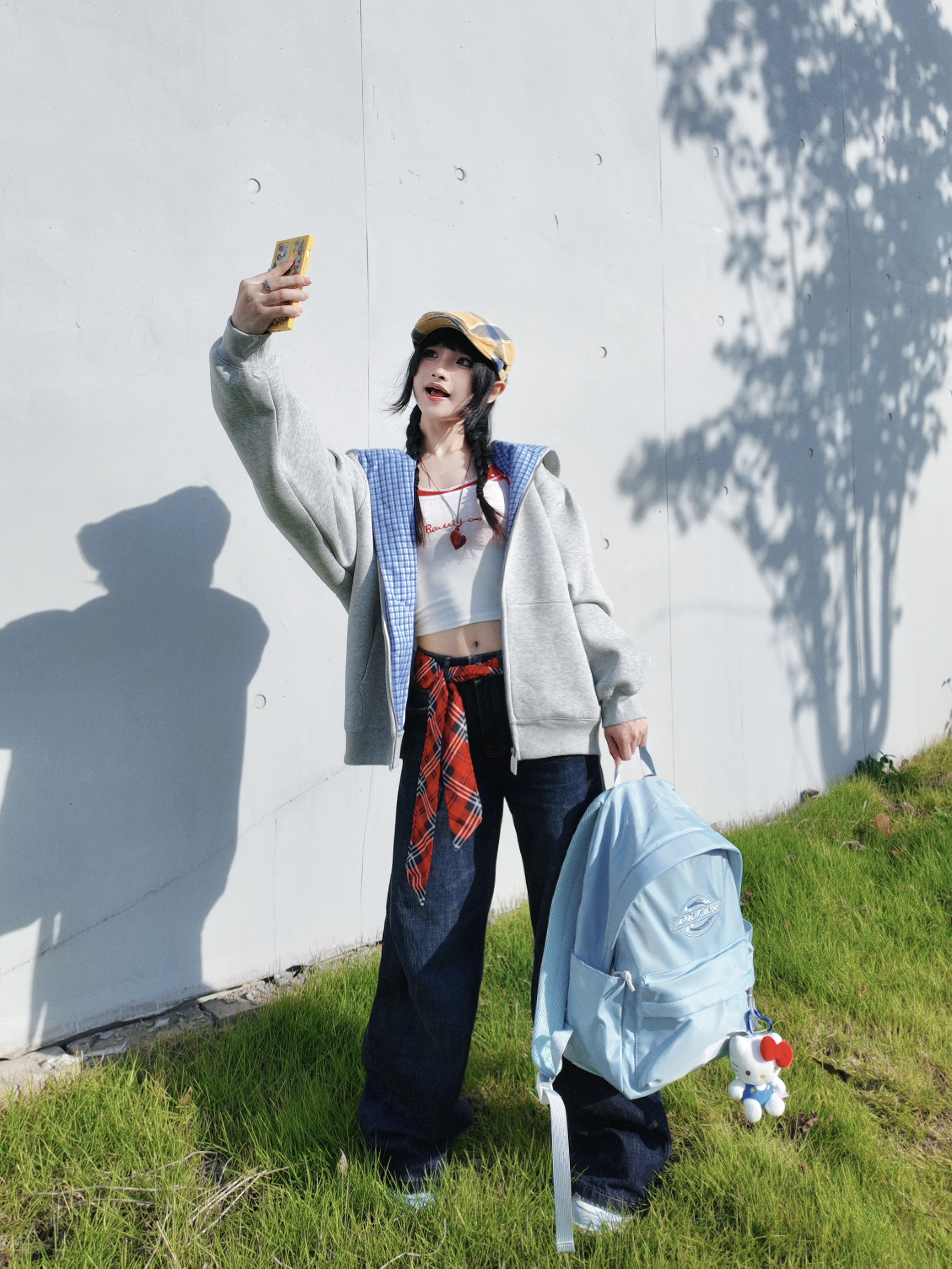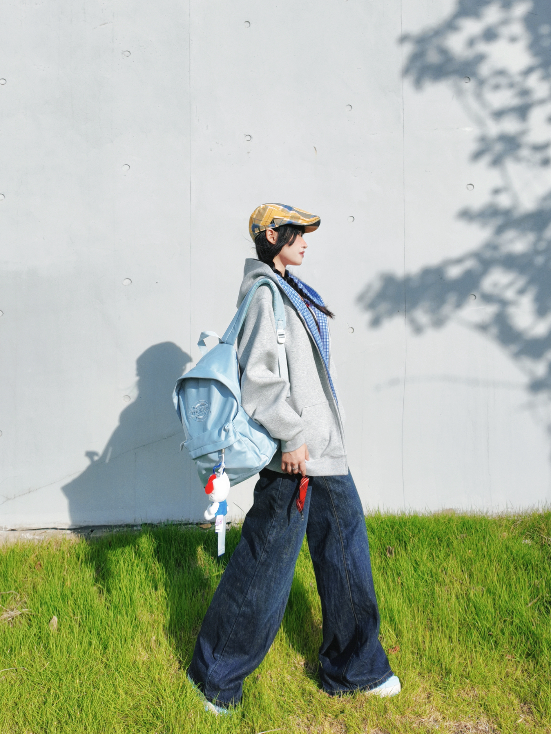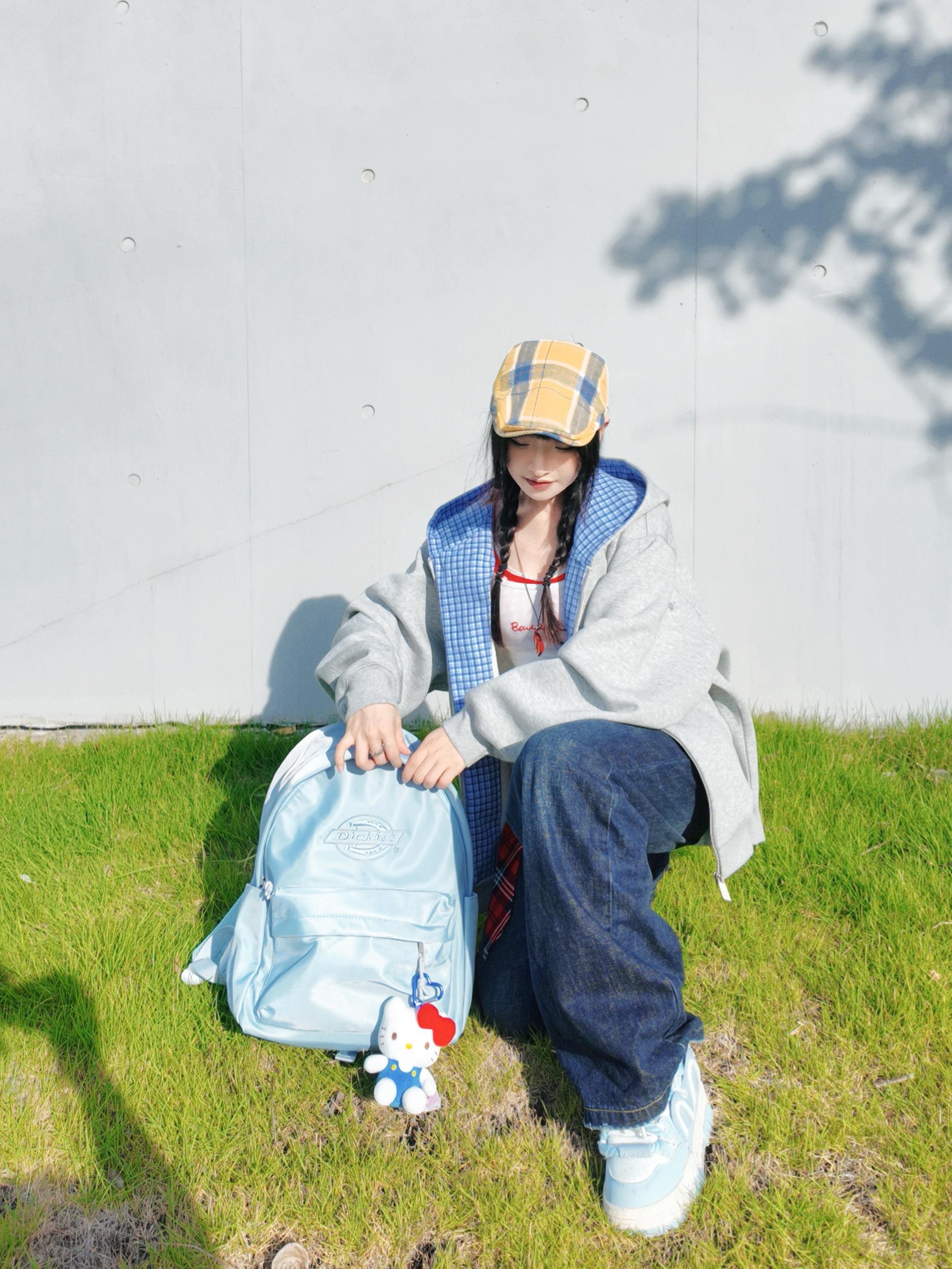 不同颜色的格纹元素被玩出花啦~ 大大的外套慵懒感十足呀 搭配个Baby蓝色🐳双肩包 不仅呼应外套也让整套穿搭更有氛围感哦 最近真滴很爱这种淡彩色~ 搭配个可可爱爱滴小包挂🎒更好看啦 Logo是刺绣滴小小的书包还挺能装呀~ 塞了平板和一些零散的东西还放下两件衣服👍🏻 阳光下☀️穿这套嘎嘎出片呀