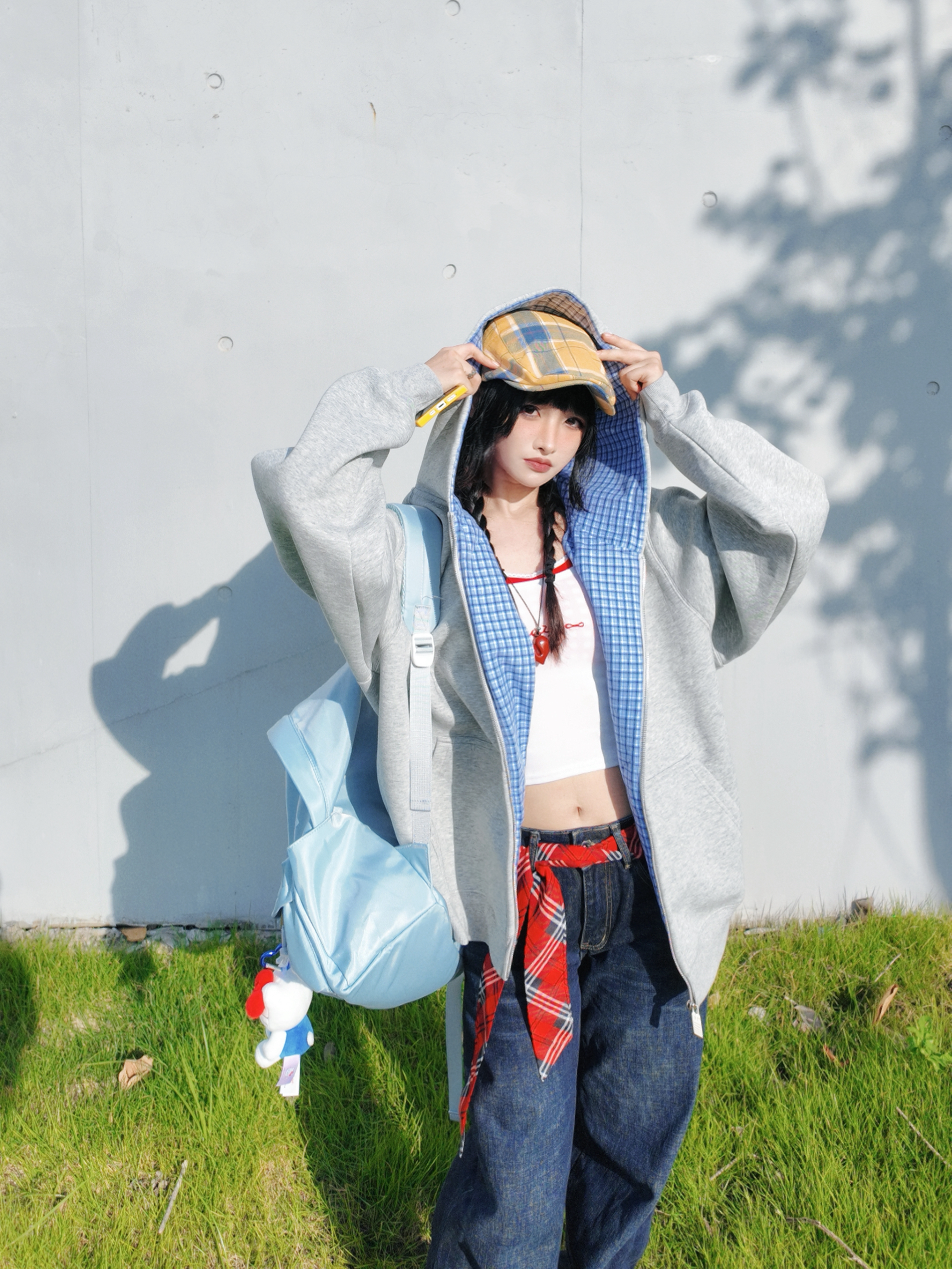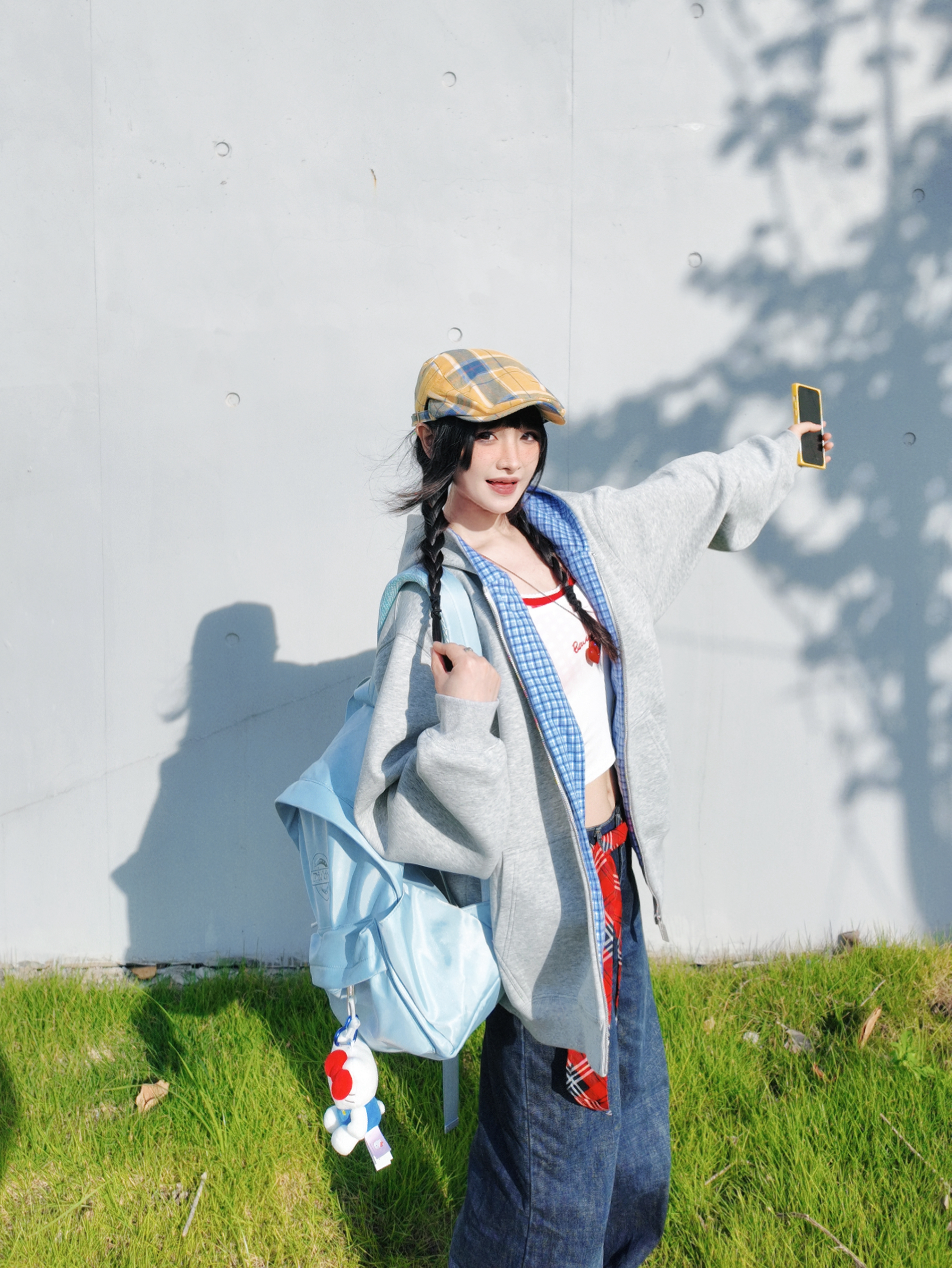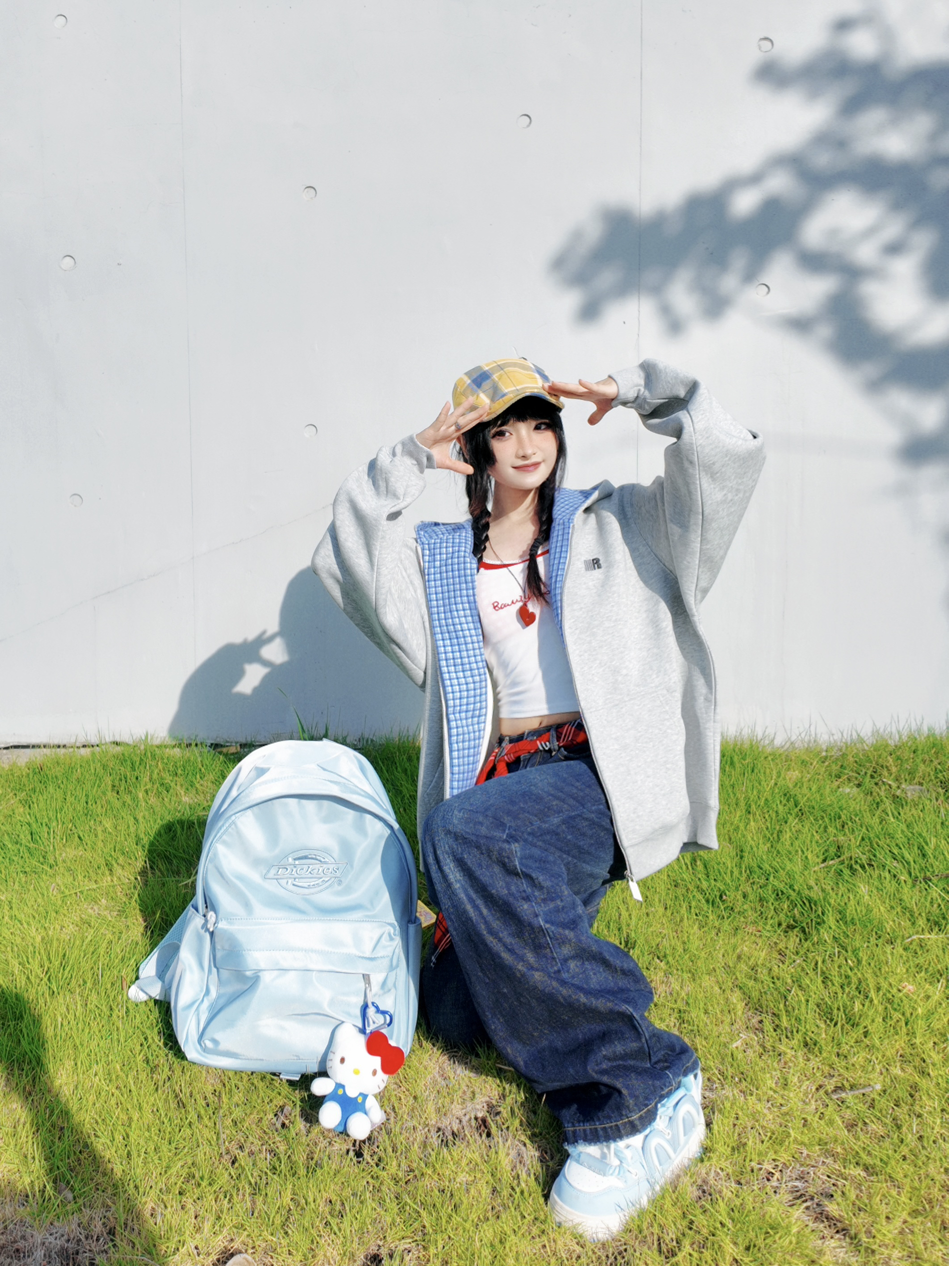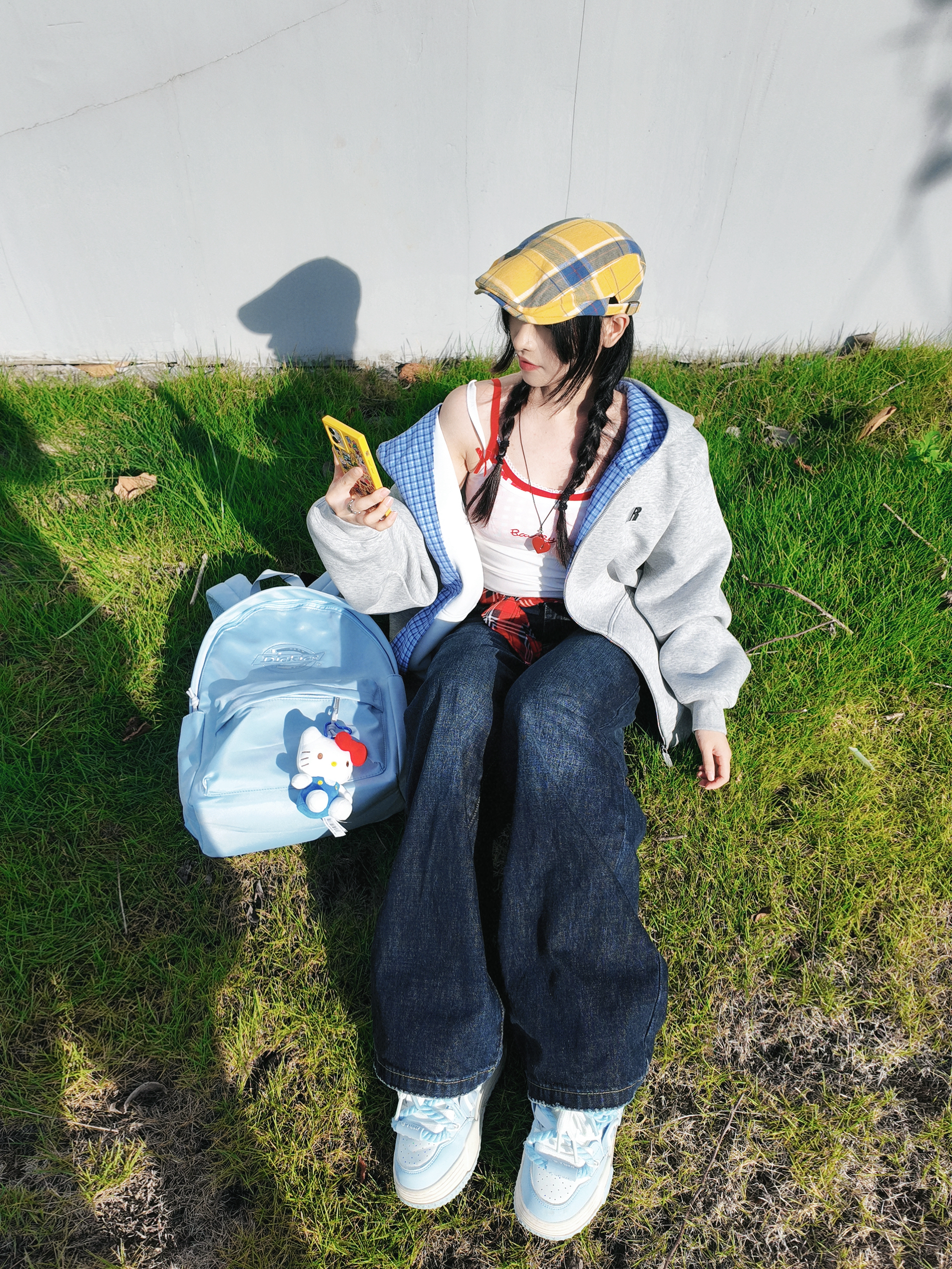 不同颜色的格纹元素被玩出花啦~ 大大的外套慵懒感十足呀 搭配个Baby蓝色🐳双肩包 不仅呼应外套也让整套穿搭更有氛围感哦 最近真滴很爱这种淡彩色~ 搭配个可可爱爱滴小包挂🎒更好看啦 Logo是刺绣滴小小的书包还挺能装呀~ 塞了平板和一些零散的东西还放下两件衣服👍🏻 阳光下☀️穿这套嘎嘎出片呀