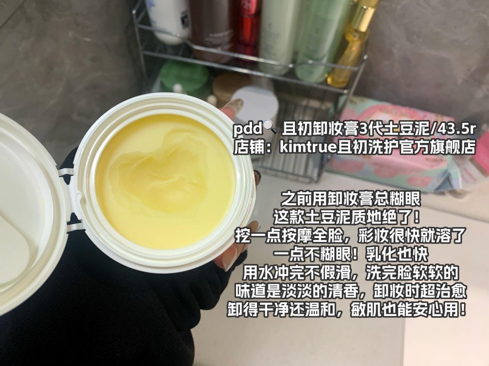 从pdd🔍入手的护肤全套好物~把我的架子都填满了!无踩雷都是自用款 - pdd🔍且初卸妆膏3代土豆泥 店铺:kimtrue且初洗护官方旗舰店 这款土豆泥质地绝了!挖一点按摩全脸,彩妆很快就溶了,一点不糊眼。乳化也快,用水冲完不假滑,洗完脸软软的,味道是淡淡的清香,卸妆时超治愈,卸得干净还温和! - pdd🔍芷豆控油水乳 店铺:芷豆官方旗舰店 油皮夏天太需要这套水乳了!水是清爽的爽肤水,拍开秒吸收;...