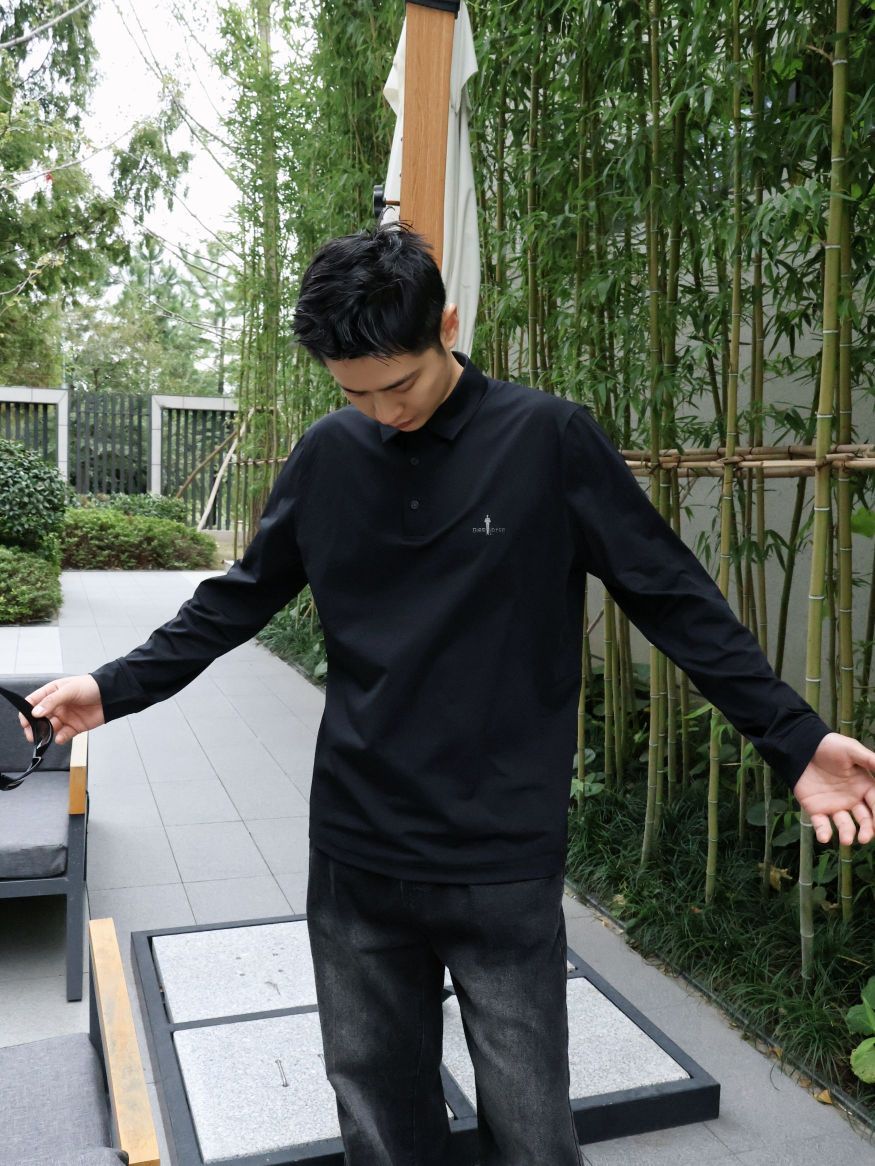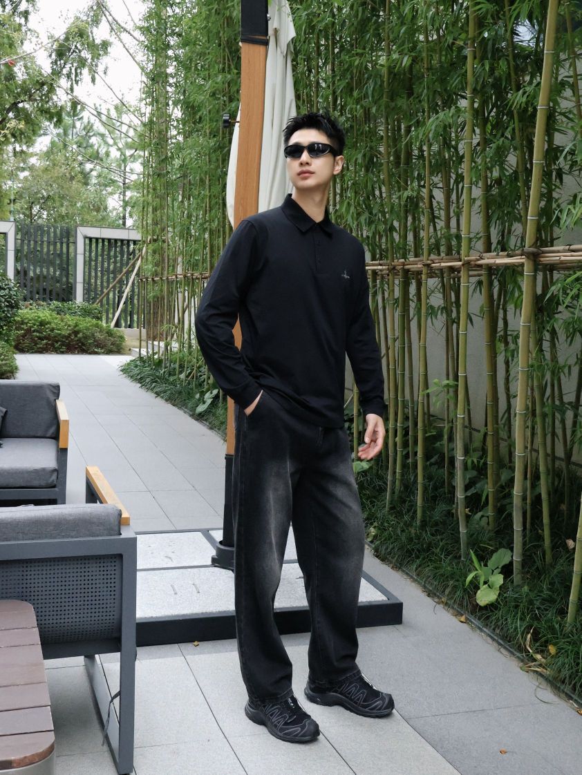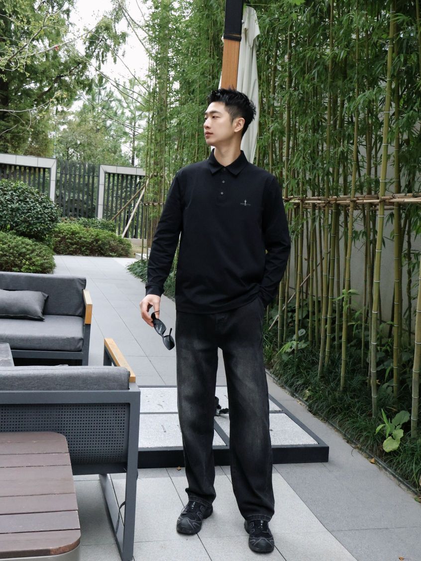 型男秋季的医美|长袖polo衫我爱了~秋季单穿polo衫是不错的选择~ #比音勒芬 百搭潮流长袖polo衫~ 衣服黑色的显身材~ 整体面料透气性还是很好的~ 整体版型贴肤感高级~ 搭配起来简约清爽的~ 小倪:181cm 70kg 上身xl合身~ 是复古牛仔裤~ 百搭时尚~也很舒服~ 是户外马丁靴~ 日常通勤舒适增高的~