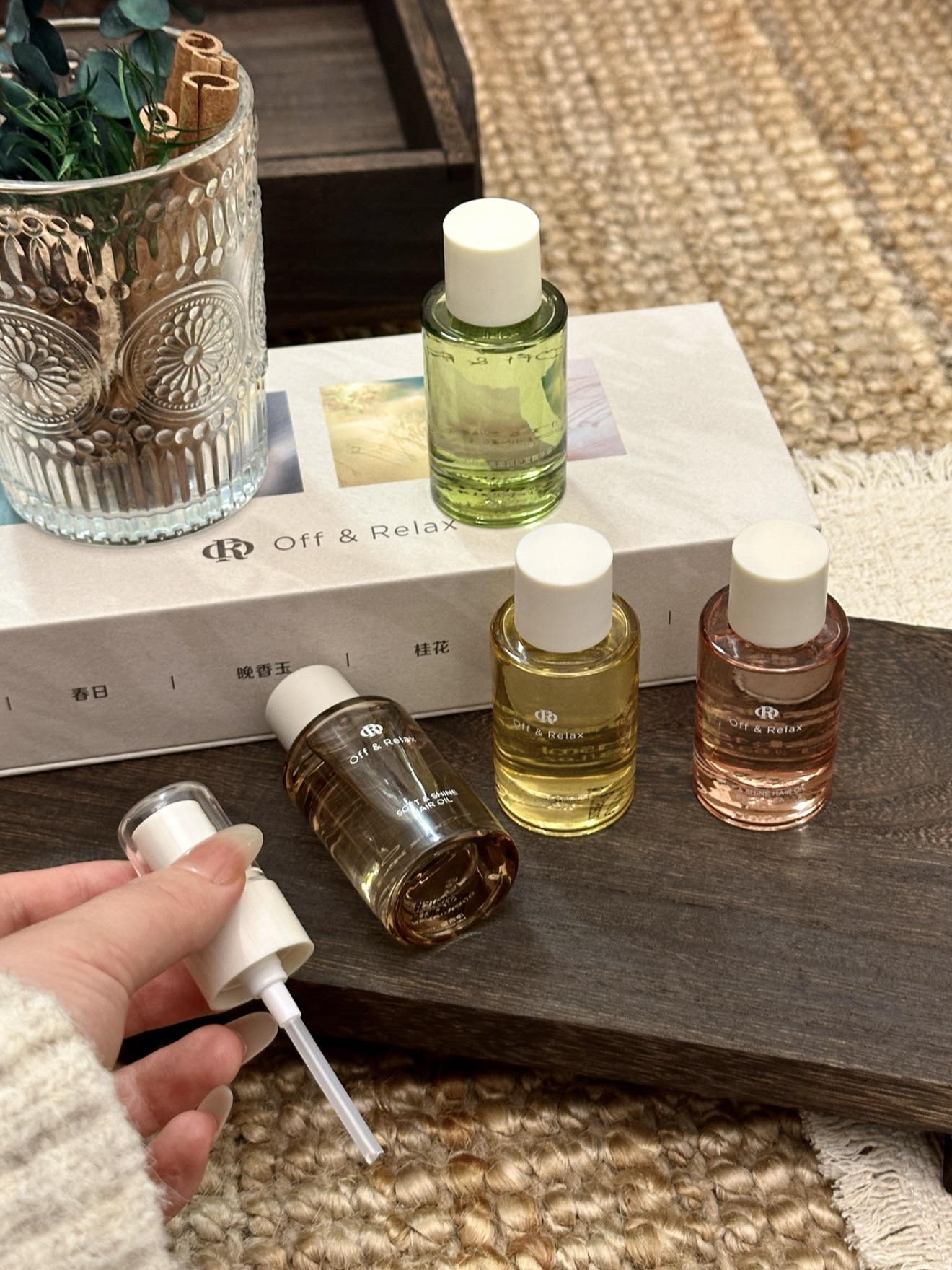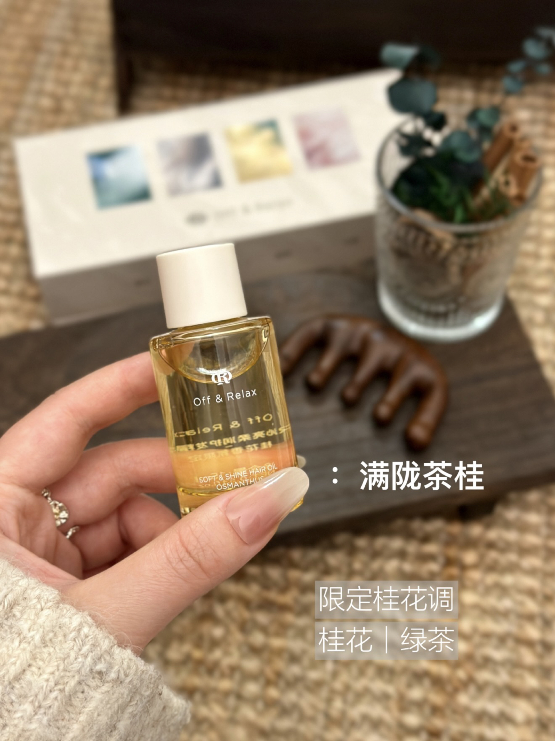 off relax的介个四季护发精油礼盒好好看哇 打开之后有四瓶香味不同的护发精油 我感觉闻起来是那种淡淡的清香 现在正值秋天 就很适合用这支满陇桂花 挤出来是那种水感一样的质地 我每次洗完头发之后会用它涂抹在发梢 等头发干透之后有种丝滑柔顺的感觉 一年四季都能用