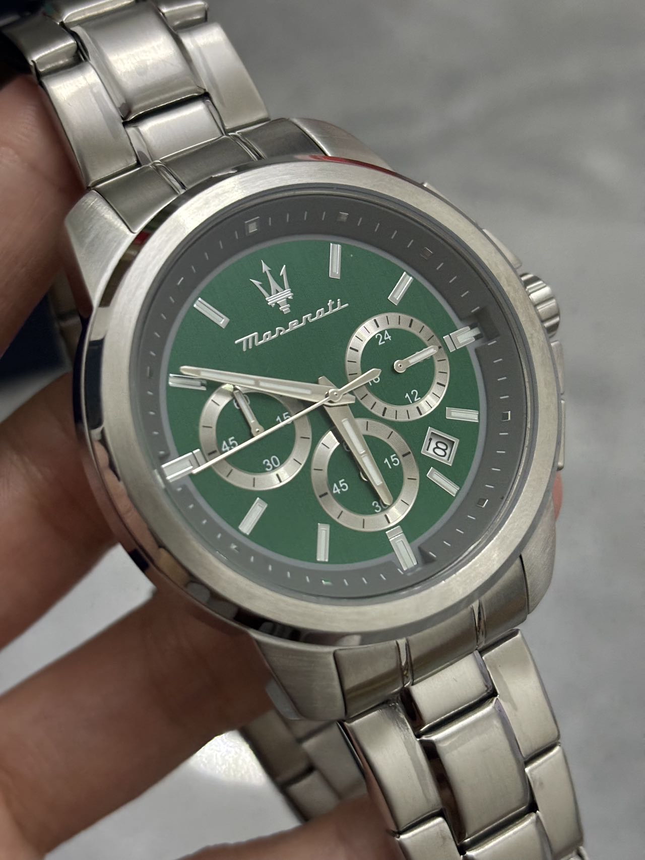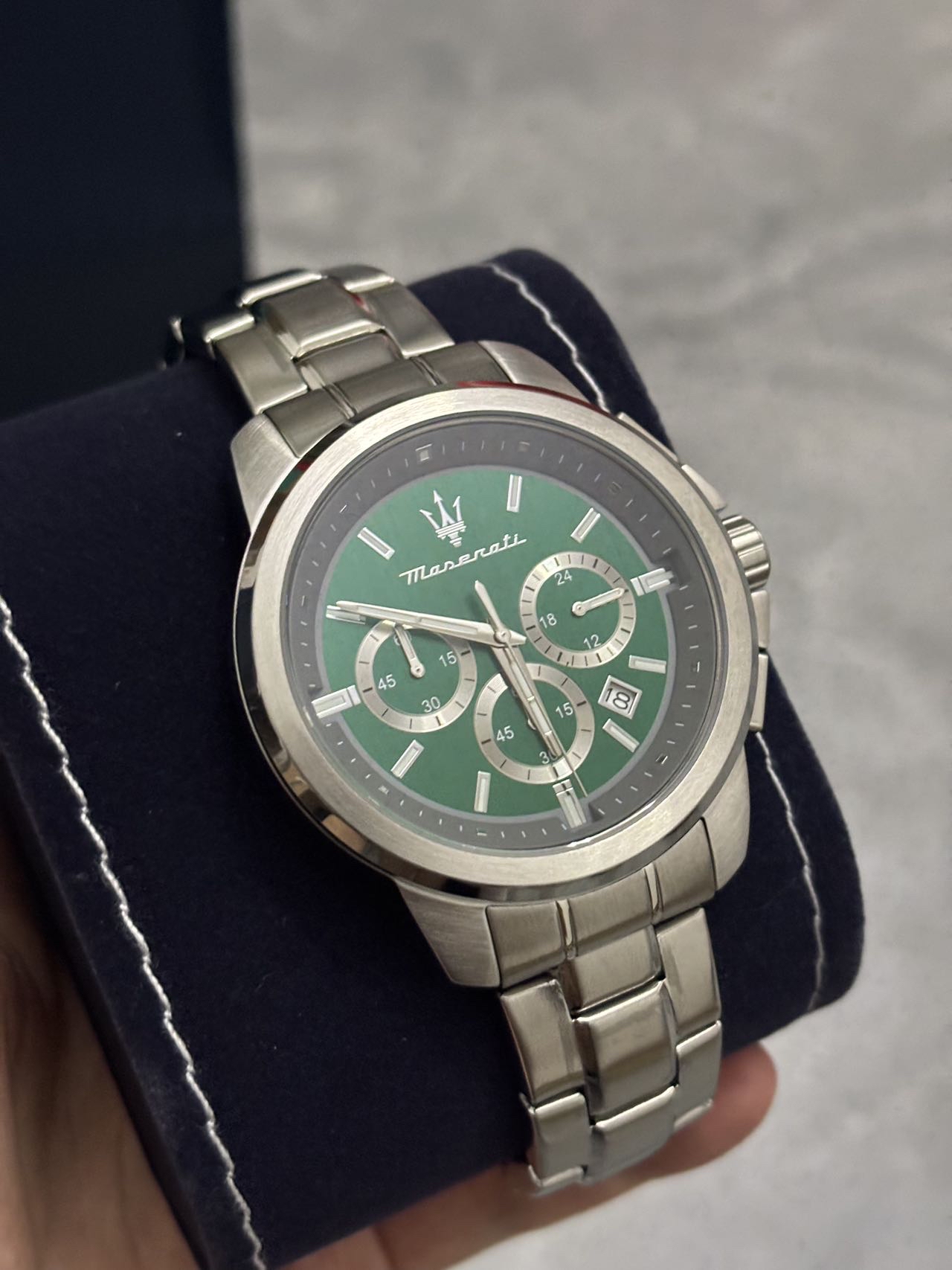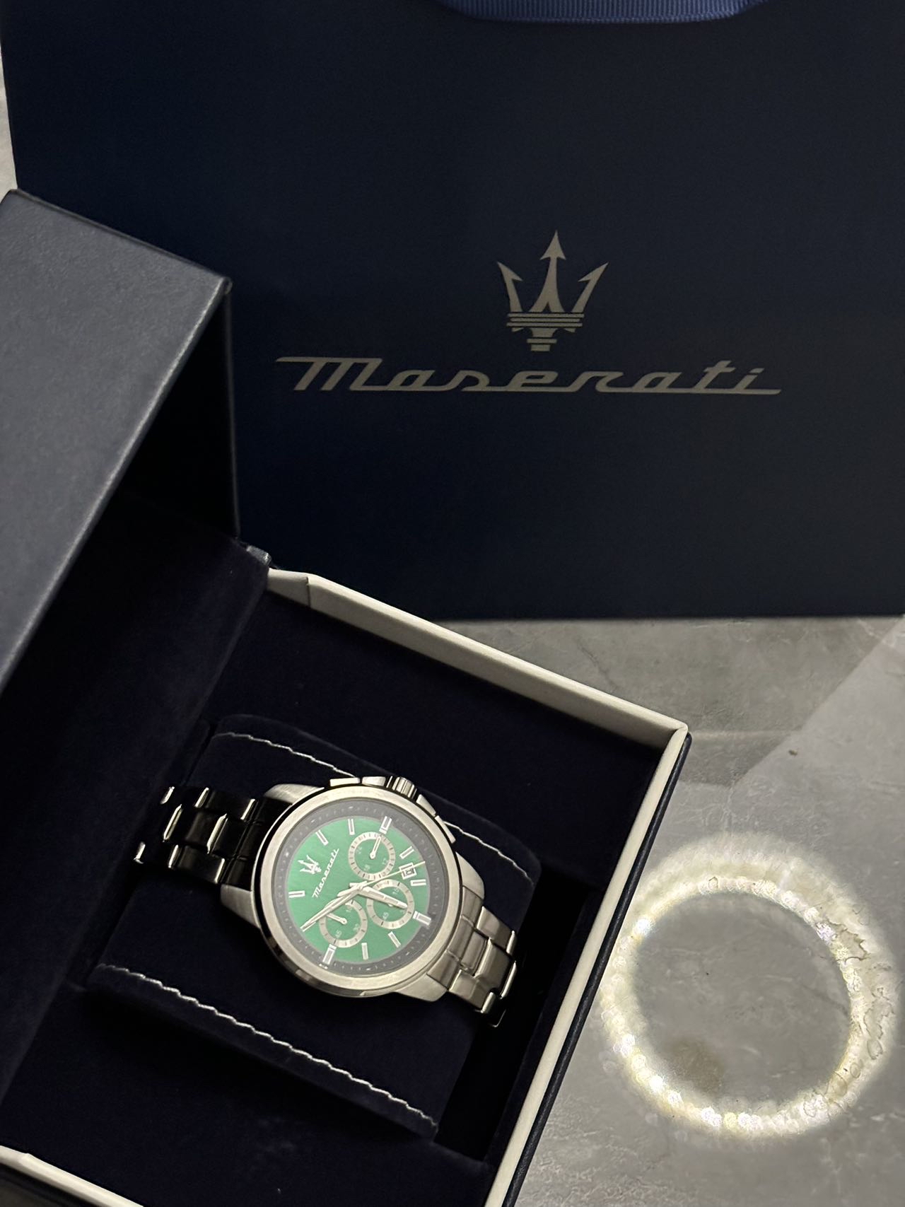 谁懂啊家人们!我给对象挑到超合适的礼物啦🎁 玛莎拉蒂介块表,圆形表盘配绿色,银色钢带一整个大气住~戴起来高级又沉稳,商务场合戴完全hold住!不过表径对手腕特细的男生可能有点大🤔 但整体送出去倍有面,男生收到直接狂喜谁懂!