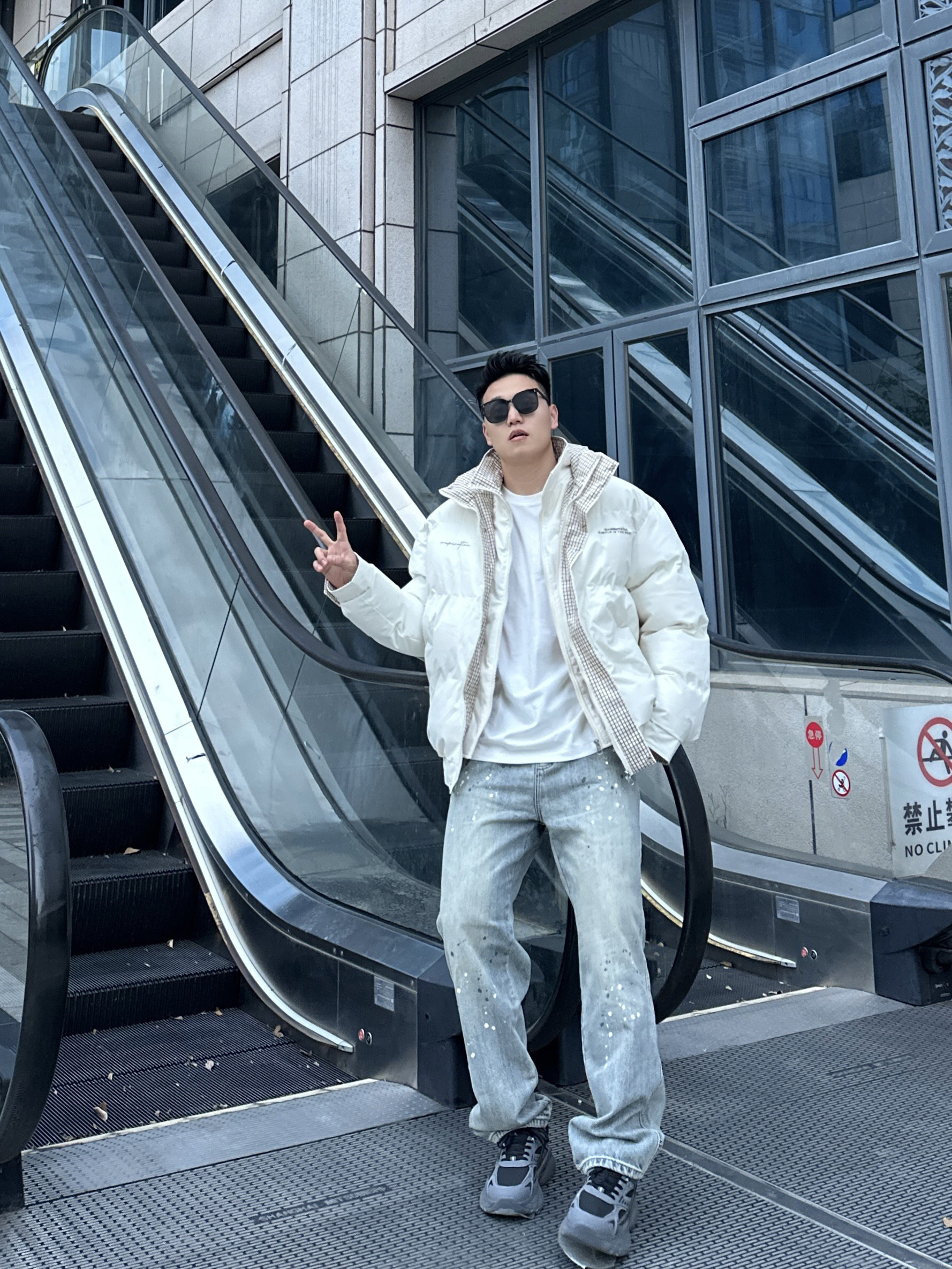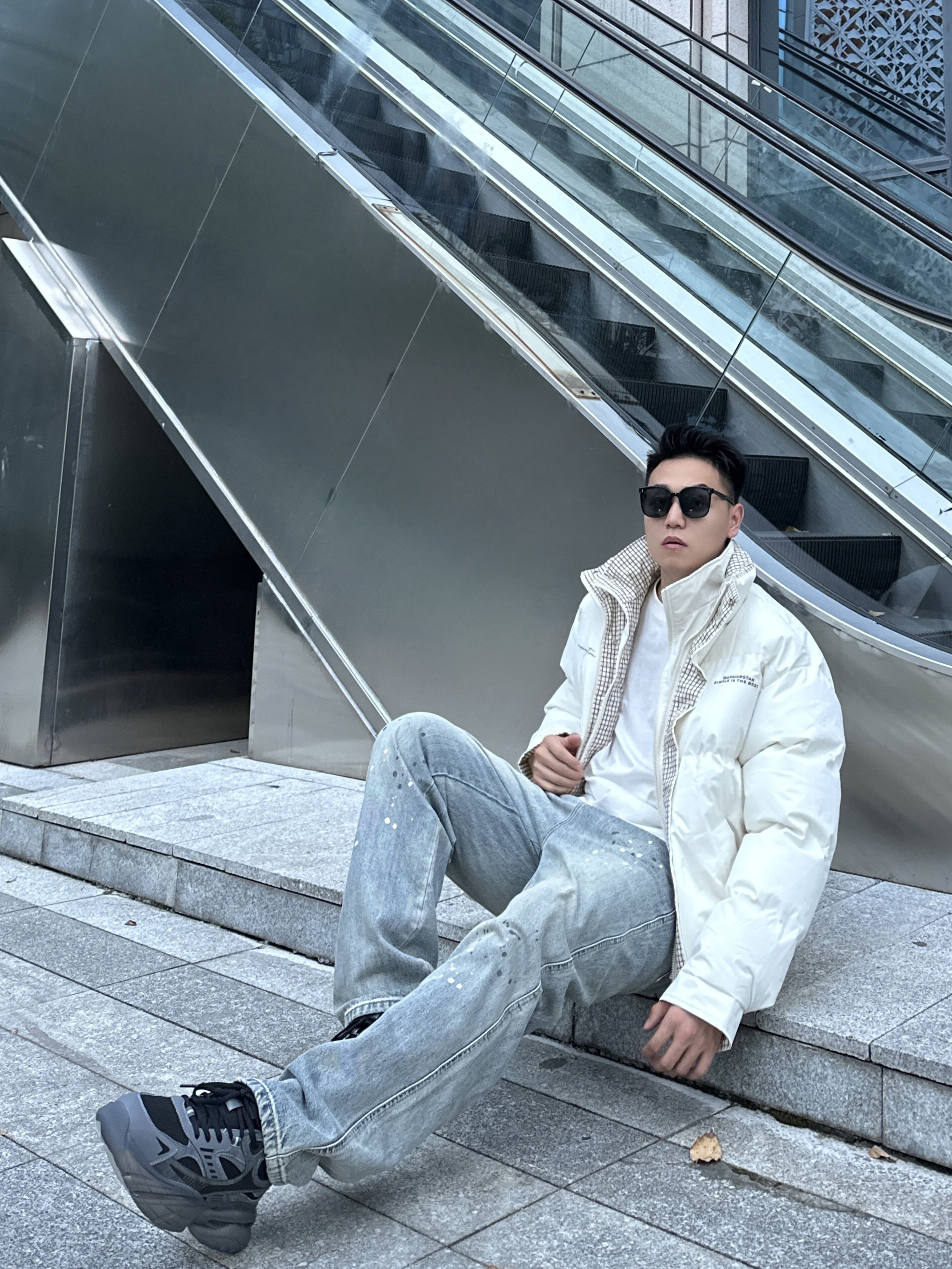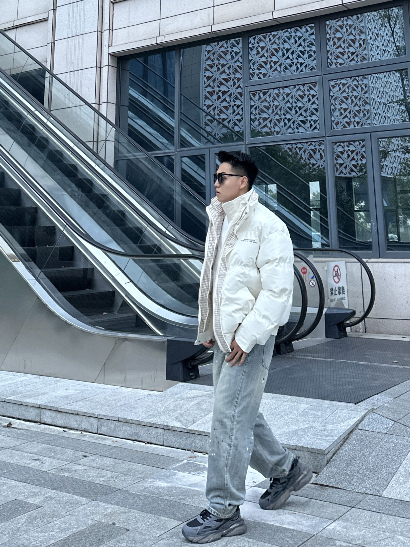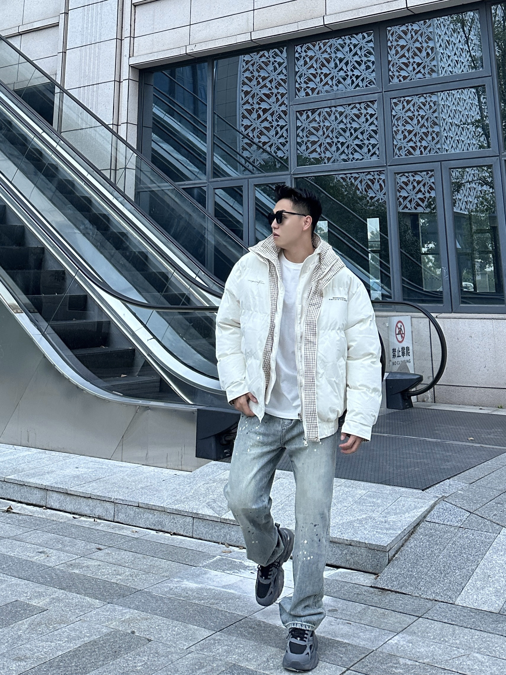 今天的穿搭很适合秋冬哦 白色和棕色格纹撞色的棉服氛围满满 内搭一件白色T恤层次丰富 搭配上牛仔裤和老爹鞋 帅气百搭又保暖