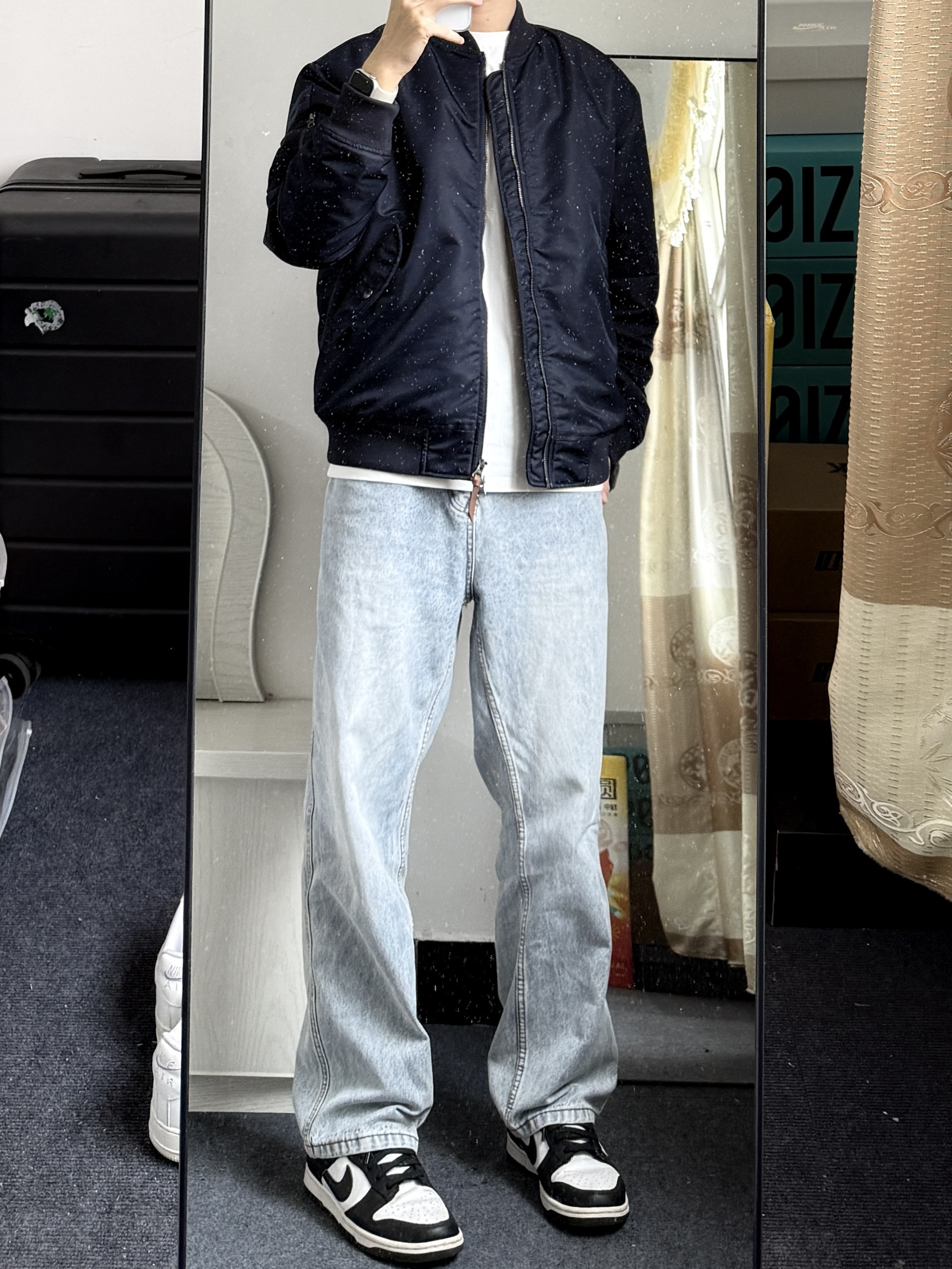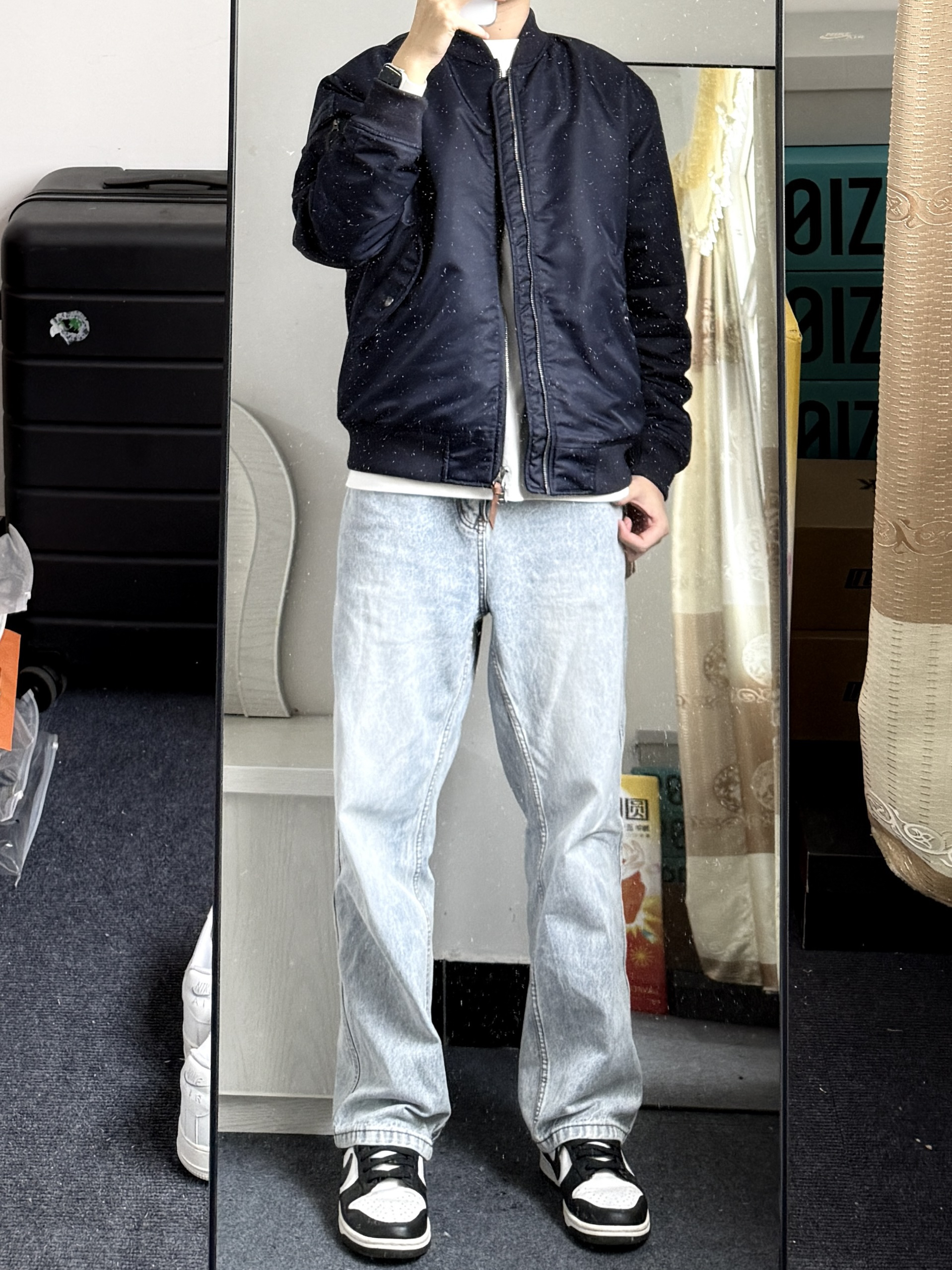 今天穿的是这件蓝色的飞行夹克 这件事加棉的,所以冬天穿也不会觉得冷 搭配了一条浅蓝色的牛仔裤 日常里面再加一个卫衣,冬天穿完全OK的