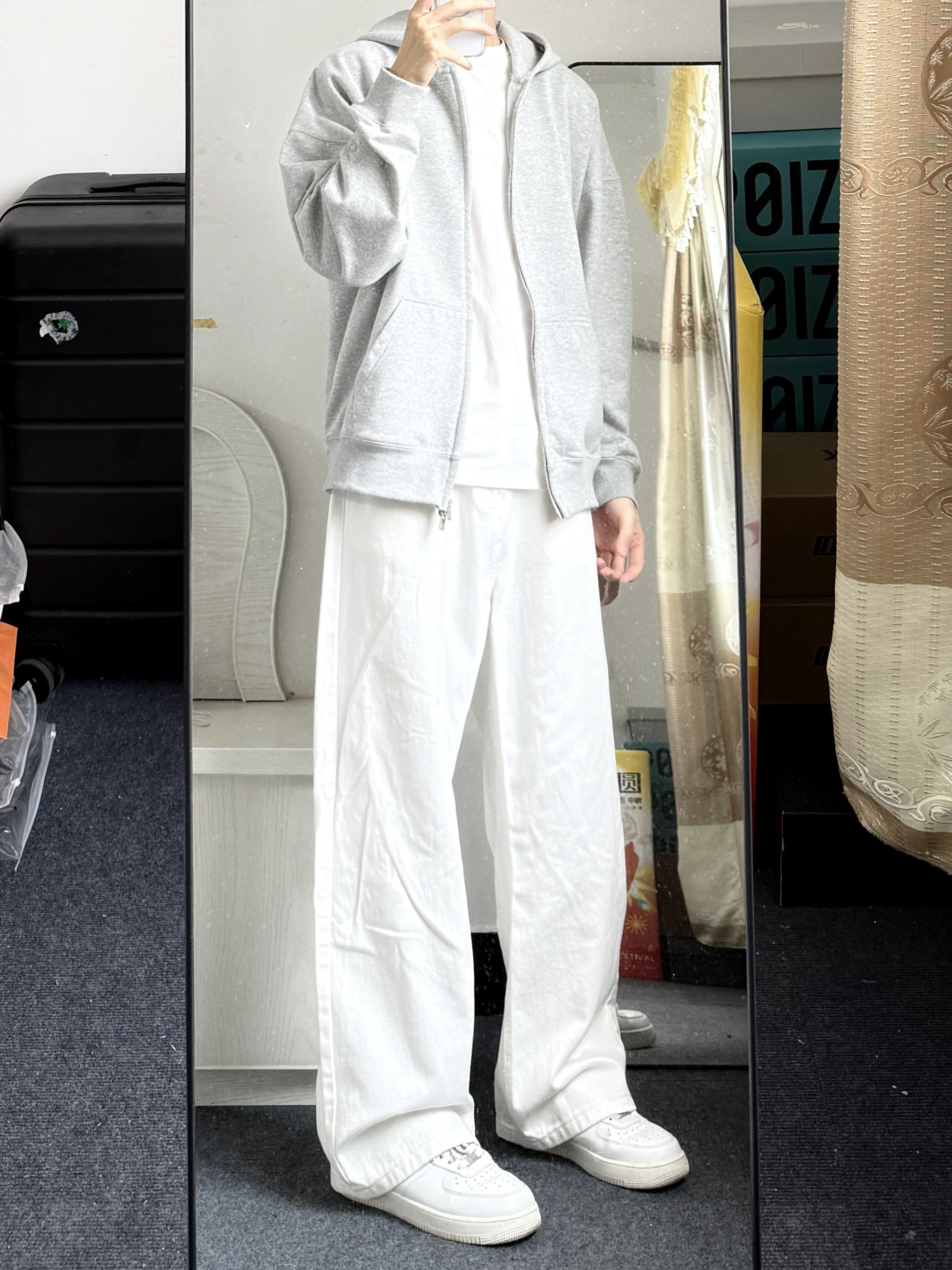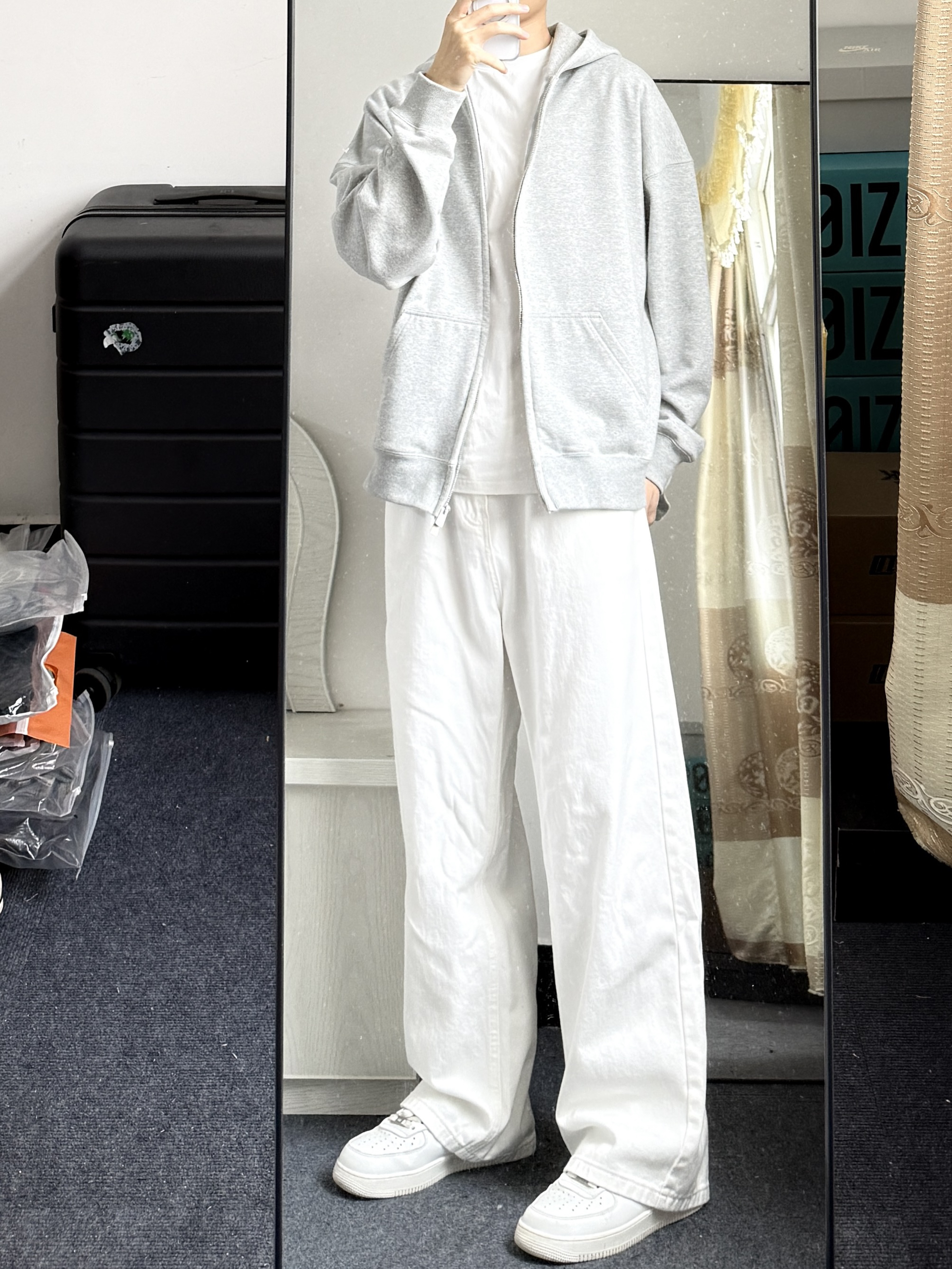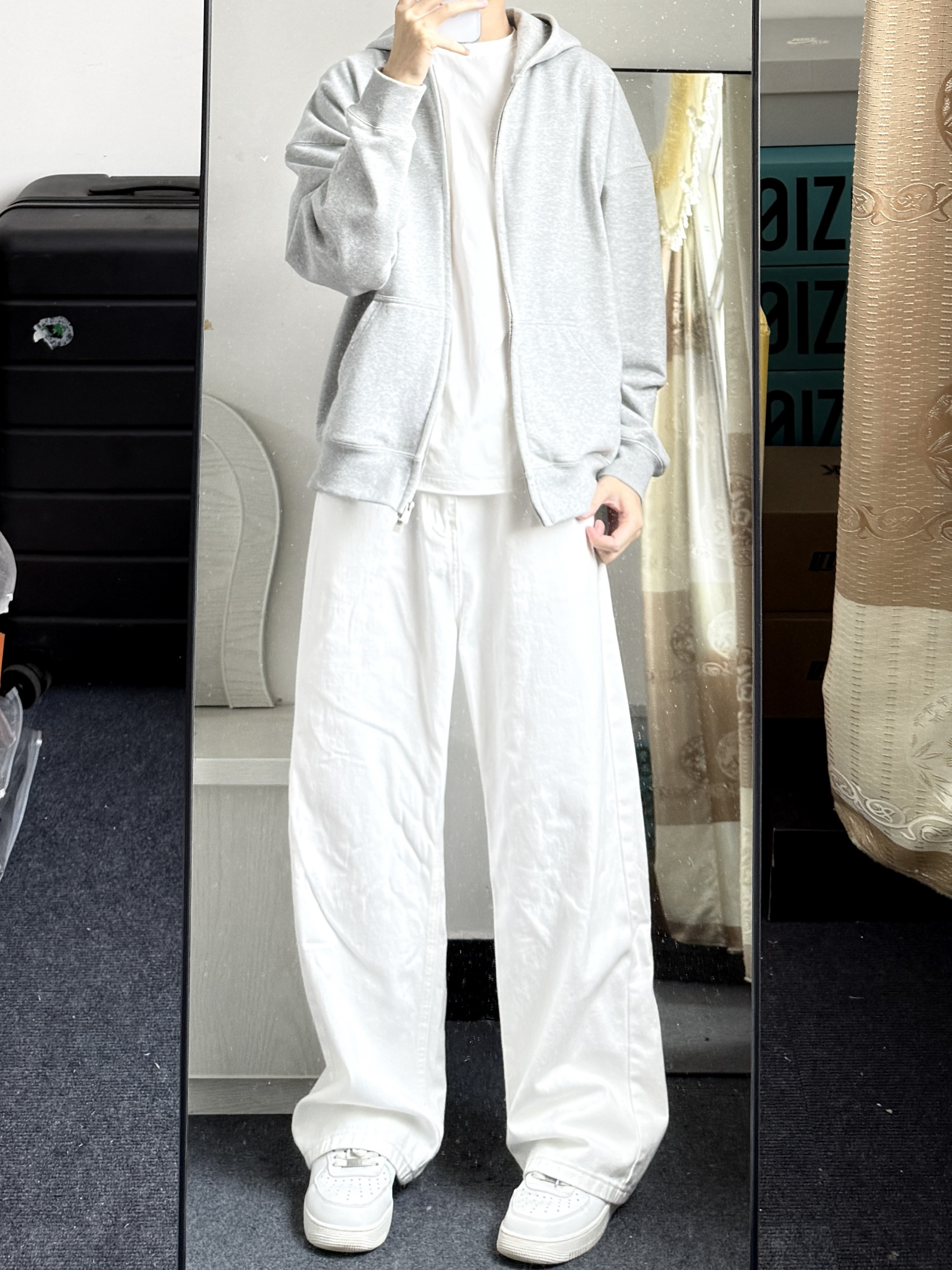 今天穿的是这一条白色的阔腿牛仔裤 喜欢穿宽松风格的宝子,真的不能错过这条裤子哦 上身效果很不错,松弛感拉满,我搭配的是这一件灰色的连帽卫衣,这一身就很适合秋冬来穿