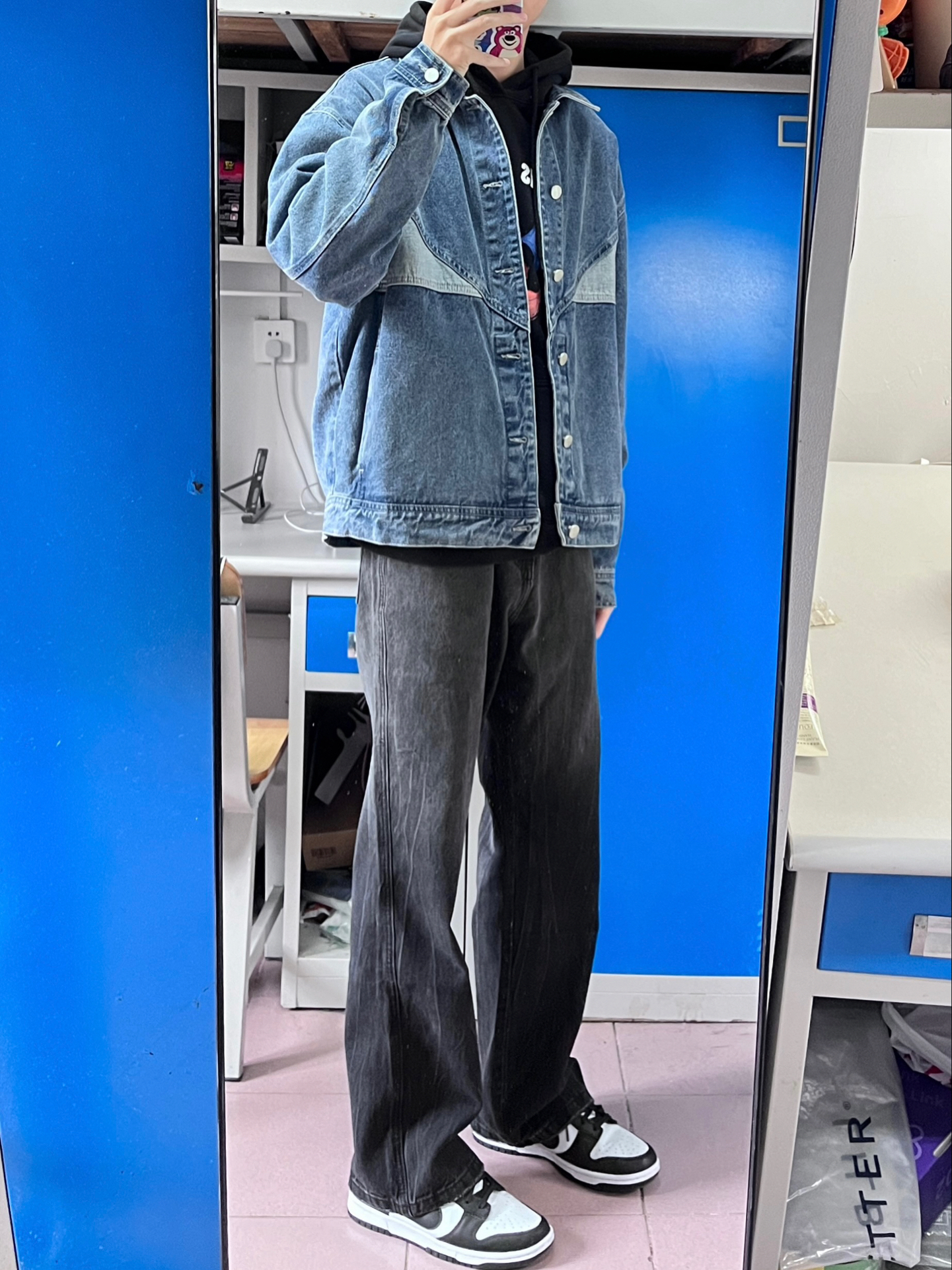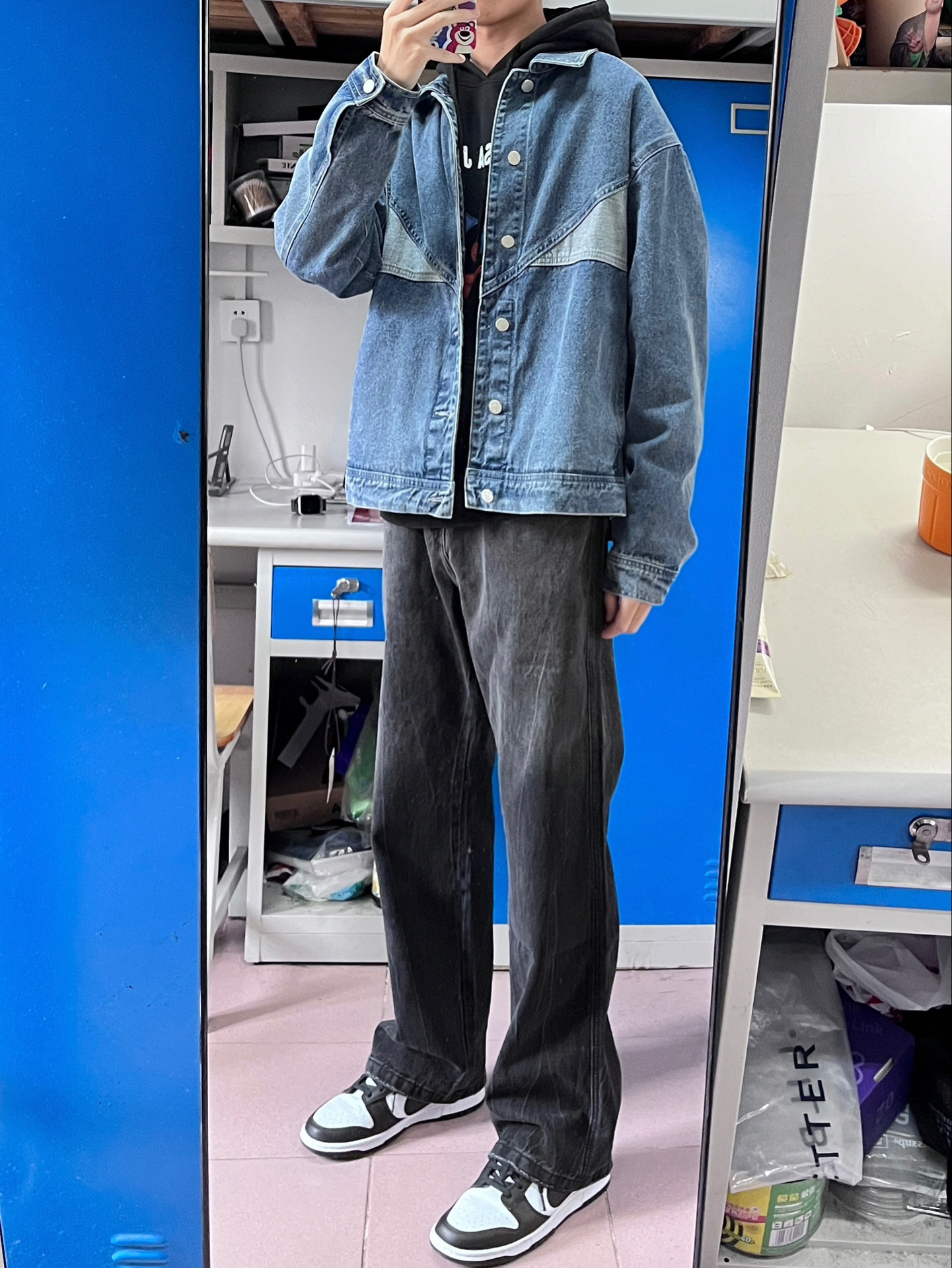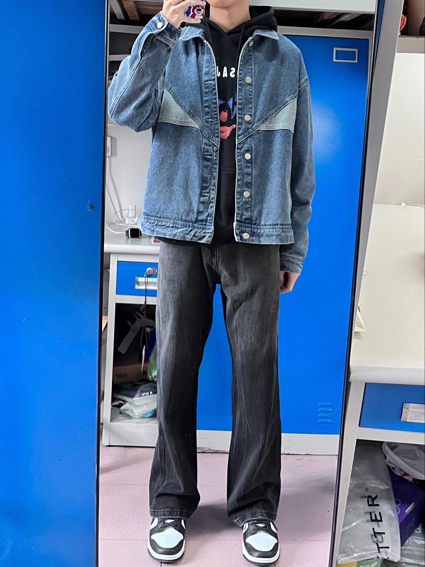 今天穿的是这一件蓝色的牛仔外套 里面搭配了一件连帽卫衣 下半身我选择的是一条百搭的黑色牛仔裤 冬天这样穿不会显得臃肿的同时又很帅气