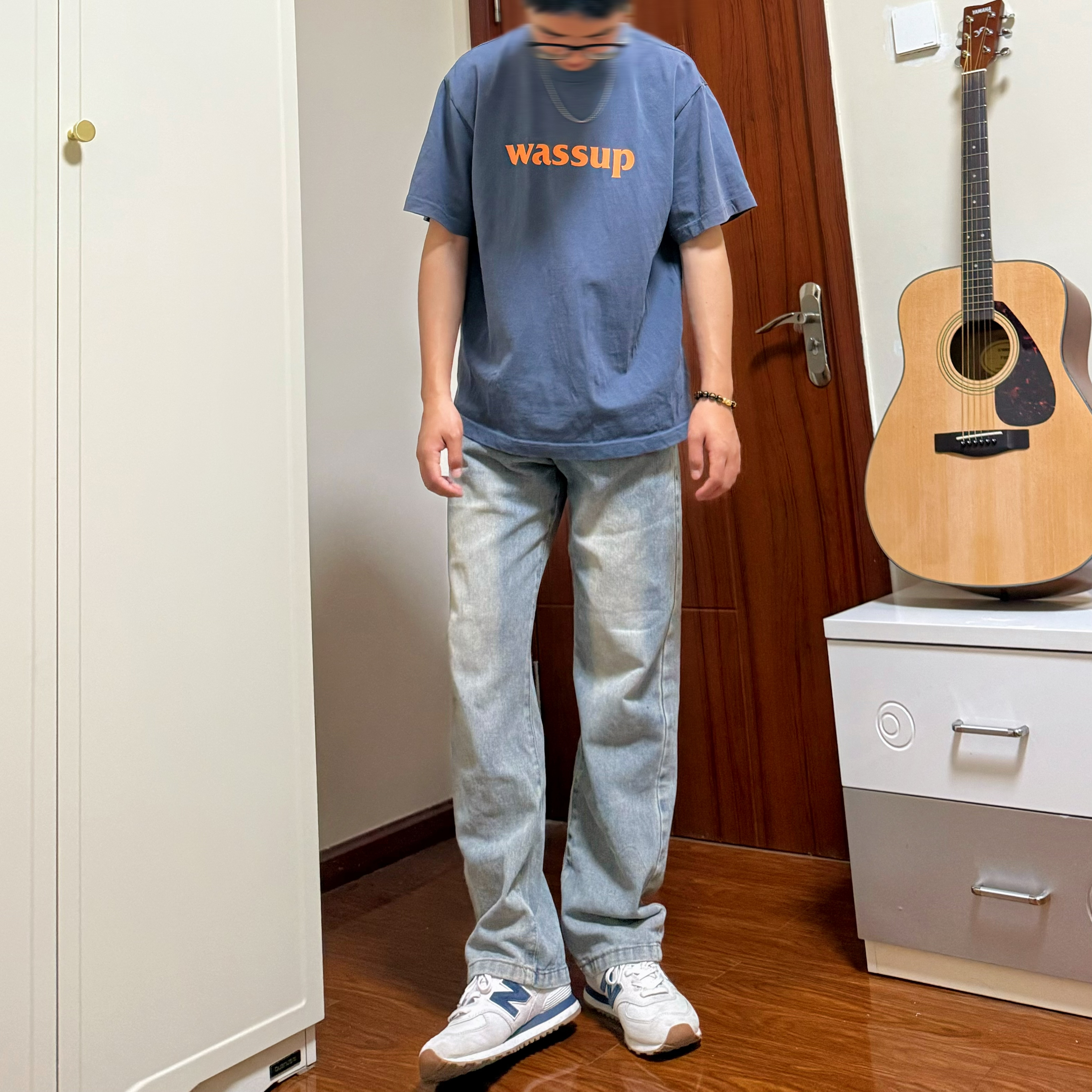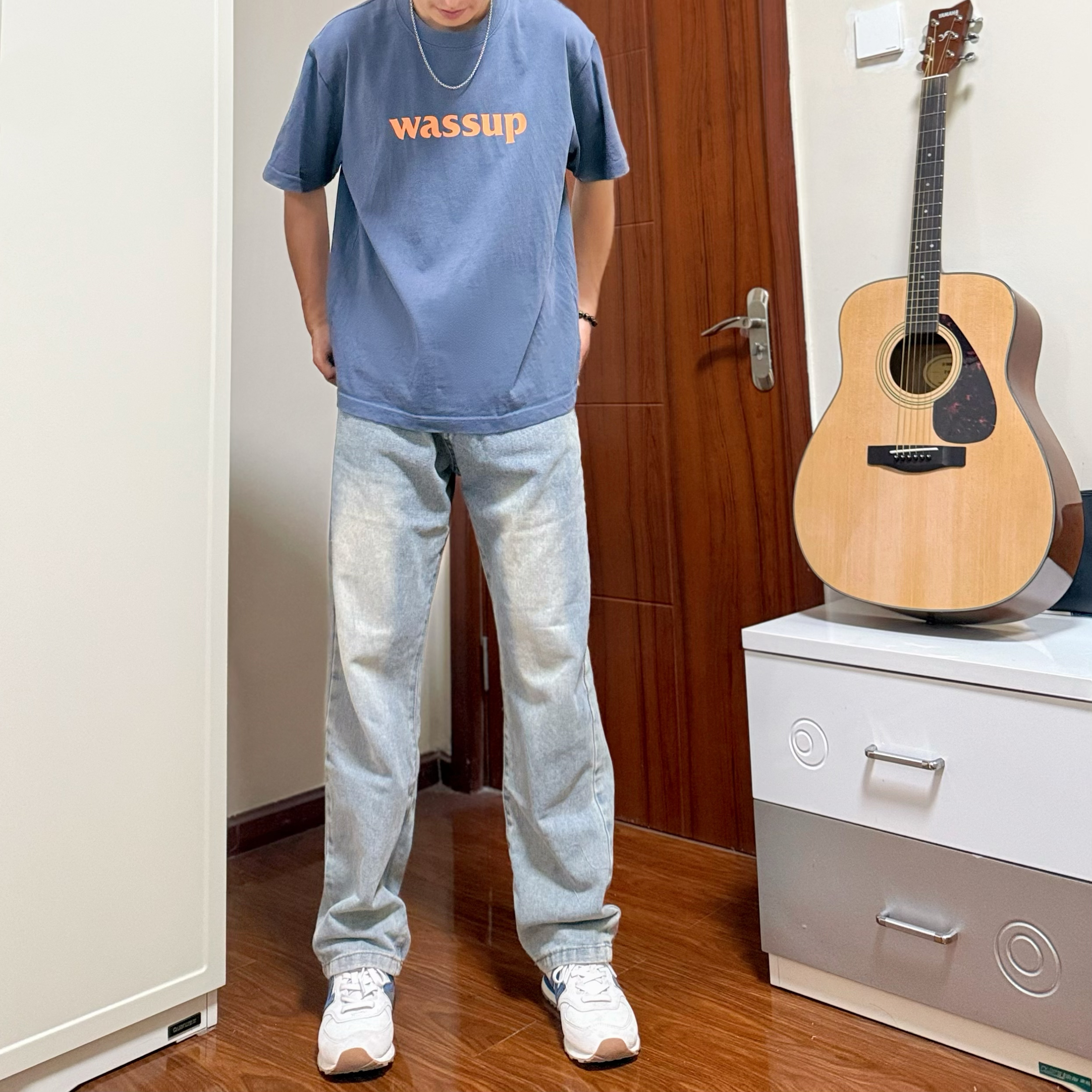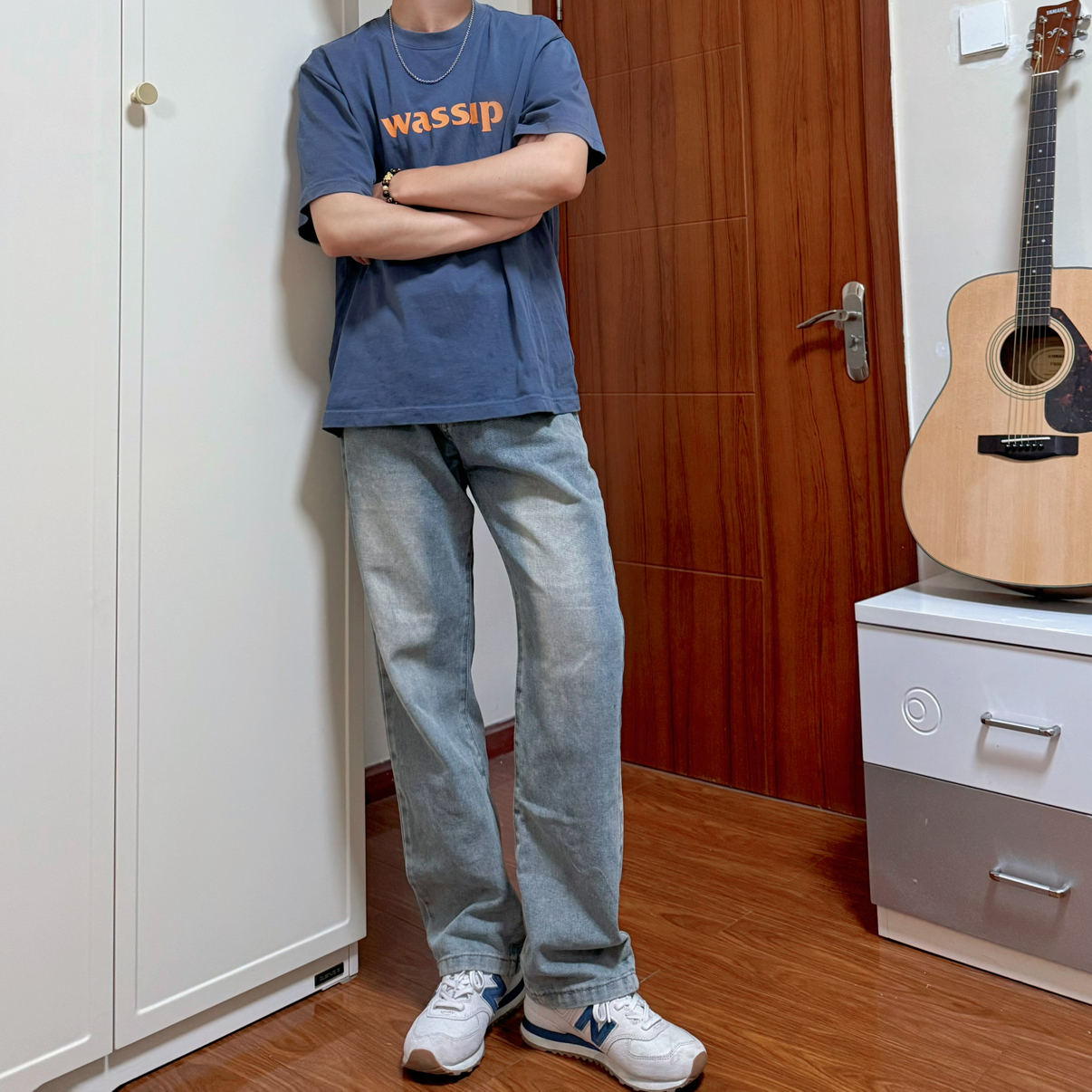 今日风格·𝗼𝗼𝘁𝗱 生活可以随性,穿搭必须有范. 经典的wassup休闲宽松短袖,搭配浅蓝色牛仔裤,休闲感拉满,搭配一双New Balance NB 574 复古百搭运动鞋看着休闲穿着舒服!