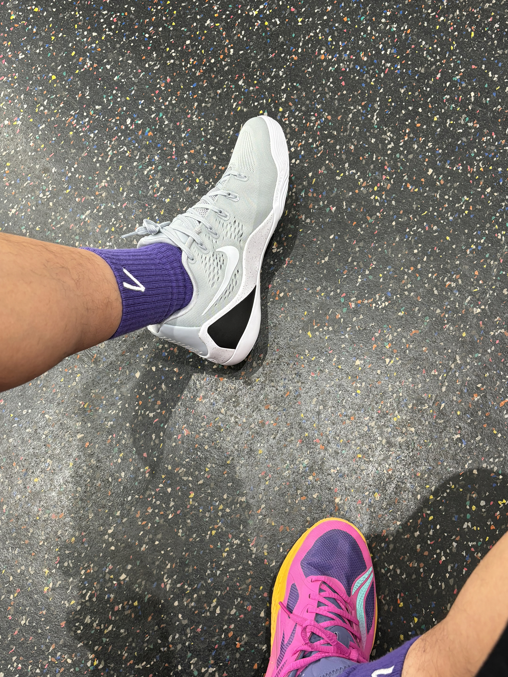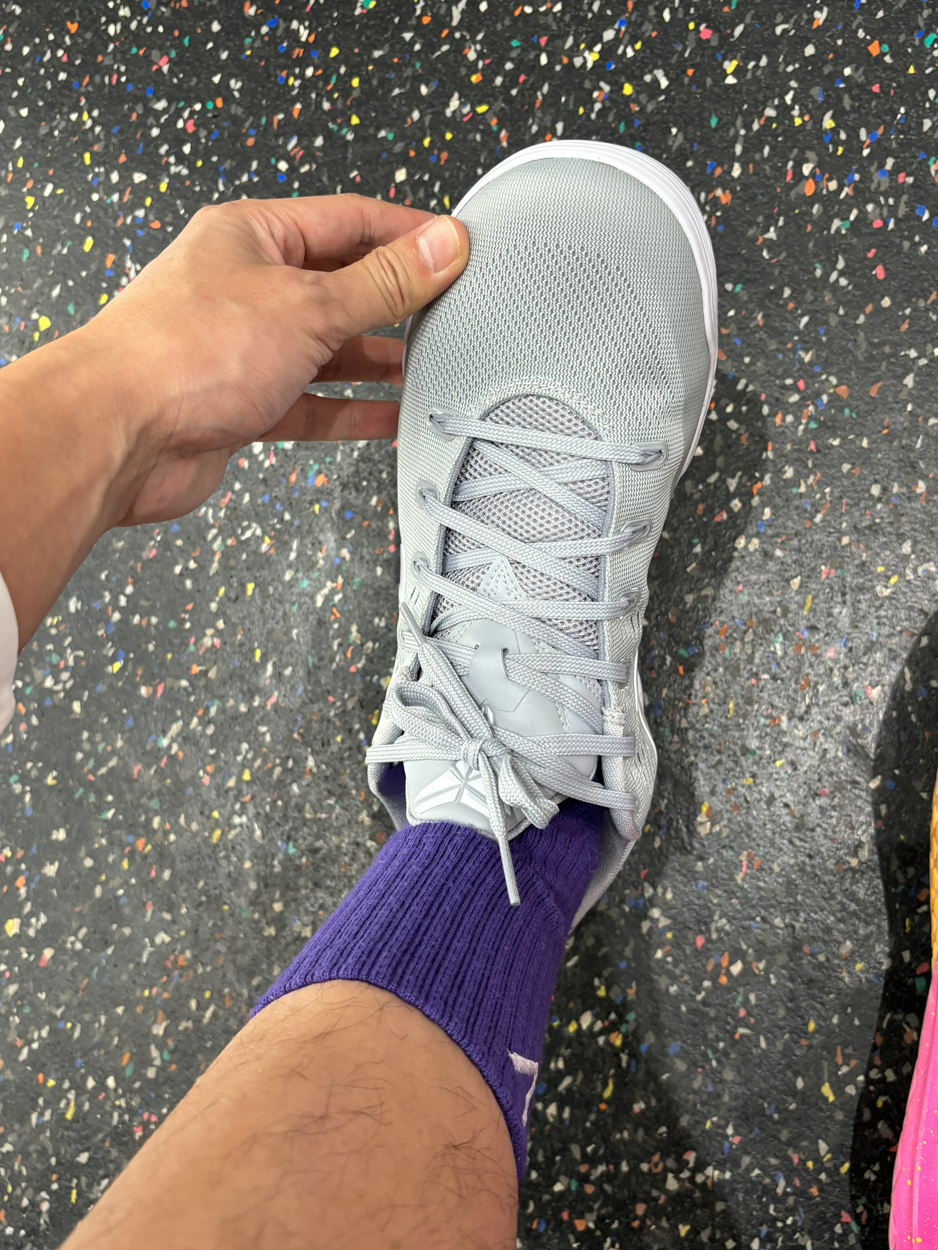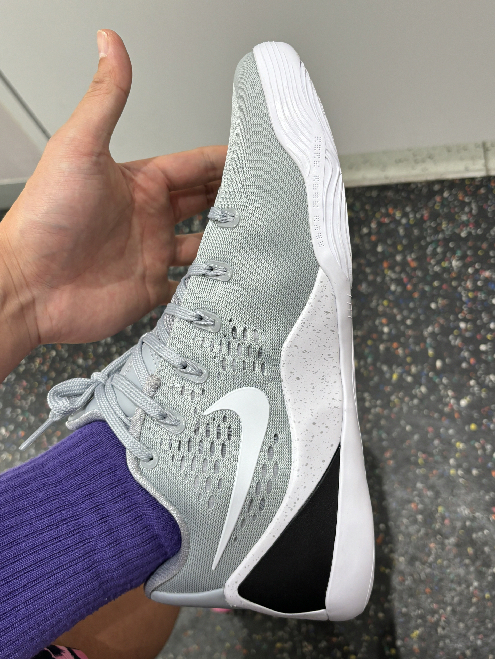 学生党打球穿什么 科比9这个白灰色普通版本我觉得反而更好穿 你们觉得怎么样 我觉得更清便轻质 上脚没什么存在感恨贴地的感觉 后跟包裹也很扎实 配色不扎眼很适合学生党 价格也比科比球鞋便宜多了 我觉得还不错