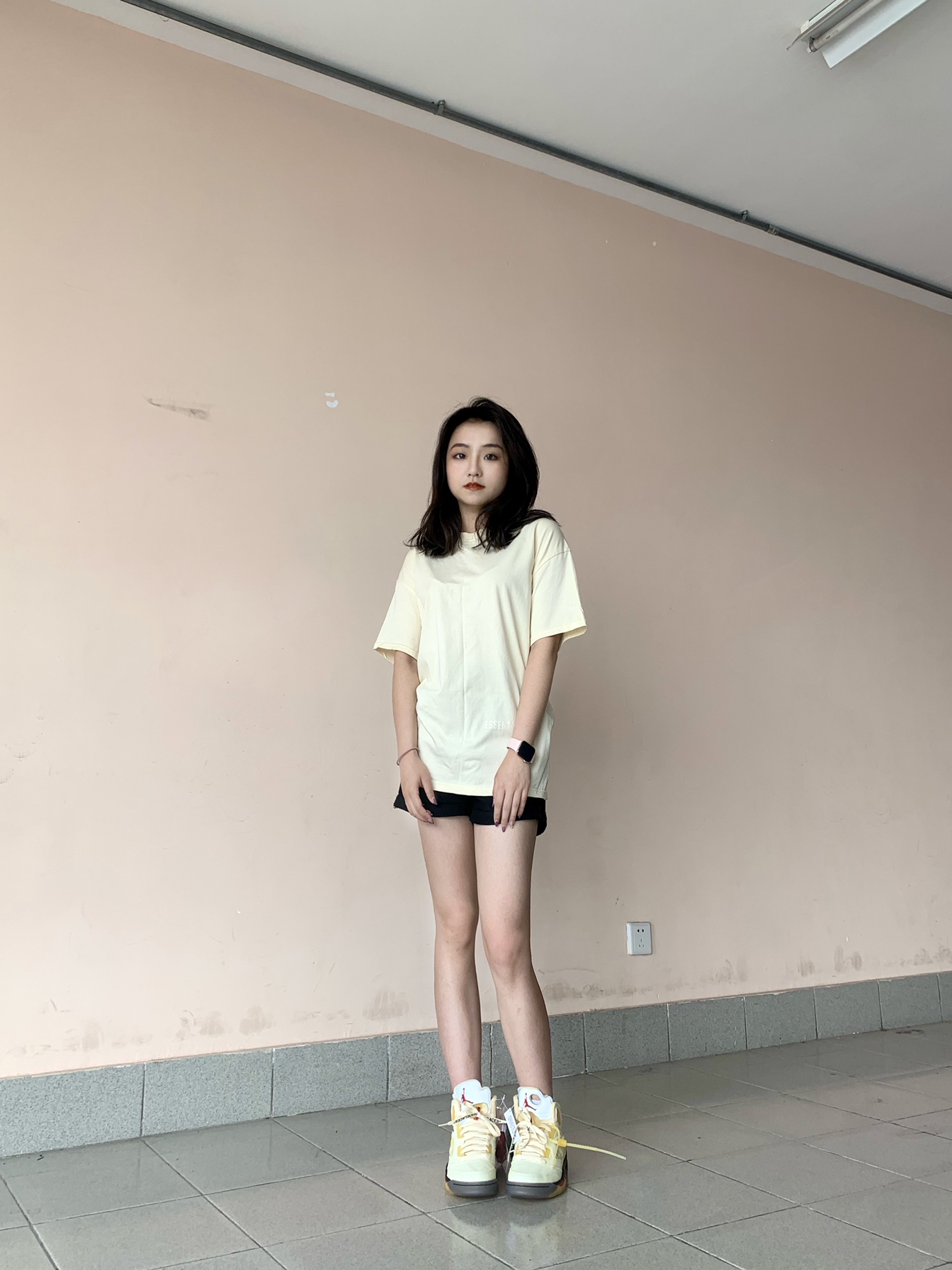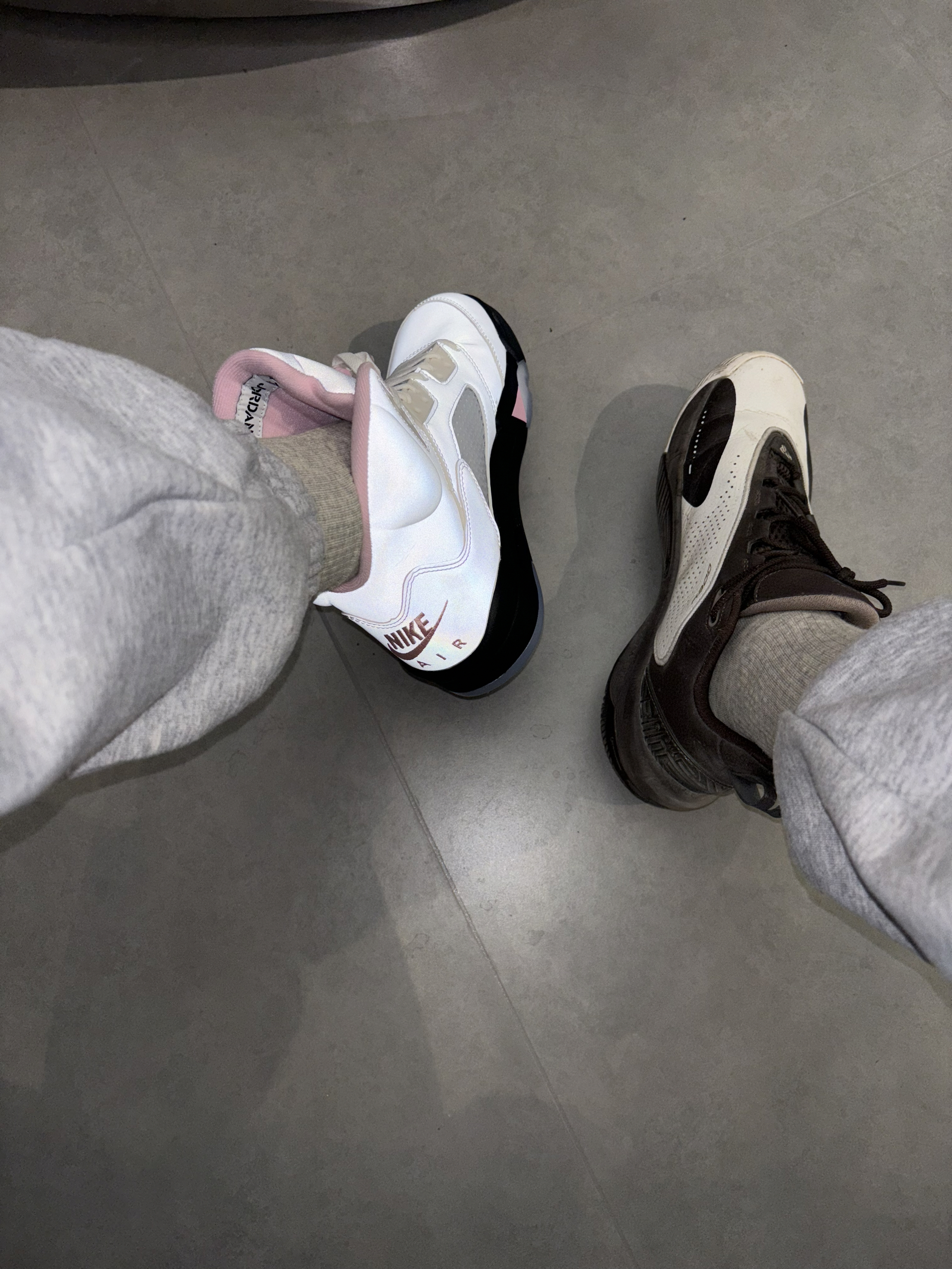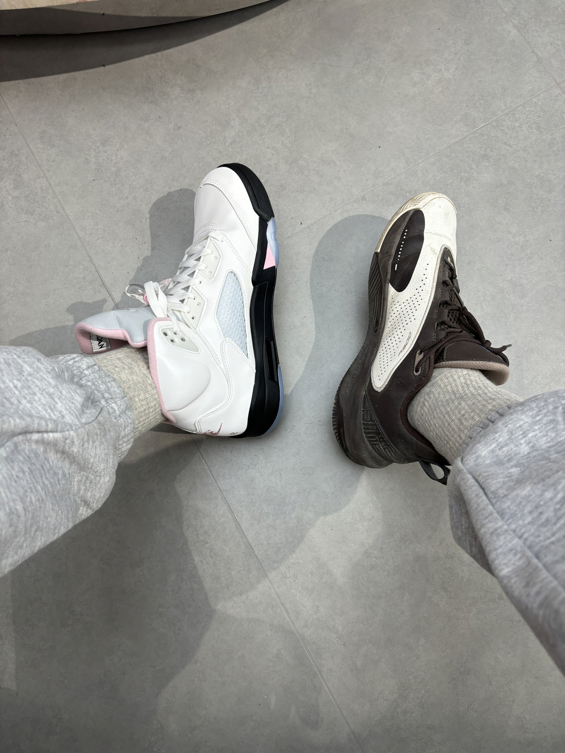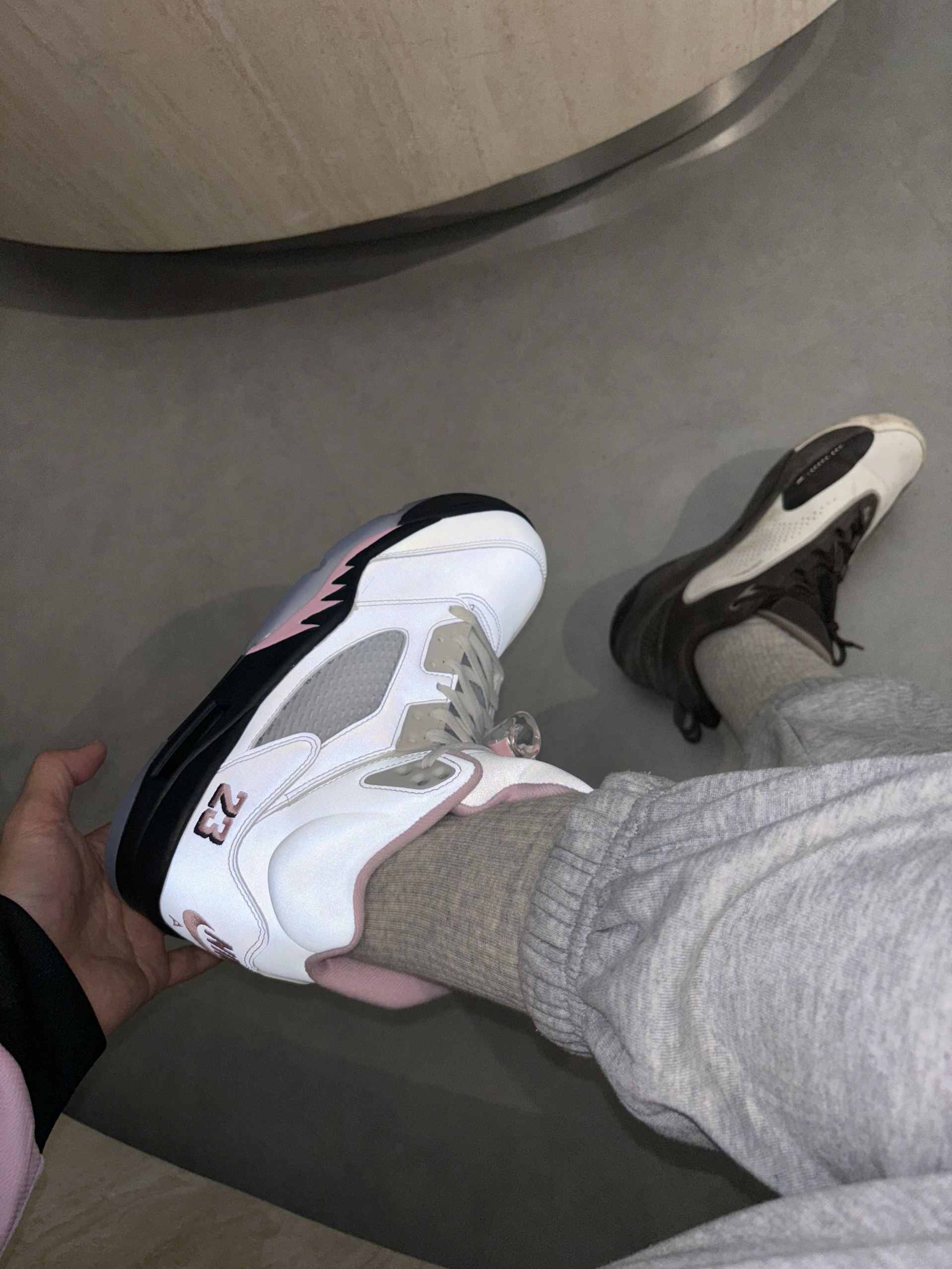 学生党打球穿什么 鞋面材质全都是反光的材质 尤其是鞋舌镭射的3m反光 白粉色的整体确实小帅 打球女生穿的话可能会很甜美 我也想试一下打球这么穿 大家觉得aj5上脚怎么样? 我还是觉得挺舒服比较软的
