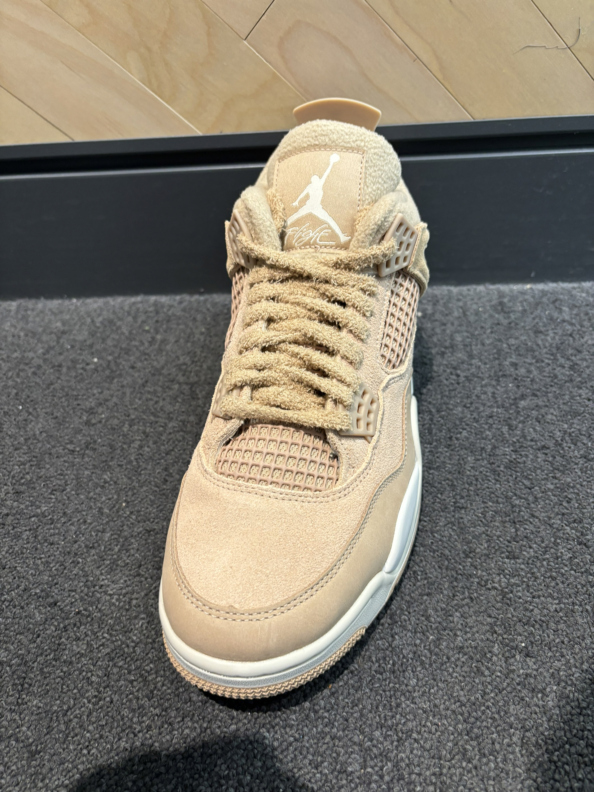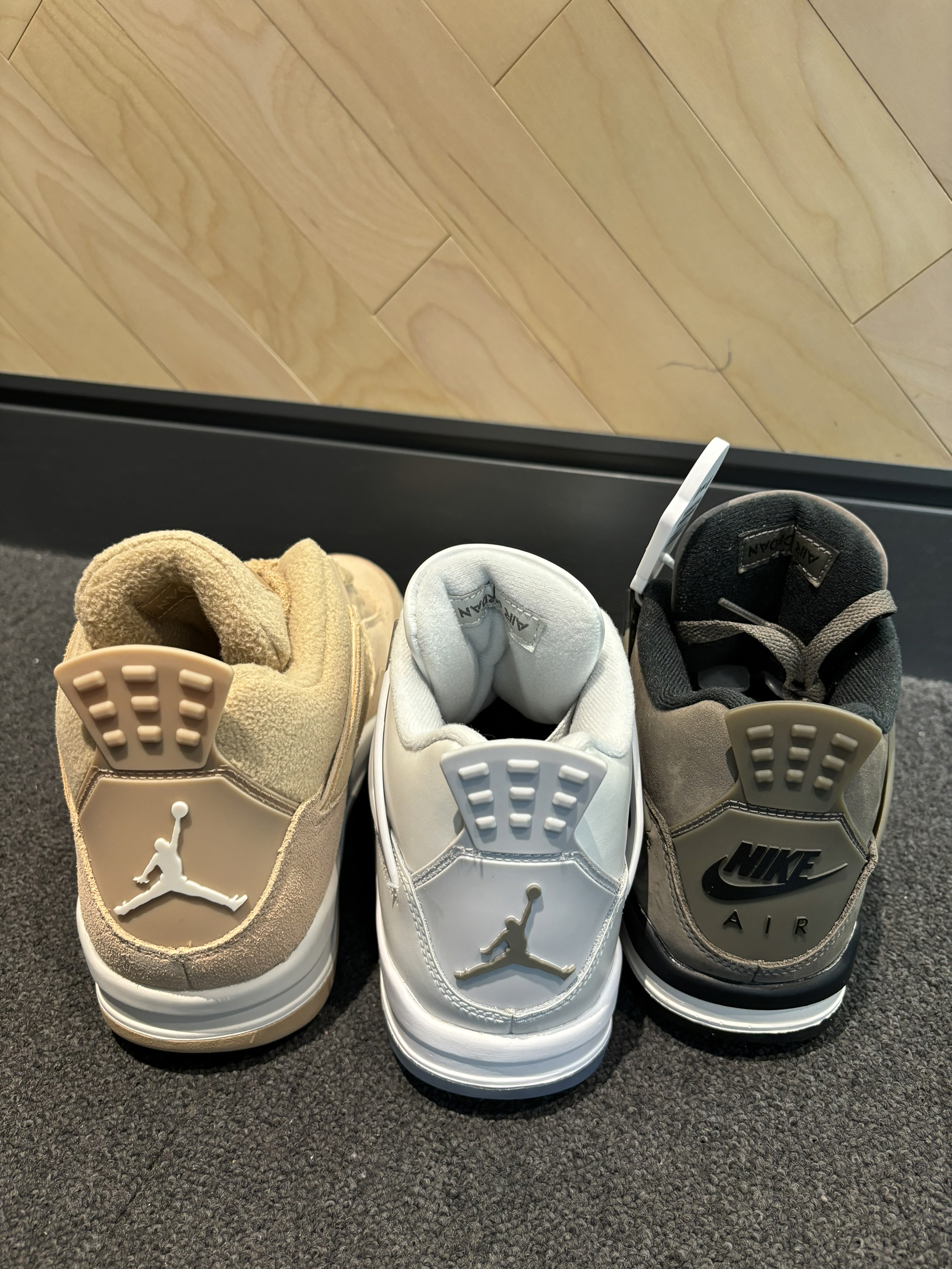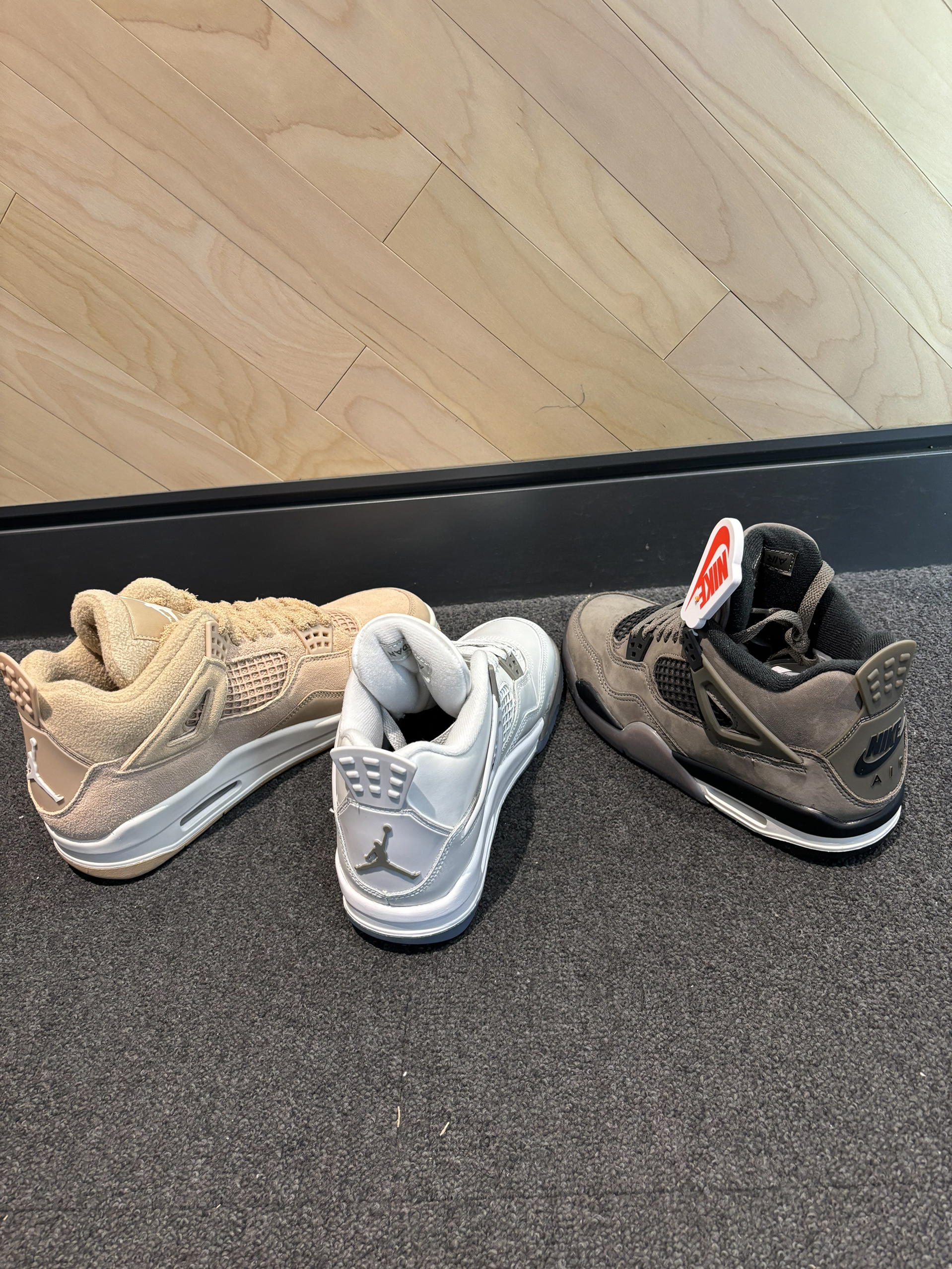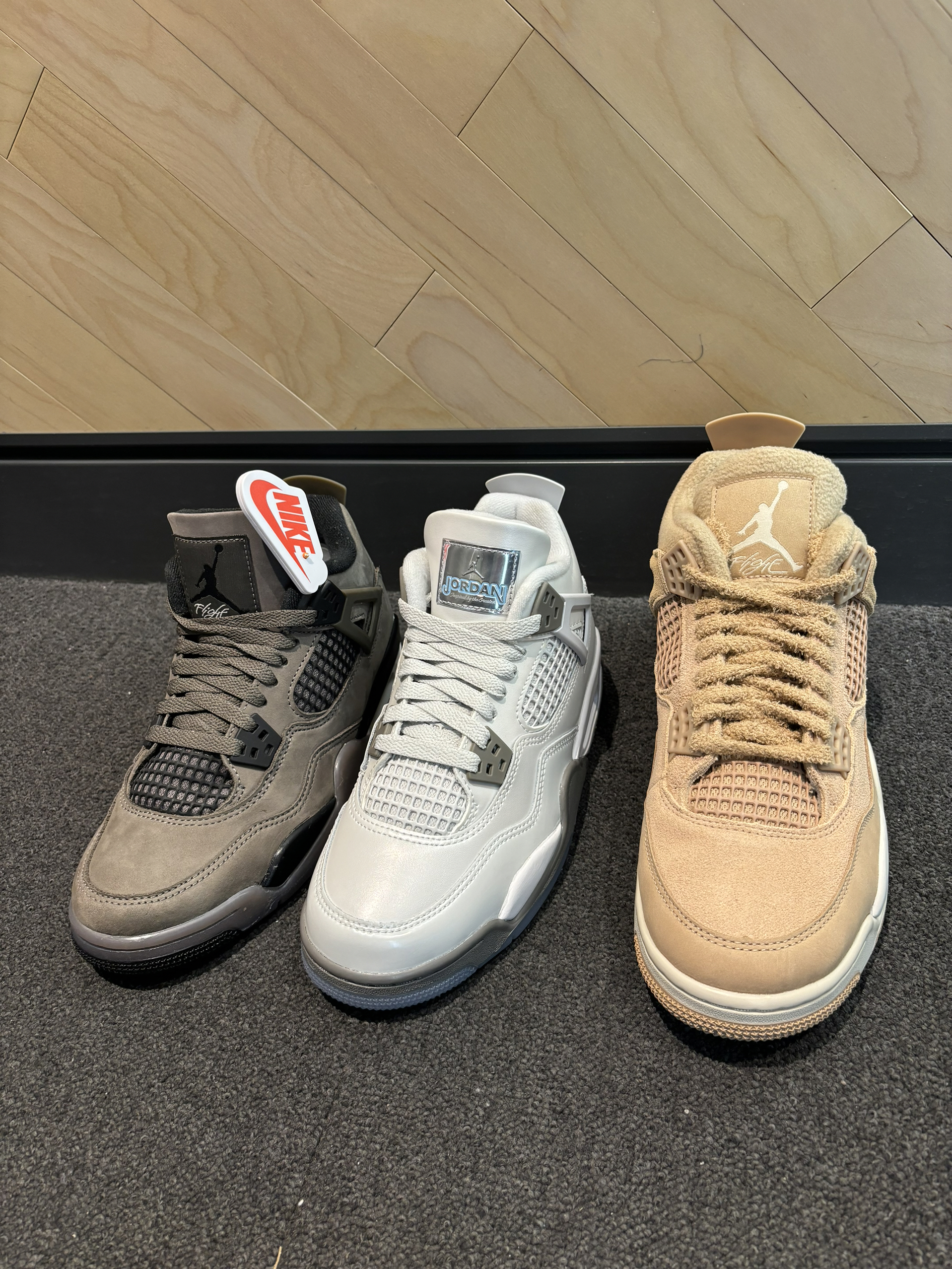 aj4合集你更喜欢哪一双? 我更喜欢摇粒绒的触感太喜欢这种感觉了 就是那种摸起来很像狗毛 倒勾那双aj4刷色感还是很强的 摸起来就很舒服 你觉得怎么样 光面皮的aj4稍微有点硬皮质 鞋舌是缝上去的有jordan镭射的质感