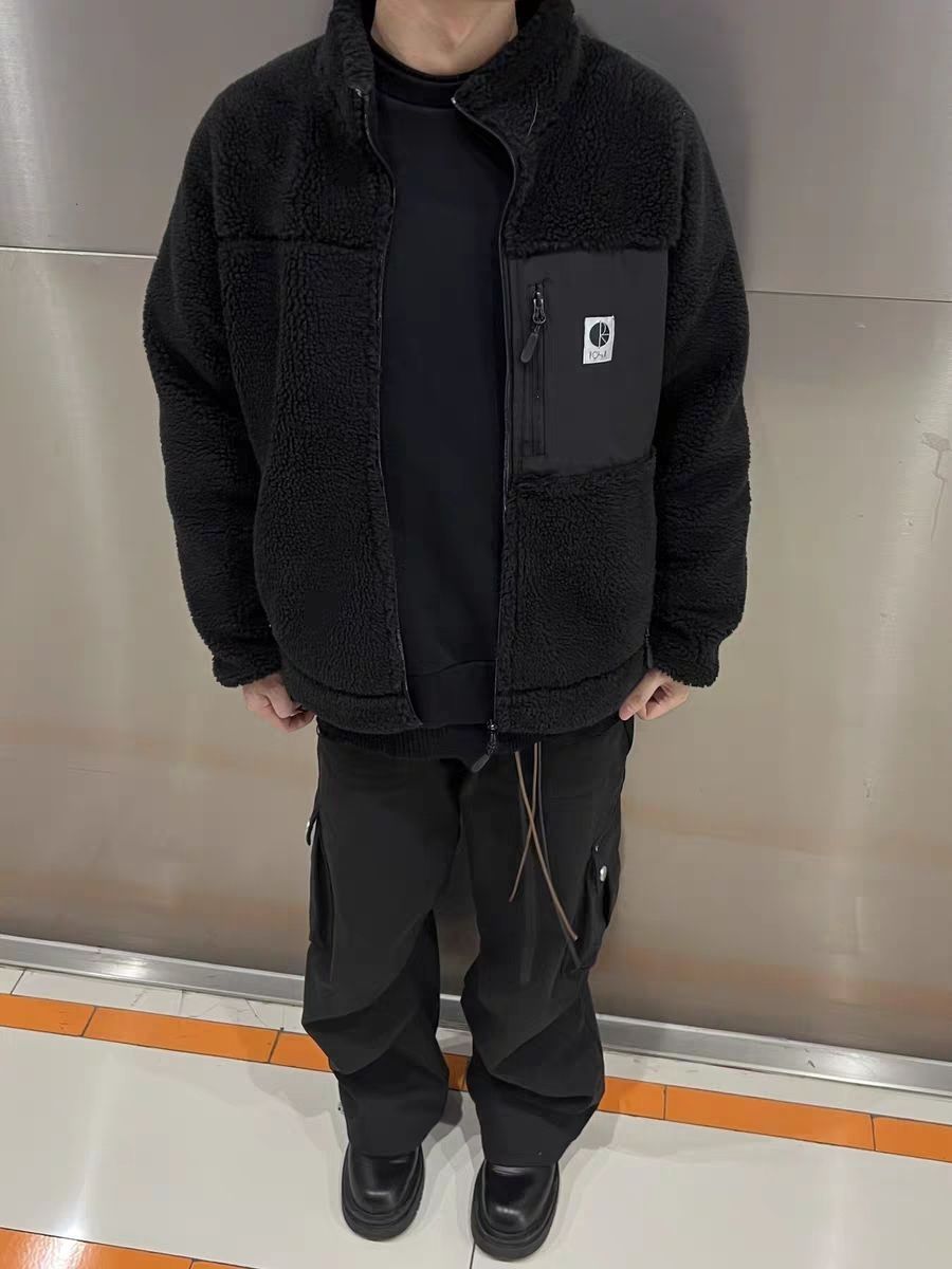 穿这夹克第一觉是暖——仿羊羔绒摸着软乎乎的,贴在身上像裹了层轻绒被,立领刚好护着脖子,出门不用额外围东西。拼色口袋那处是利落的硬料,衬得整体不臃肿,全黑调看着特干净,随便搭条裤子都显帅气。 它不沉,穿一天肩膀也没压感,风大的时候裹紧拉链,身子一直是温的。双十一刚好能入,冬天缺件舒服又出片的外套,这个算是踩中了心坎,我直接加购了件。