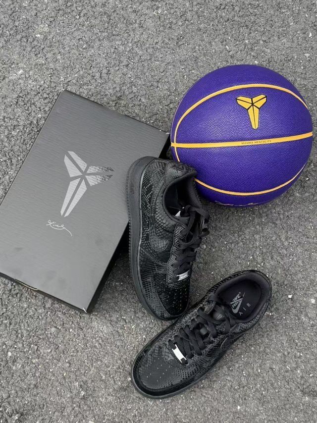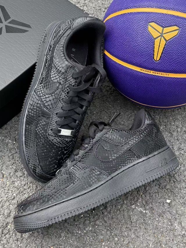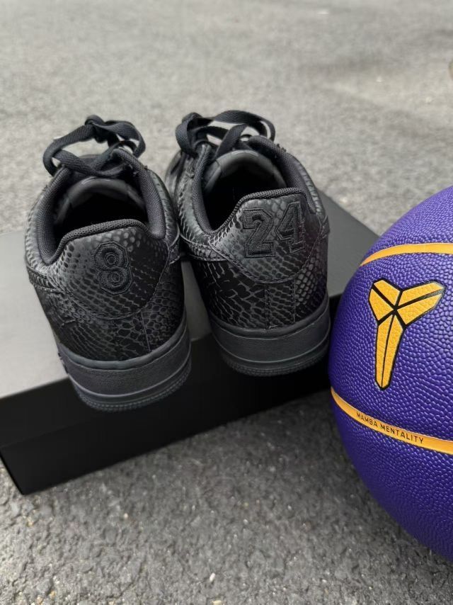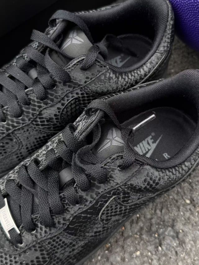 科比空军来了 致敬传奇 标志性元素:最吸睛的就是替换了传统Swoosh的蛇鳞纹理压纹,摸上去有清晰的凹凸感,质感远超普通皮面。后跟的数字“8”与“24”刺绣,是对传奇最直接的致敬。 核心配色: 整体是沉稳的黑色主调,搭配金色的鞋带扣和内衬,营造出高级的黑金奢华感,不张扬却很有分量。