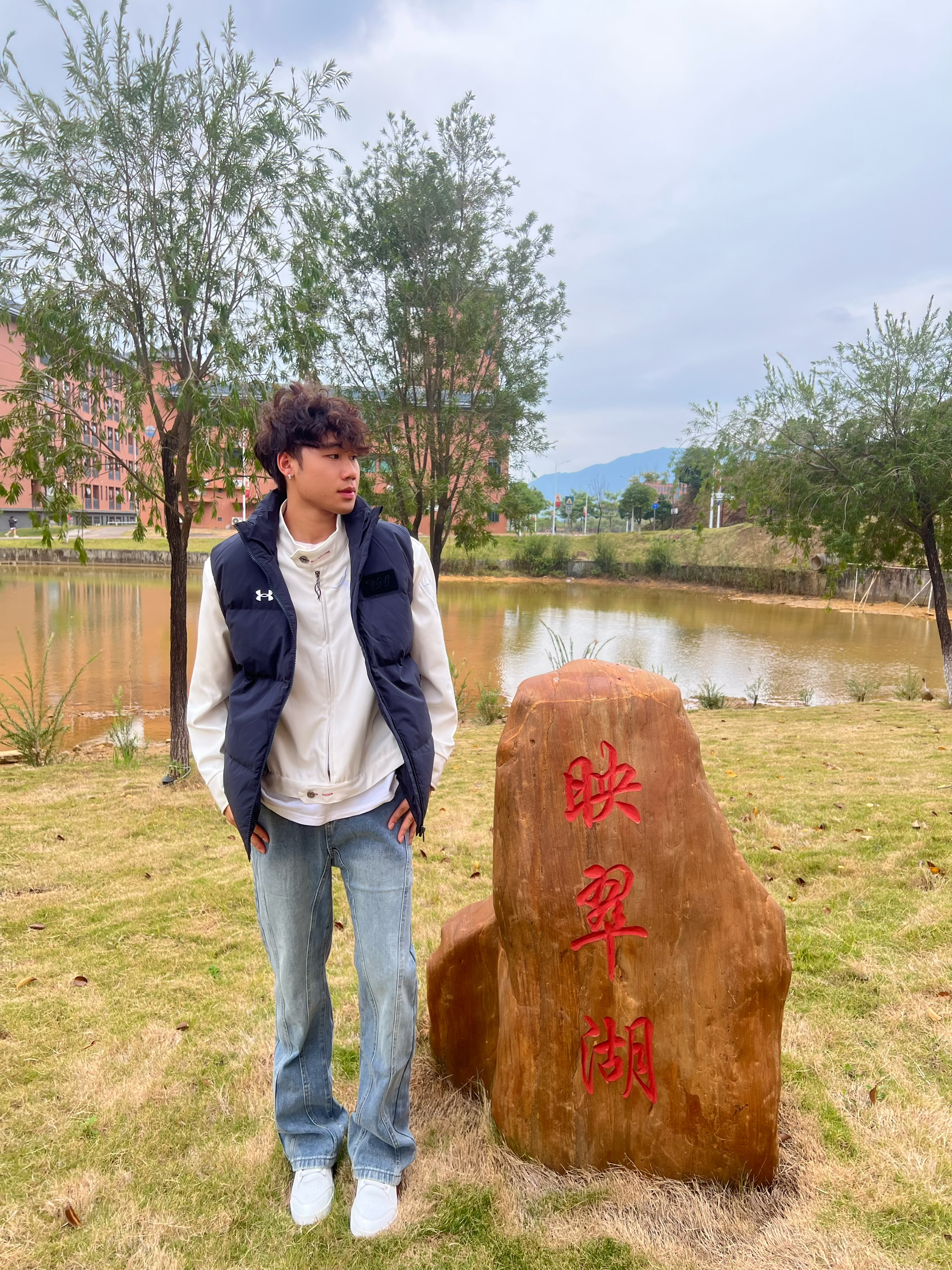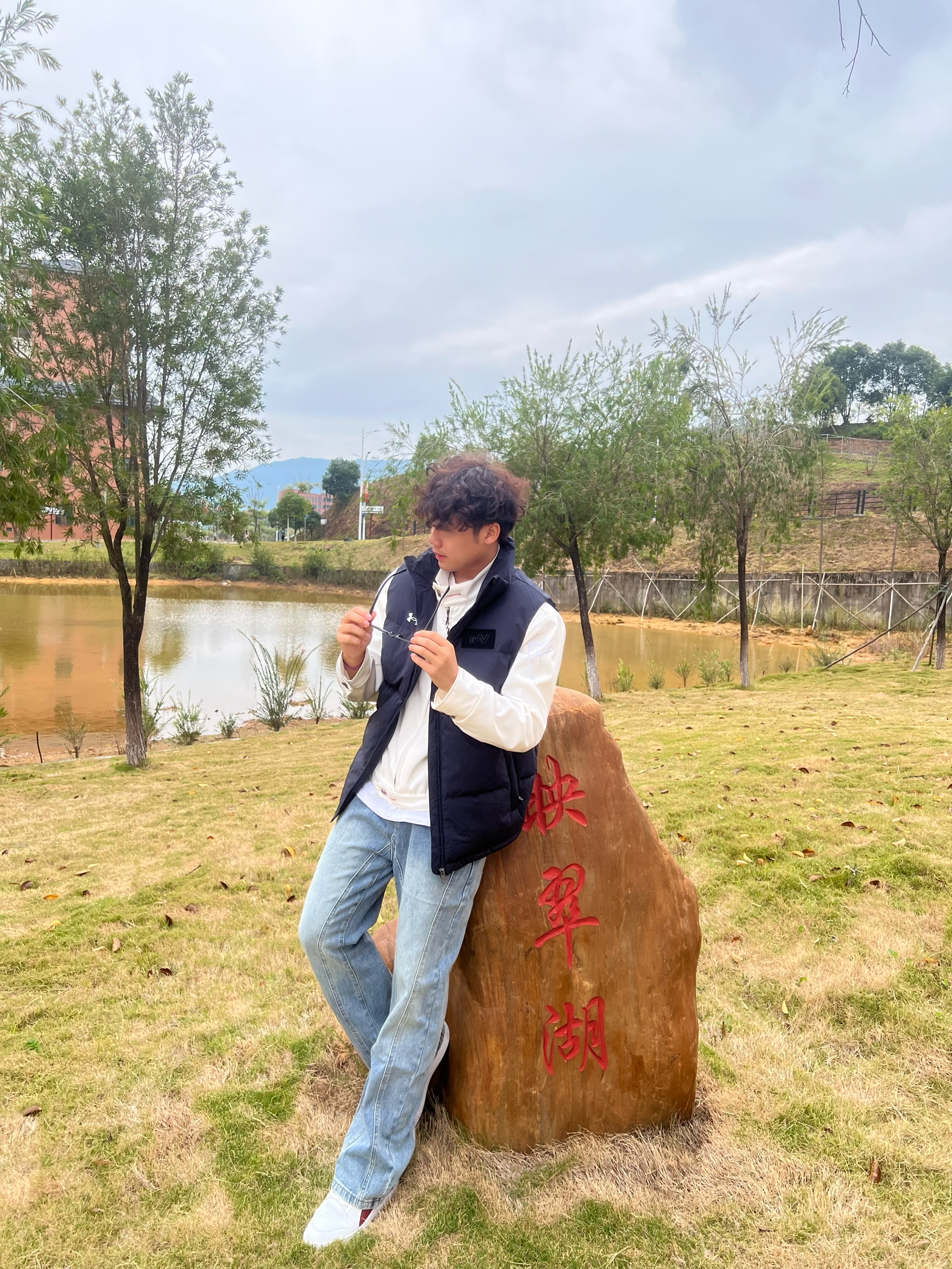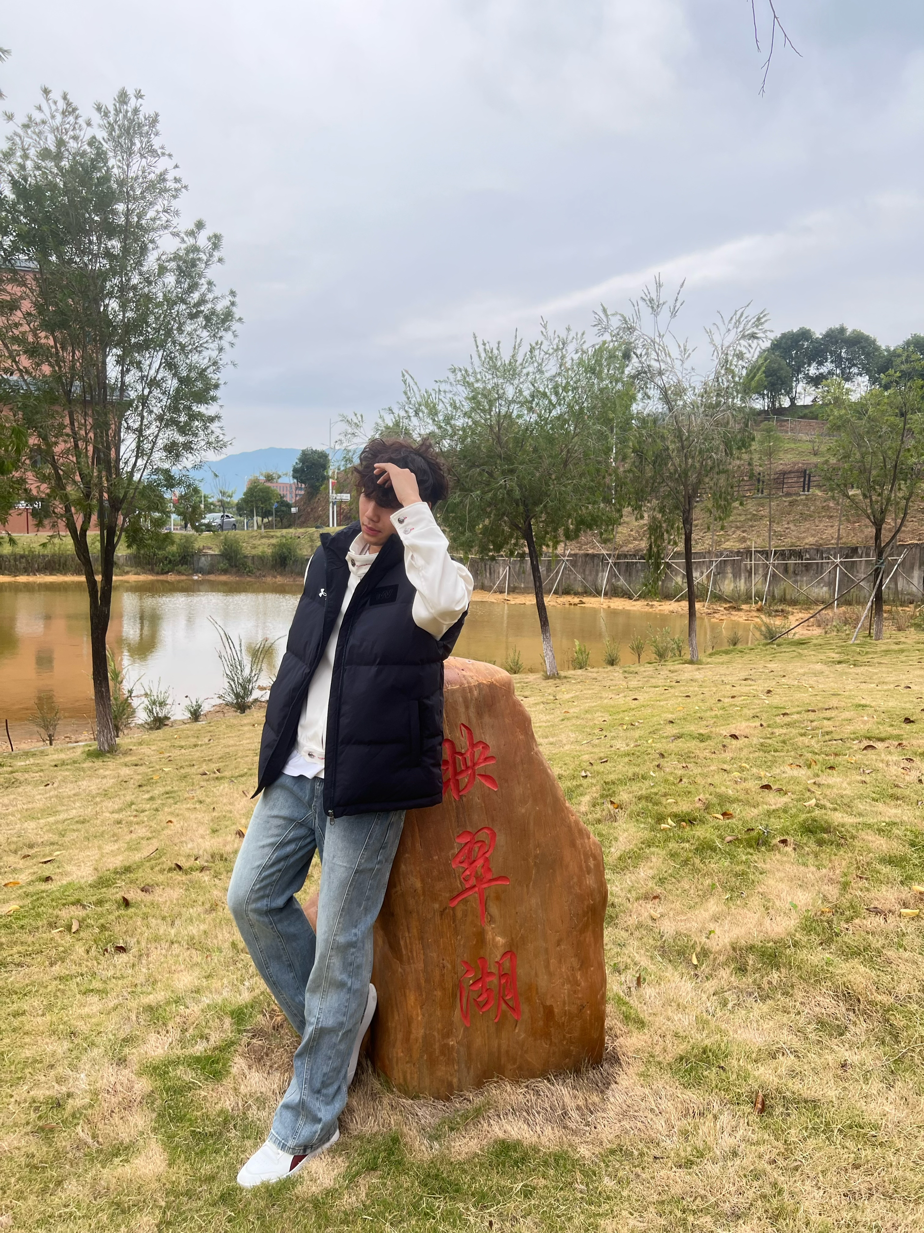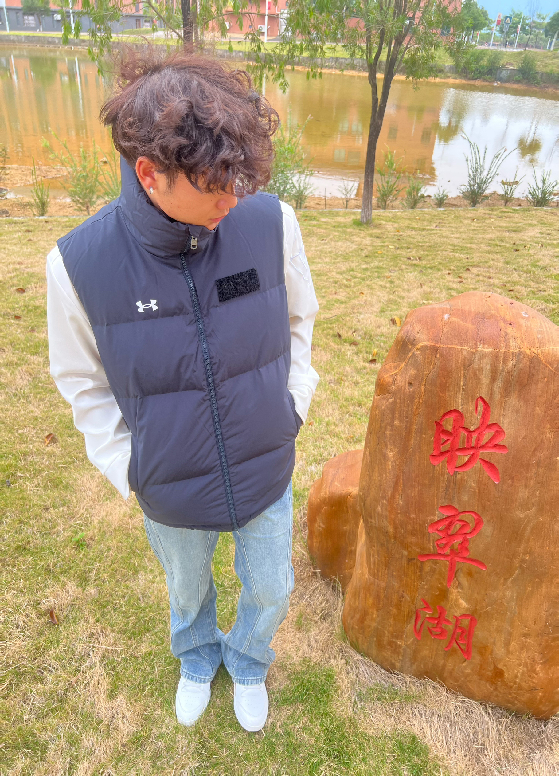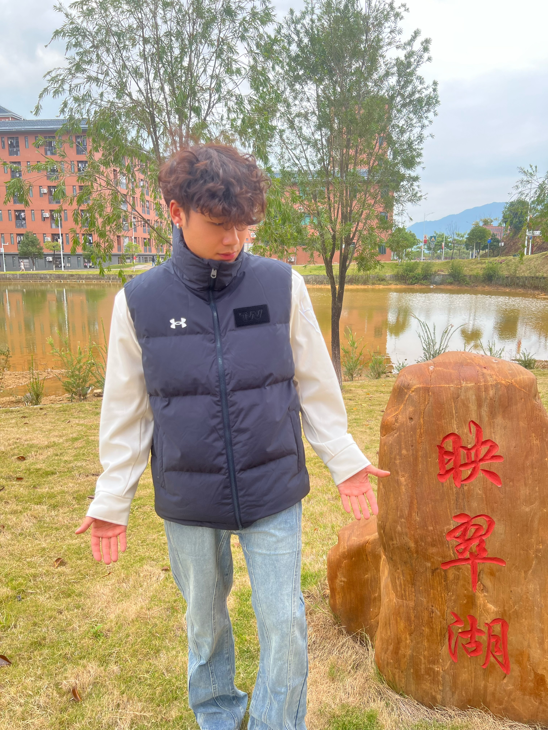 今天穿这藏青马甲出门逛校园湖,摸着是那种轻软的压纹面料,捏一下蓬蓬的但不鼓得像面包,贴身穿不硌,风一吹也没“哗啦哗啦”的塑料感,还挺贴身。 搭白长袖+浅牛子,颜色沉得稳当,胸口小标不扎眼,配湖边的石头和树,瞅着还挺干净利落——不咋出挑,但就是舒服又顺眼,属于不用费劲儿搭的“日常好穿款”。
