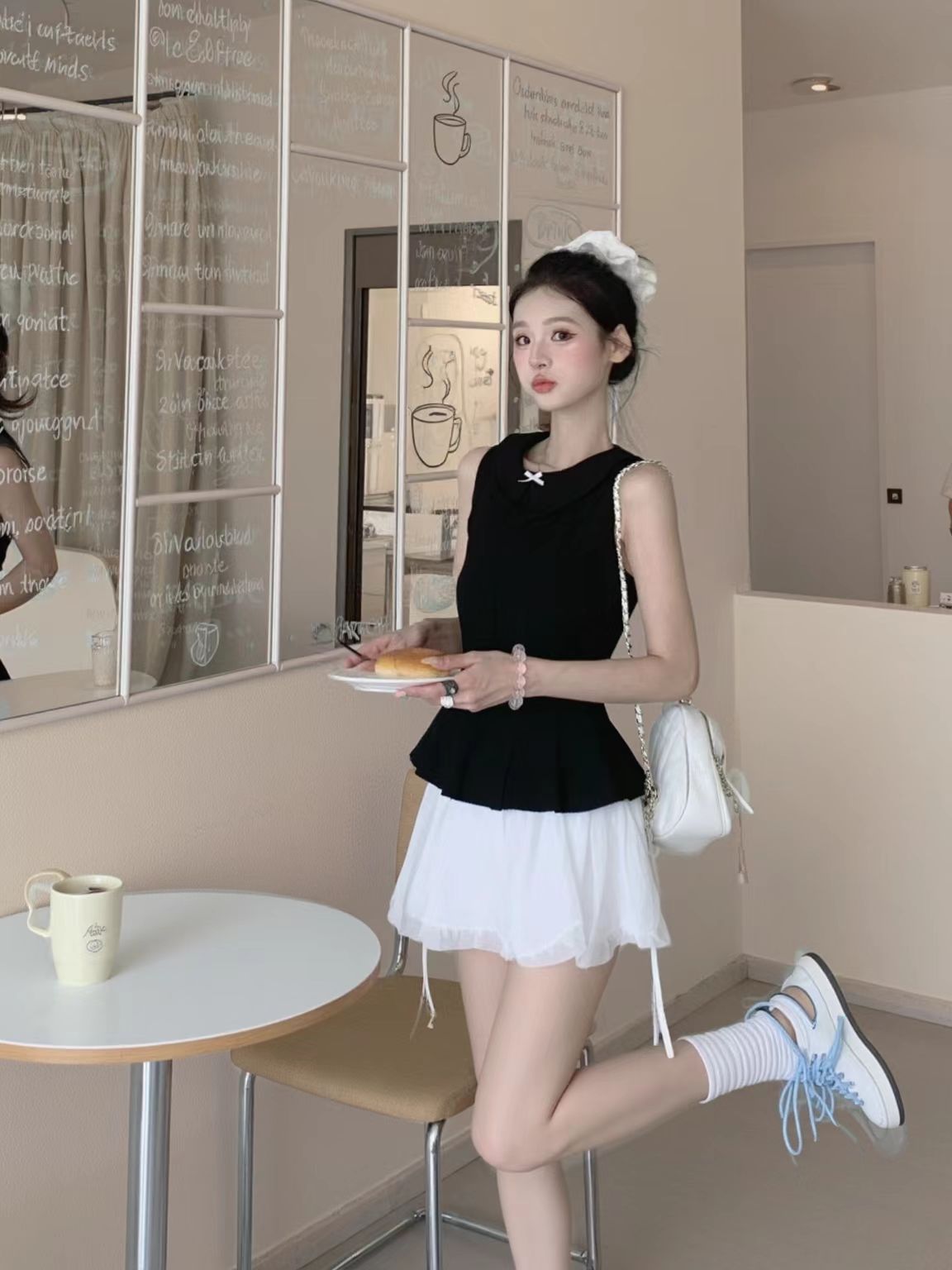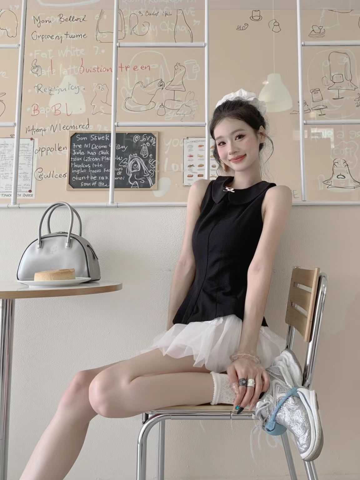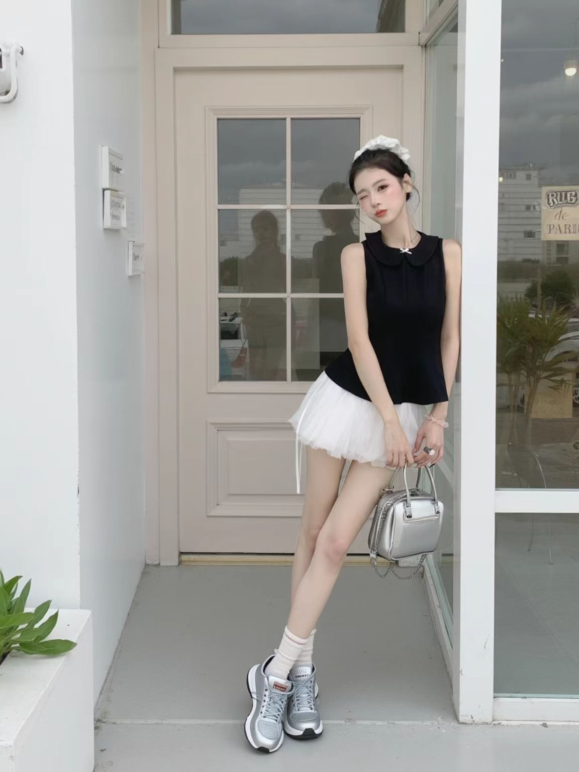 谁还没试过甜辣风混搭我都会伤心的OK?! 黑色娃娃领无袖上衣自带娇俏感,收腰设计还特显身材;白色蓬蓬裙一穿,少女感直接拉满~ 重点是鞋子的搭配!不管是银灰色老爹鞋还是带点设计感的厚底鞋,都能把“甜”和“辣”平衡得刚刚好,日常出街或逛咖啡店都超吸睛! 这套穿搭公式我先锁了,姐妹们快抄作业,今夏一起做甜辣氛围感美女~