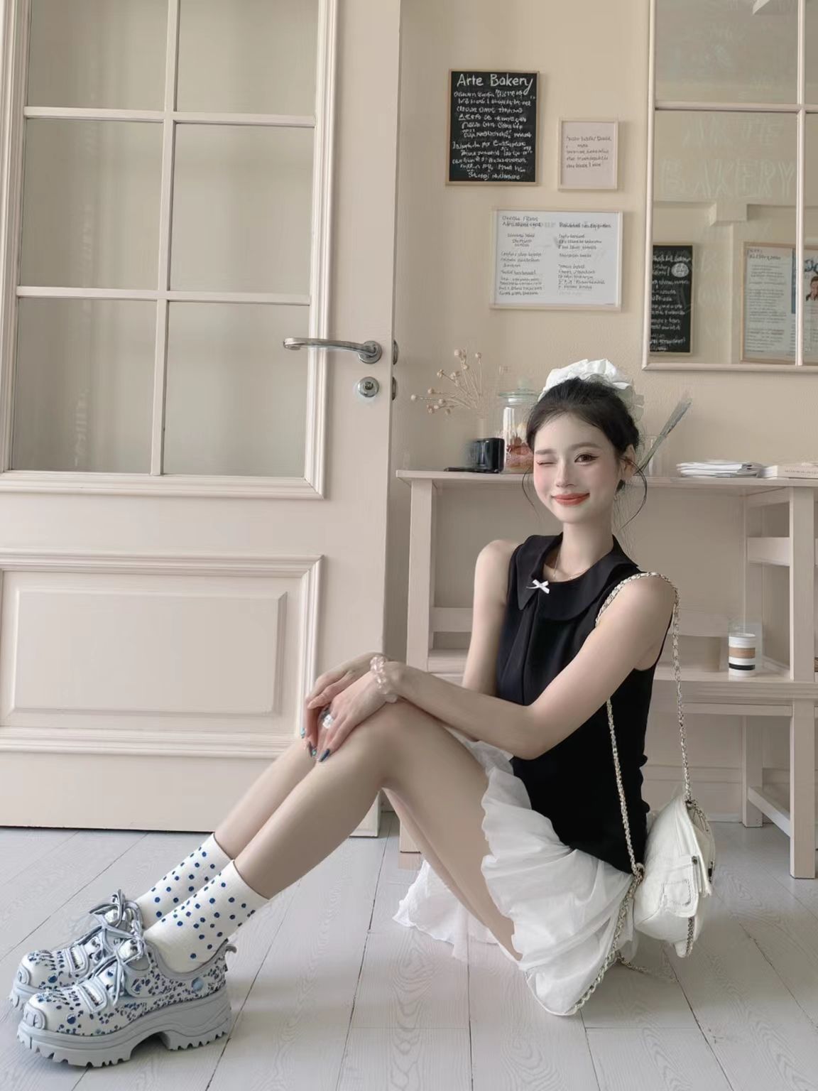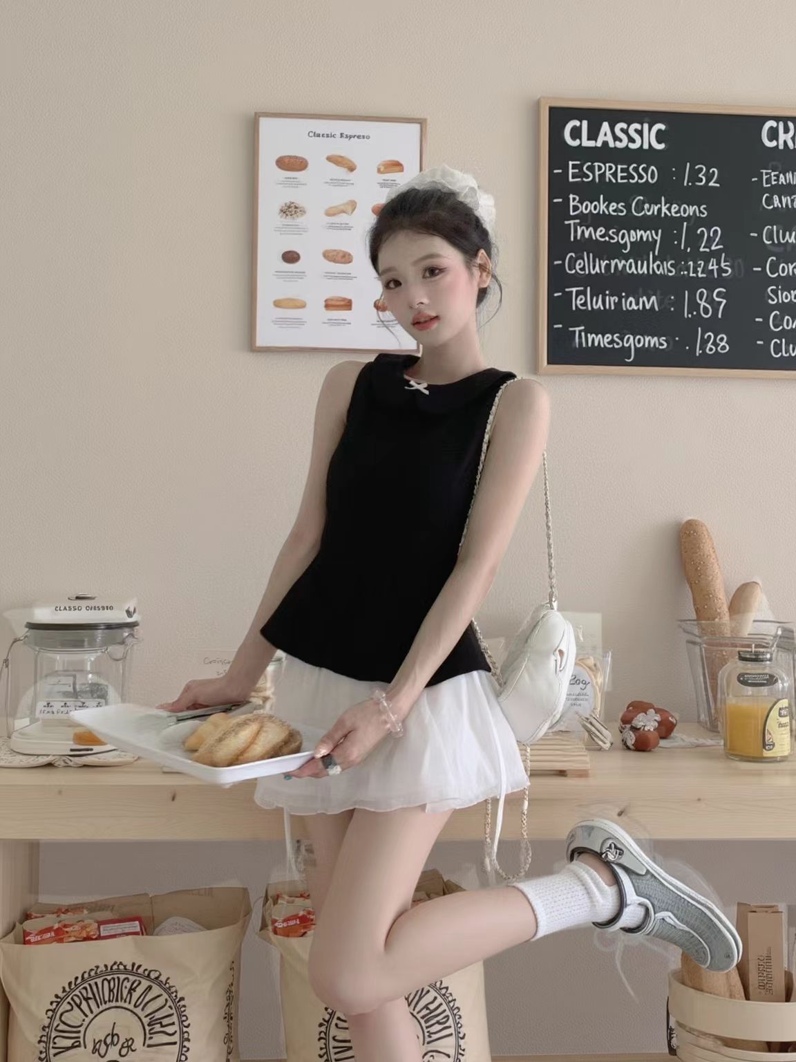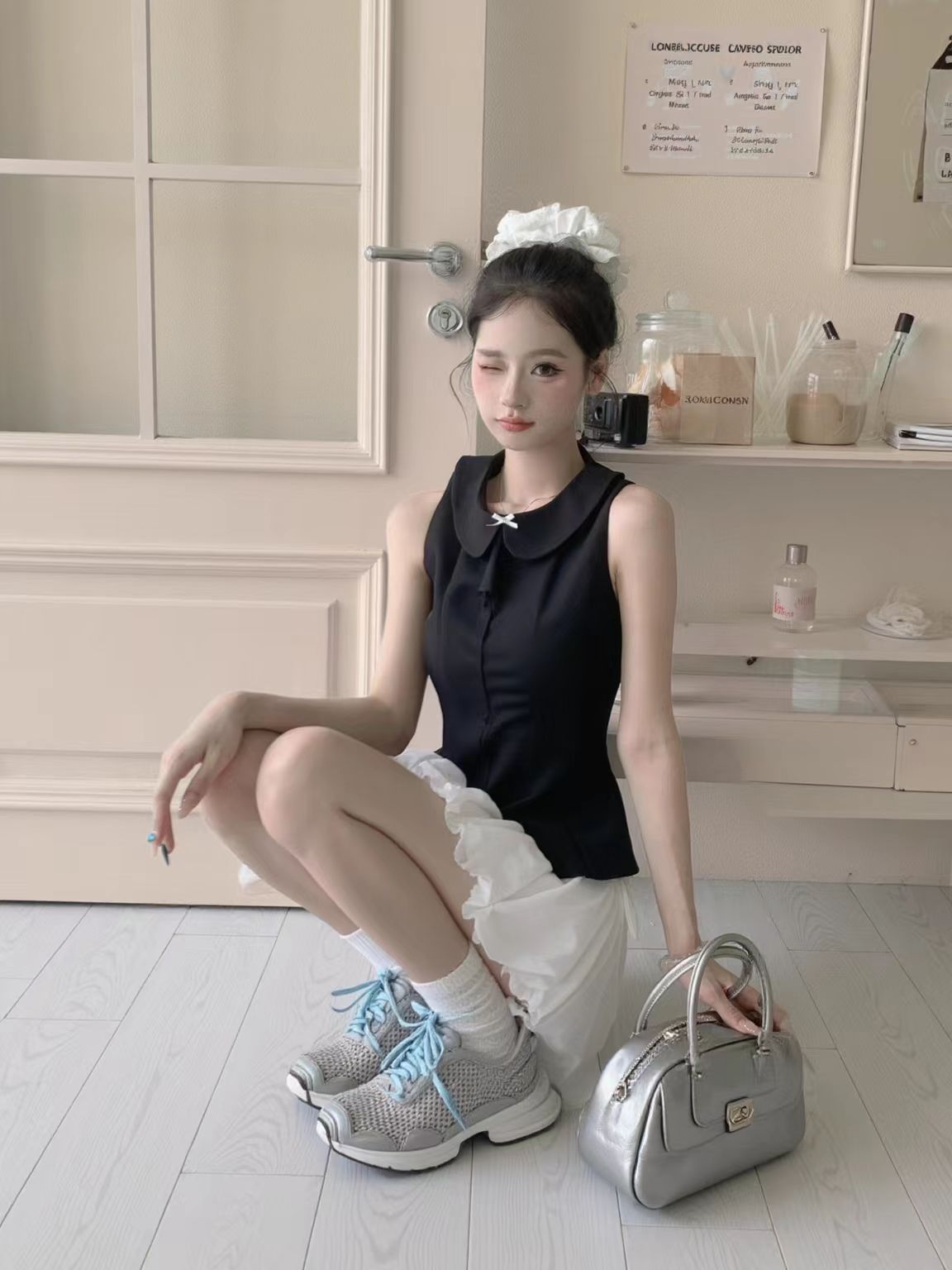 谁还没试过甜辣风混搭我都会伤心的OK?! 黑色娃娃领无袖上衣自带娇俏感,收腰设计还特显身材;白色蓬蓬裙一穿,少女感直接拉满~ 重点是鞋子的搭配!不管是银灰色老爹鞋还是带点设计感的厚底鞋,都能把“甜”和“辣”平衡得刚刚好,日常出街或逛咖啡店都超吸睛! 这套穿搭公式我先锁了,姐妹们快抄作业,今夏一起做甜辣氛围感美女~